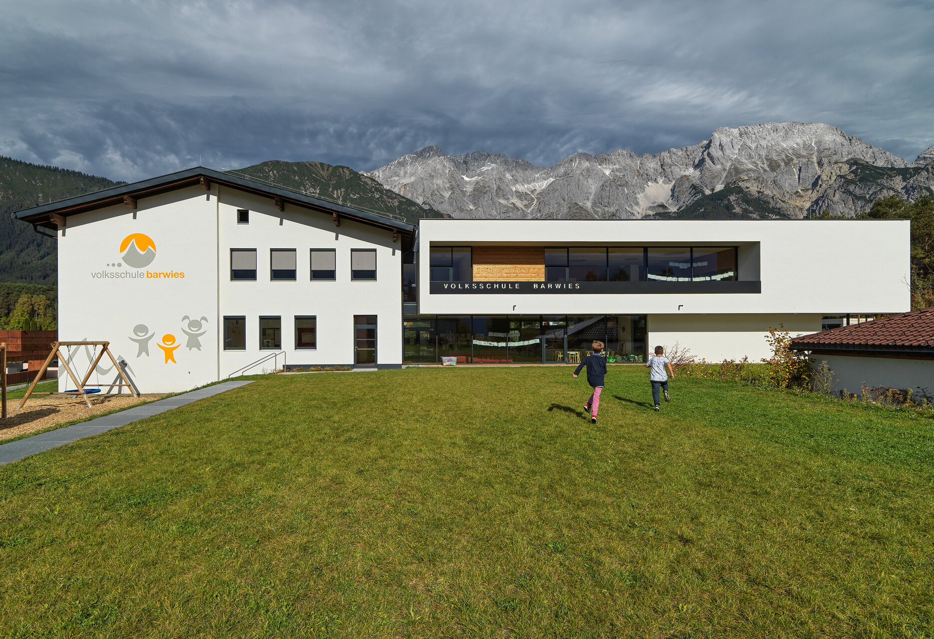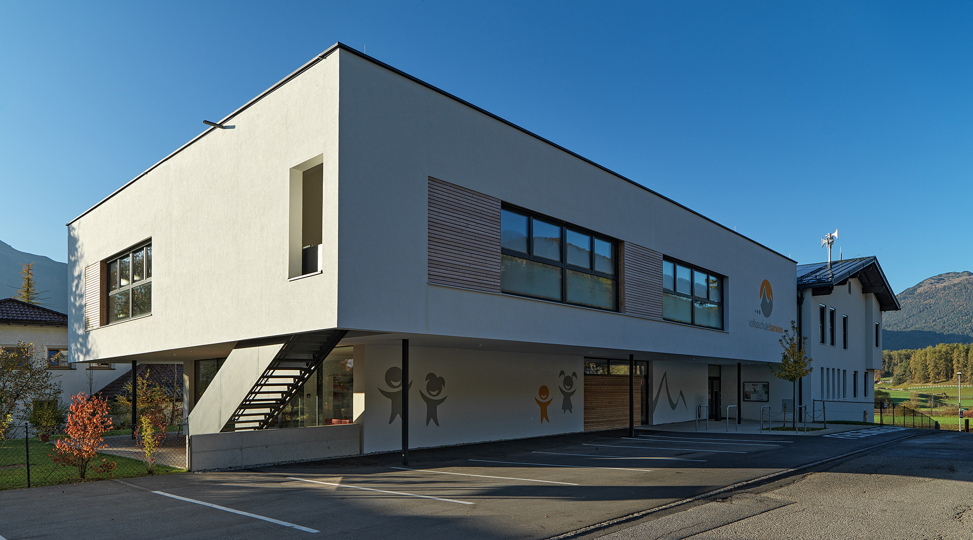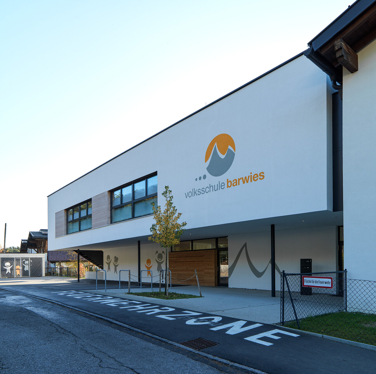 Mit dem zwischen Alt und Neu situierten Haupteingang konnte im Norden eine eindeutige Zugangssituation geschaffen werden. Entlang des Rollerweges und des Föhrenweges führt ein neuer Gehsteig bis zum überdachten Eingangsbereich des Schulgebäudes. Die Aula, die auch als Lernlandschaft genutzt werden kann, Nachmittagsbetreuung und Bibliothek sind im Erdgeschoß der Erweiterung situiert, Verwaltung und Zentralgarderobe im funktionell bereinigten Bestand. Über den neuen Erschließungskern mit Lift und Stiegenhaus gelangt man in das Obergeschoß, in dem um einen zentral liegenden Gruppenraum zwei „Lerncluster“ aus jeweils drei Klassen und einer Lernlandschaft im Bestand bzw. in der Erweiterung untergebracht sind. Der in Massivbauweise ausgeführte Zubau kragt im Obergeschoß dreiseitig aus, womit auf der Erdgeschoßebene witterungsgeschützte Freiflächen geschaffen werden konnten. Die Turnhalle im Untergeschoß ist ebenfalls an den neuen Erschließungskern angebunden und wird weiterhin über Lichtschächte mit Tageslicht versorgt. Anstelle des abgetragenen Kindergartenzubaus befindet sich nun am Dach der Turnhalle eine große Außenfläche, die – ausgestattet mit Spielgeräten, Hochbeeten und Sportflächen – von den Kindern als Spiel-, Freizeit- und Lernbereich genutzt werden kann. (Text: Claudia Wedekind, nach einem Text der Architekt:innen)