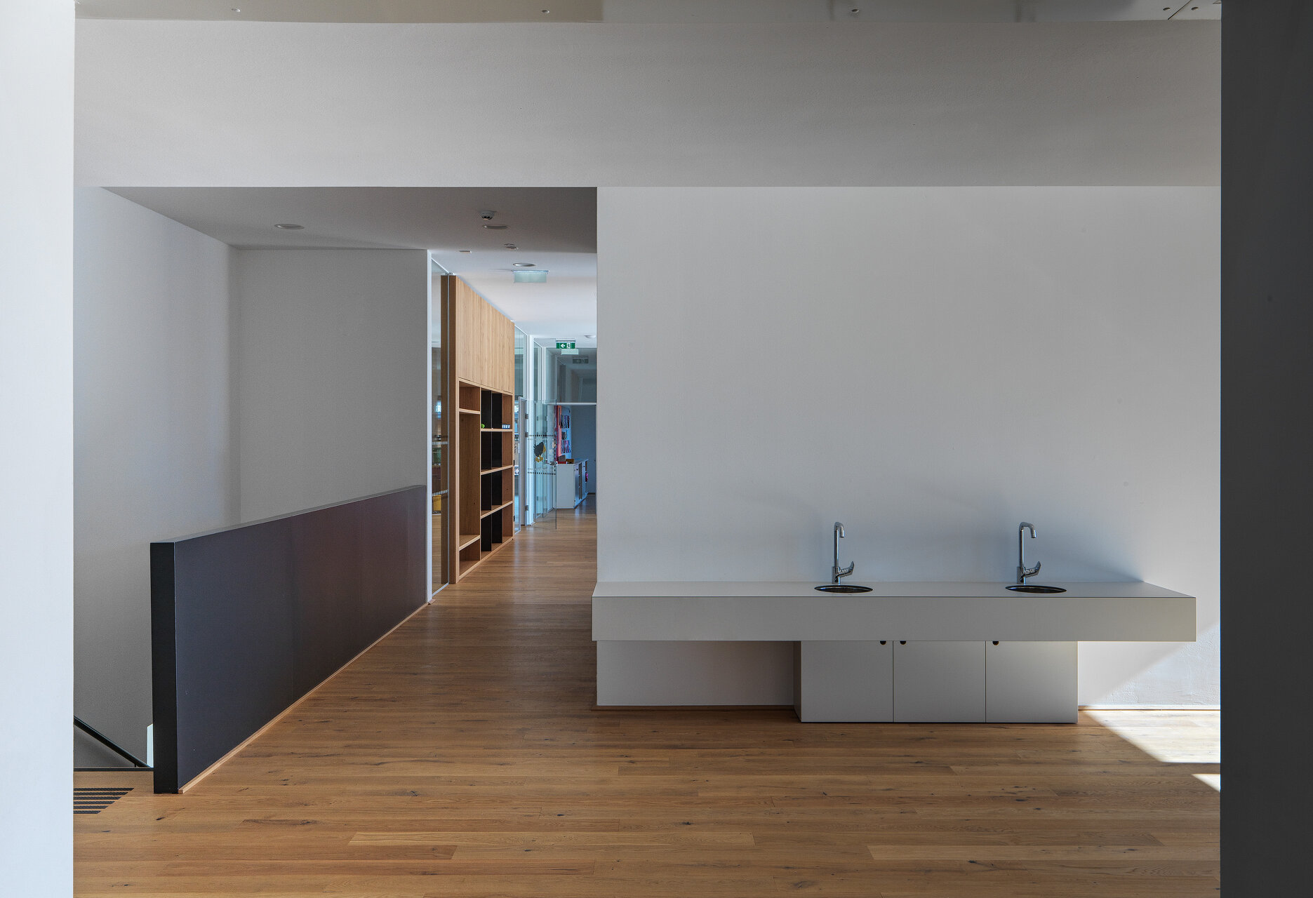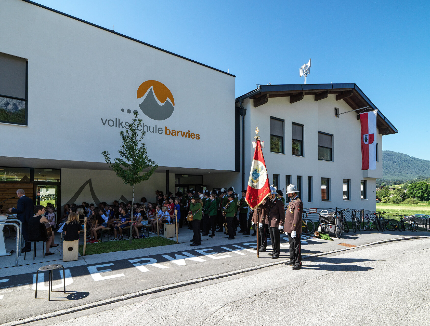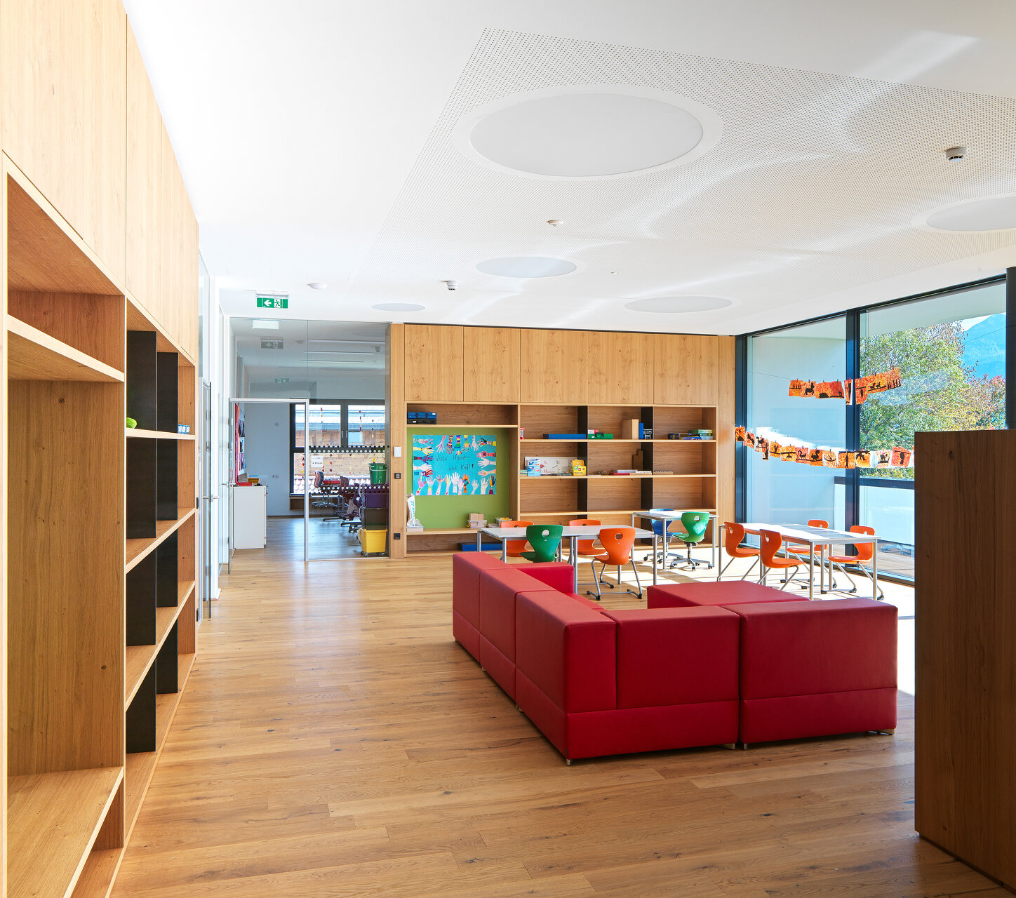 Mit dem zwischen Alt und Neu situierten Haupteingang konnte im Norden eine eindeutige Zugangssituation geschaffen werden. Entlang des Rollerweges und des Föhrenweges führt ein neuer Gehsteig bis zum überdachten Eingangsbereich des Schulgebäudes. Die Aula, die auch als Lernlandschaft genutzt werden kann, Nachmittagsbetreuung und Bibliothek sind im Erdgeschoß der Erweiterung situiert, Verwaltung und Zentralgarderobe im funktionell bereinigten Bestand. Über den neuen Erschließungskern mit Lift und Stiegenhaus gelangt man in das Obergeschoß, in dem um einen zentral liegenden Gruppenraum zwei „Lerncluster“ aus jeweils drei Klassen und einer Lernlandschaft im Bestand bzw. in der Erweiterung untergebracht sind. Der in Massivbauweise ausgeführte Zubau kragt im Obergeschoß dreiseitig aus, womit auf der Erdgeschoßebene witterungsgeschützte Freiflächen geschaffen werden konnten. Die Turnhalle im Untergeschoß ist ebenfalls an den neuen Erschließungskern angebunden und wird weiterhin über Lichtschächte mit Tageslicht versorgt. Anstelle des abgetragenen Kindergartenzubaus befindet sich nun am Dach der Turnhalle eine große Außenfläche, die – ausgestattet mit Spielgeräten, Hochbeeten und Sportflächen – von den Kindern als Spiel-, Freizeit- und Lernbereich genutzt werden kann. (Text: Claudia Wedekind, nach einem Text der Architekt:innen)