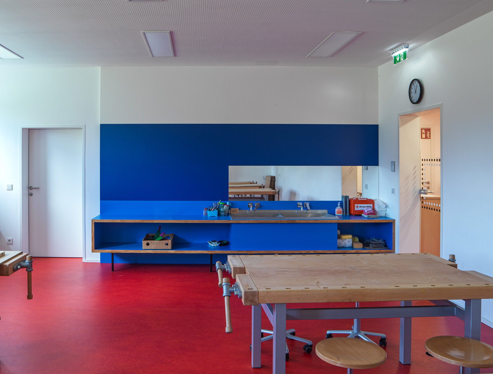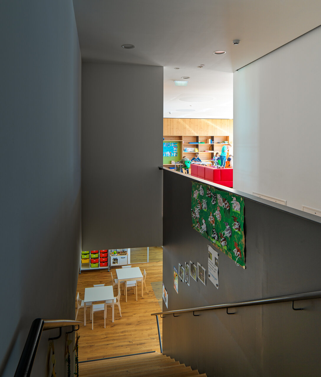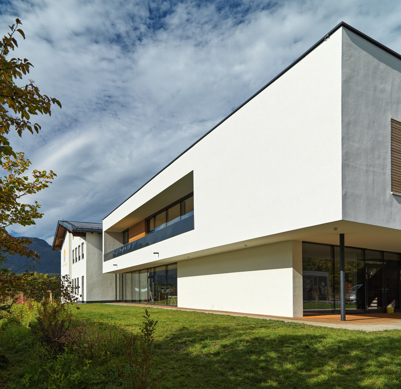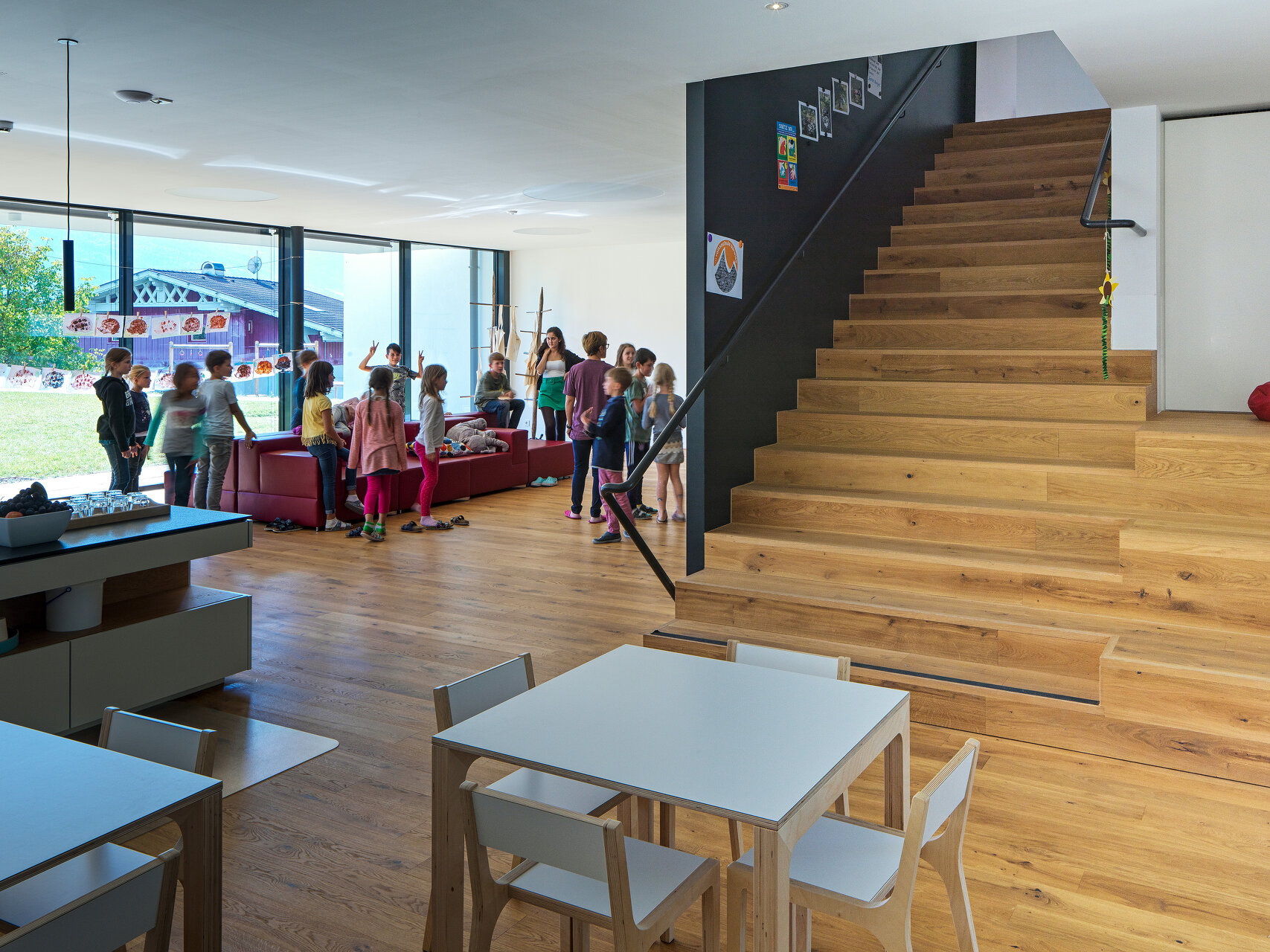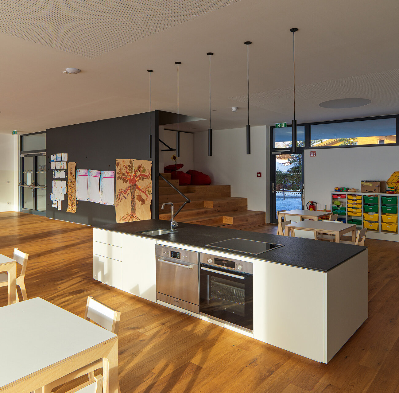 Die Grundidee von Florian Lutz und Daniela Amann, die mit ihrem Konzept den geladenen Realisierungswettbewerb gewannen, bestand darin, den im Süden liegenden ehemaligen Kindergartenzubau abzutragen und nur die darunter liegende Turnhalle zu erhalten und zu sanieren. Dafür errichteten sie im Osten einen neuen, zweigeschoßigen Zubau, der sich nach außen klar vom Bestand absetzt, im Inneren jedoch über den gemeinsamen Erschließungskern zu einer Einheit verbunden ist.