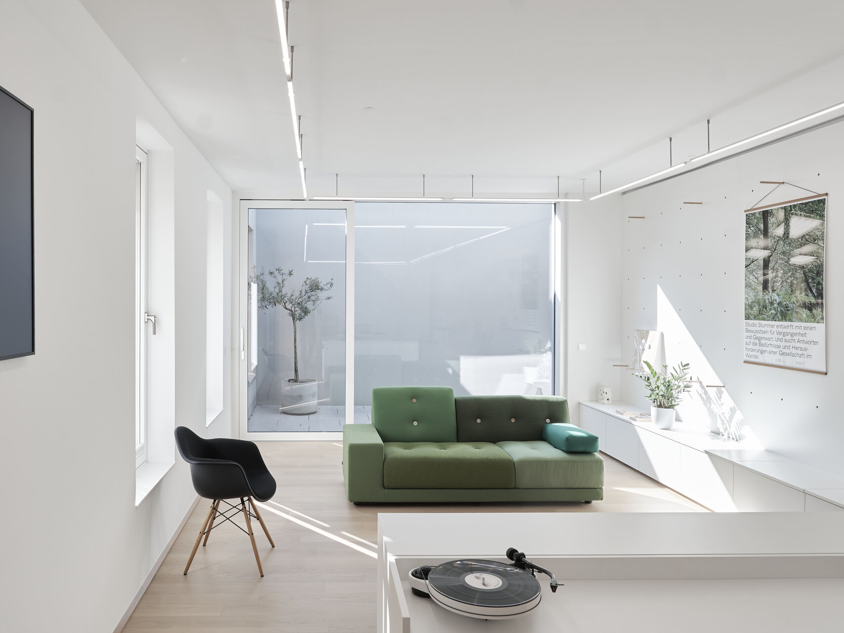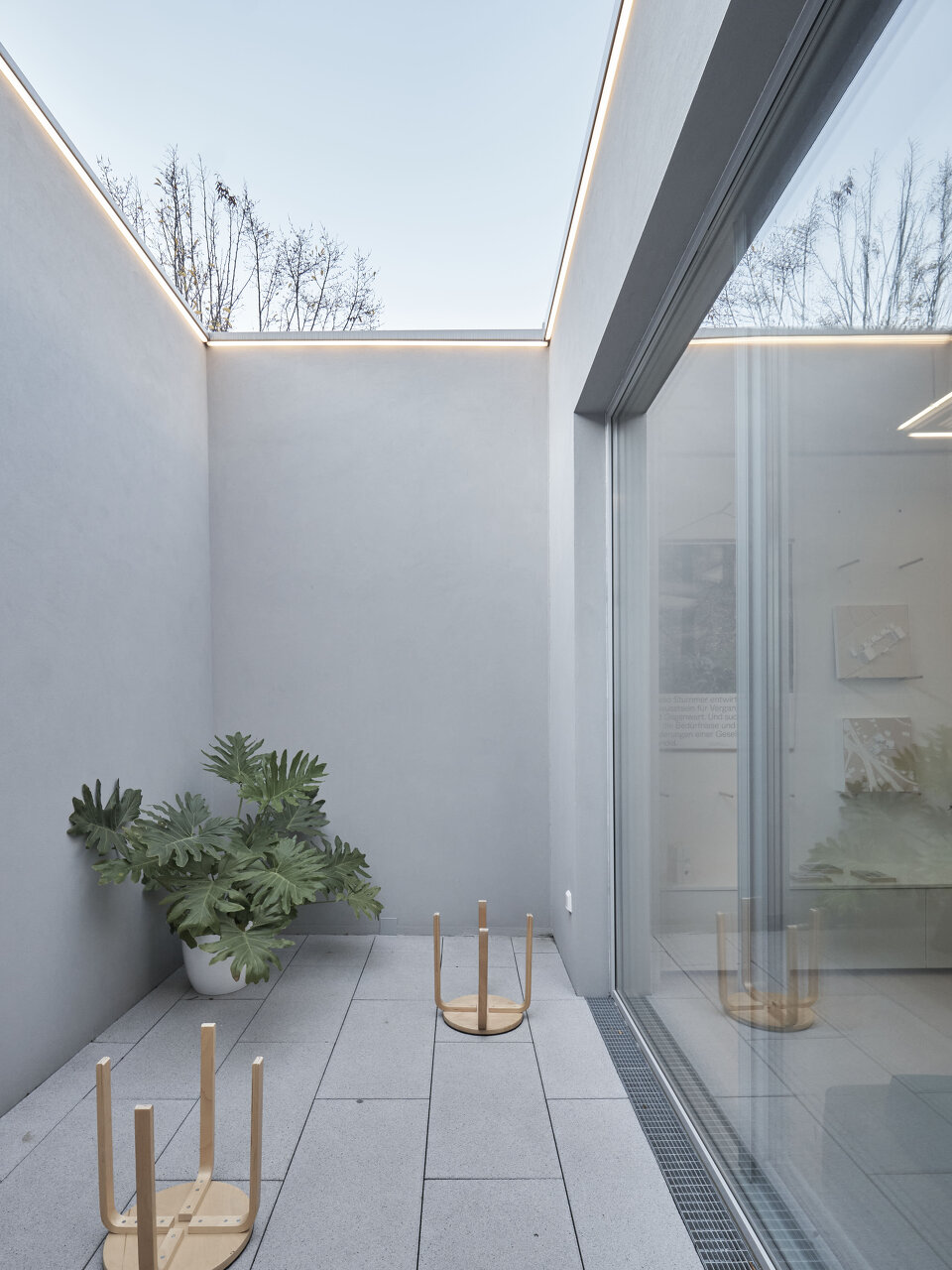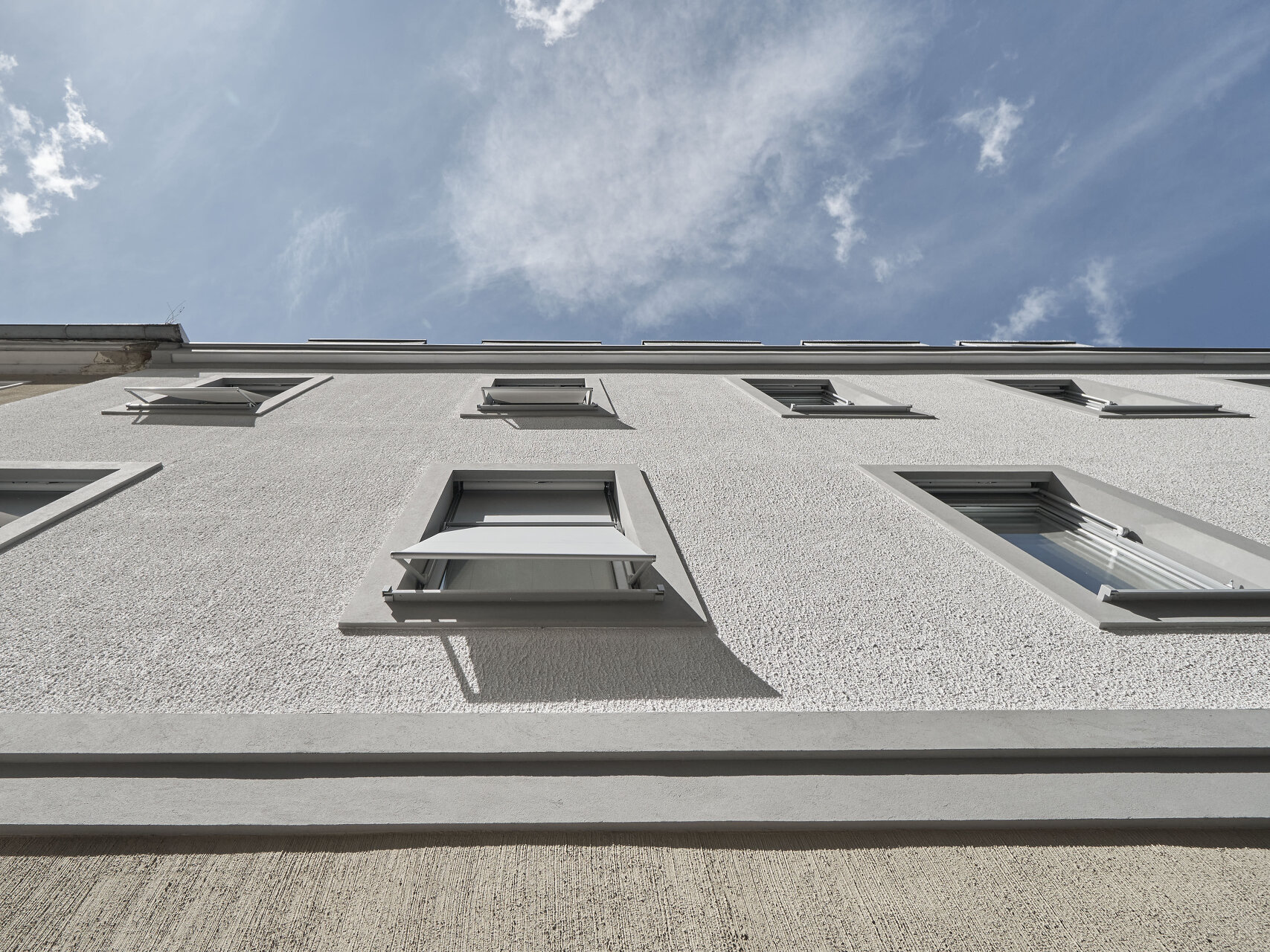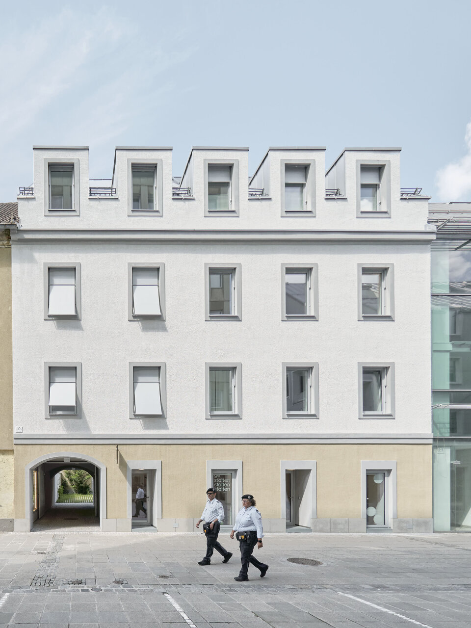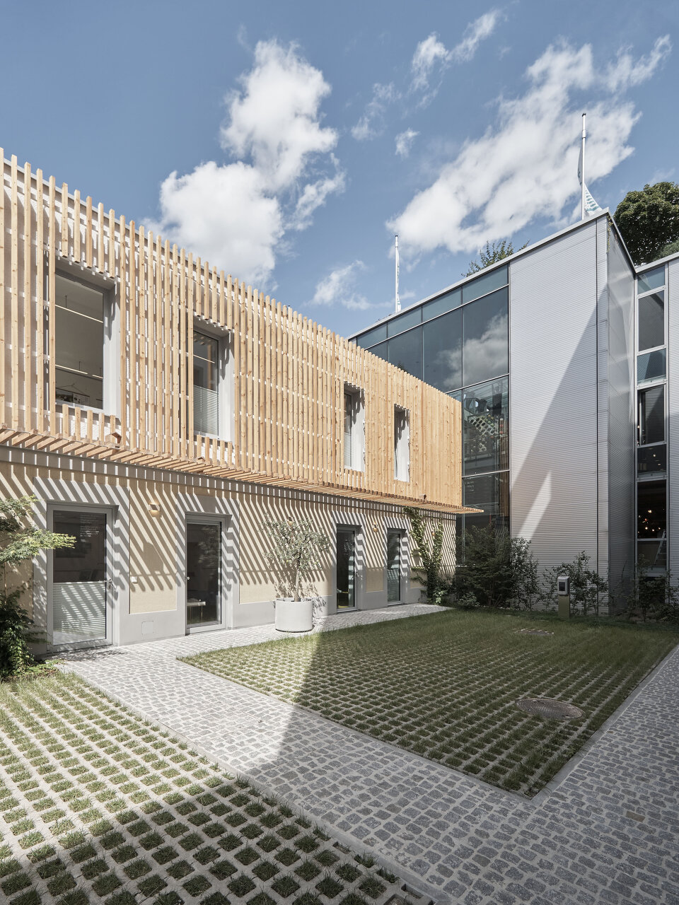 Vor allem an adäquater Sanitärausstattung und an Außenräumen mit Aufenthaltsqualität fehlte es dem in die Jahre gekommenen Ensemble. Hofseitig wurde das Haupthaus deshalb um eine 2,5 Meter breite Infrastrukturachse ergänzt. Sie bietet Raum für Terrasse, Bad und Lift. Die asphaltierte Hoffläche wurde aufgebrochen und mit Rasengittersteinen und kleinformatigem Granitpflaster neu gestaltet. Das Stellplatzangebot im früher oft zugeparkten Hof wurde reduziert und für zwei Elektrofahrzeuge reserviert.