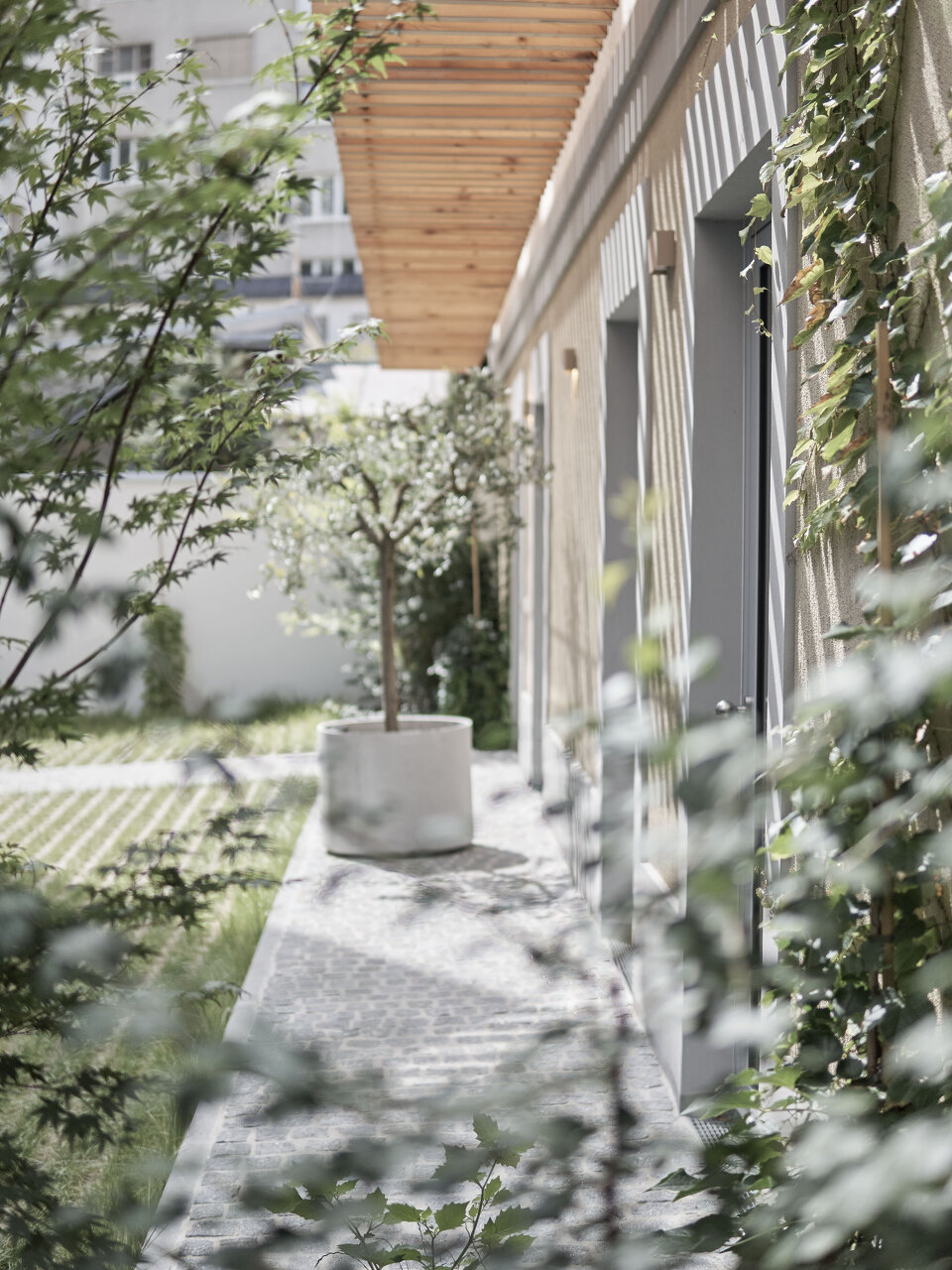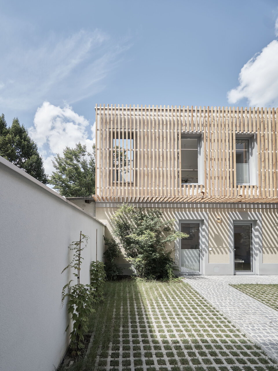 Das Haupthaus wurde um eine Etage erweitert. Auch das bislang eingeschoßige Hofhaus bietet dank Aufstockung wertvolle Zusatzflächen und eine geschützte Loggia. Das Obergeschoß des Nebengebäudes wurde mit einer Konstruktion aus Lärchenholz versehen, die von wildem Wein bewachsen wird. (Text: Tobias Hagleitner, nach einem Text der Architekten)