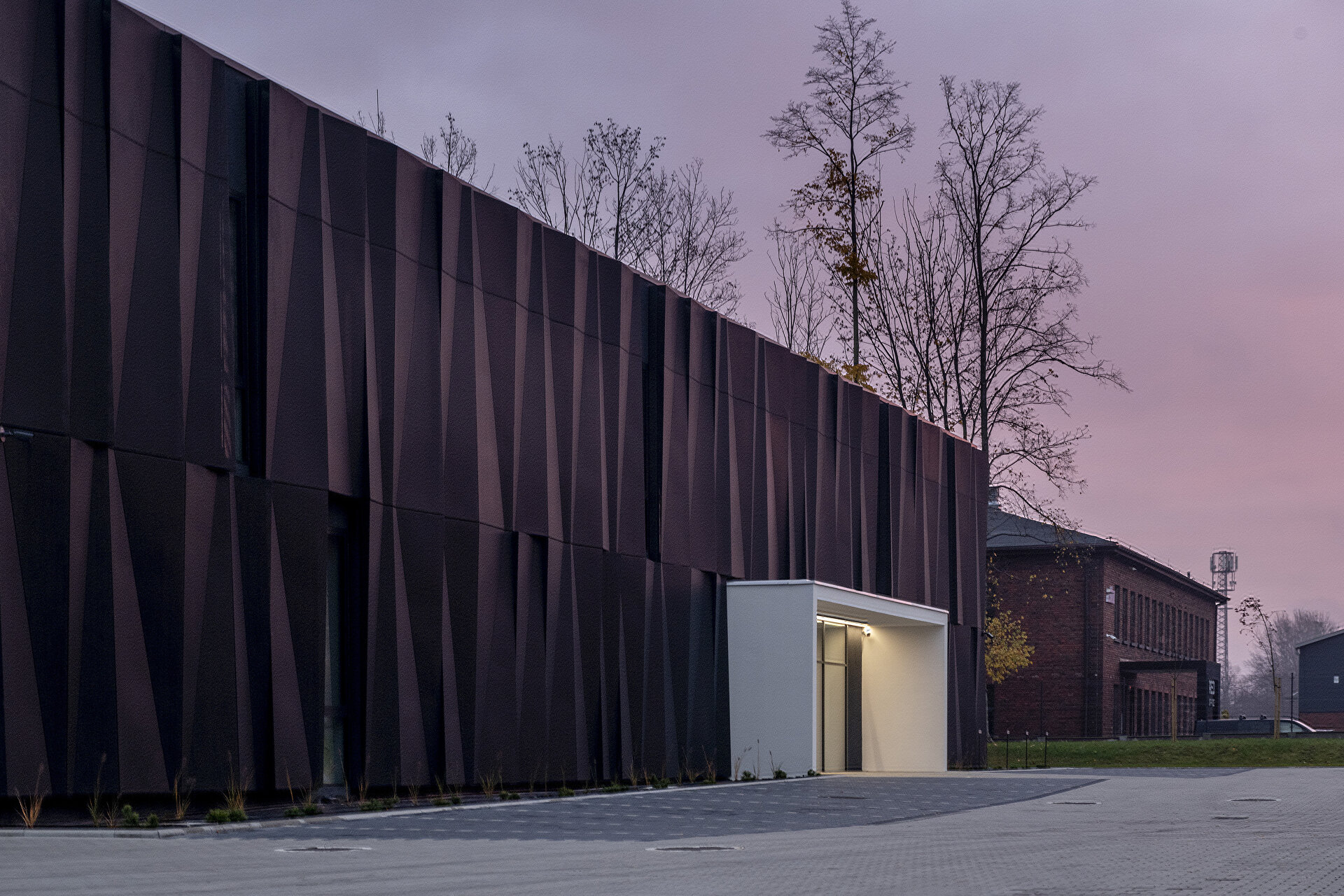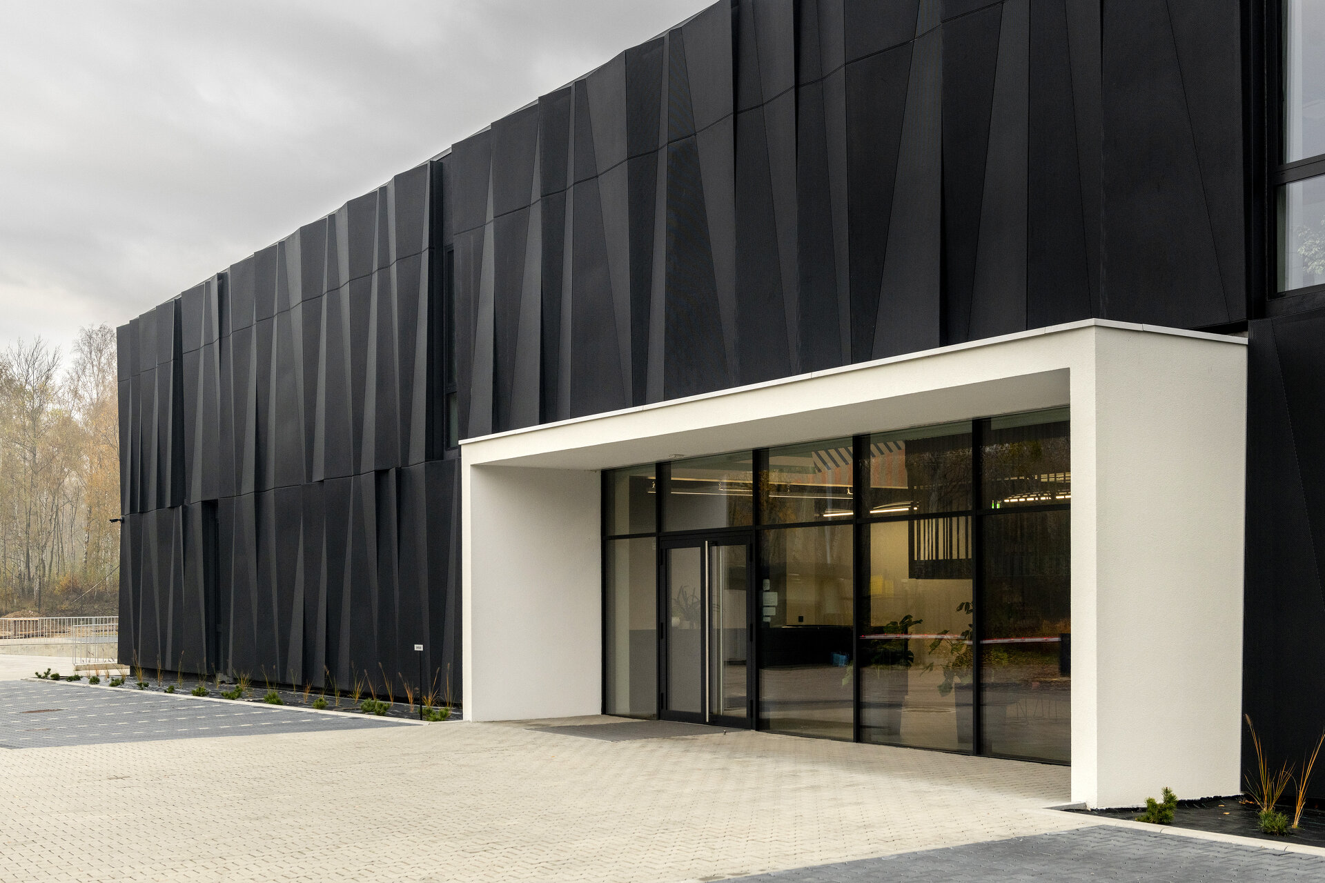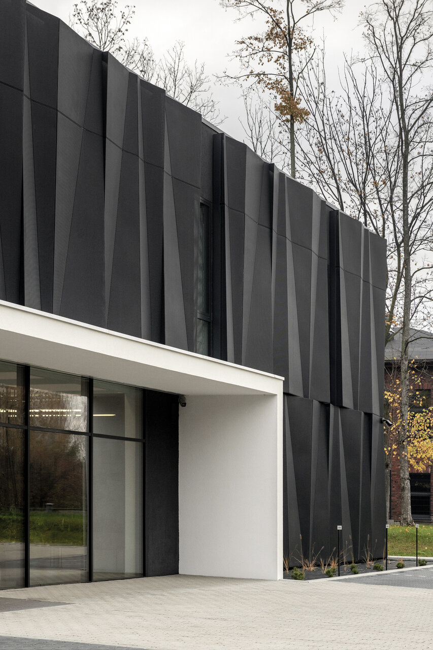 Die Lagerhalle, als dominanteres Volumen, hält sich mit ihrer hellen Aluminiumpaneel-Fassade deutlich im Hintergrund. Im Kontrast dazu ist das kompaktere Volumen des Bürogebäudes in eine dunkle, gefaltete Hülle aus perforierten Aluminiumelementen gekleidet. Die starren, matt-schwarzen Facetten dienen als Sonnenschutz und sind als Referenz an die vom Kohleabbau geprägte Geschichte Schlesiens zu verstehen. Sie verleihen dem Bürogebäude eine homogene und abstrakte Anmutung. Das Erscheinungsbild verändert sich mit den Lichtverhältnissen der Tageszeiten und den Wetterverhältnissen.