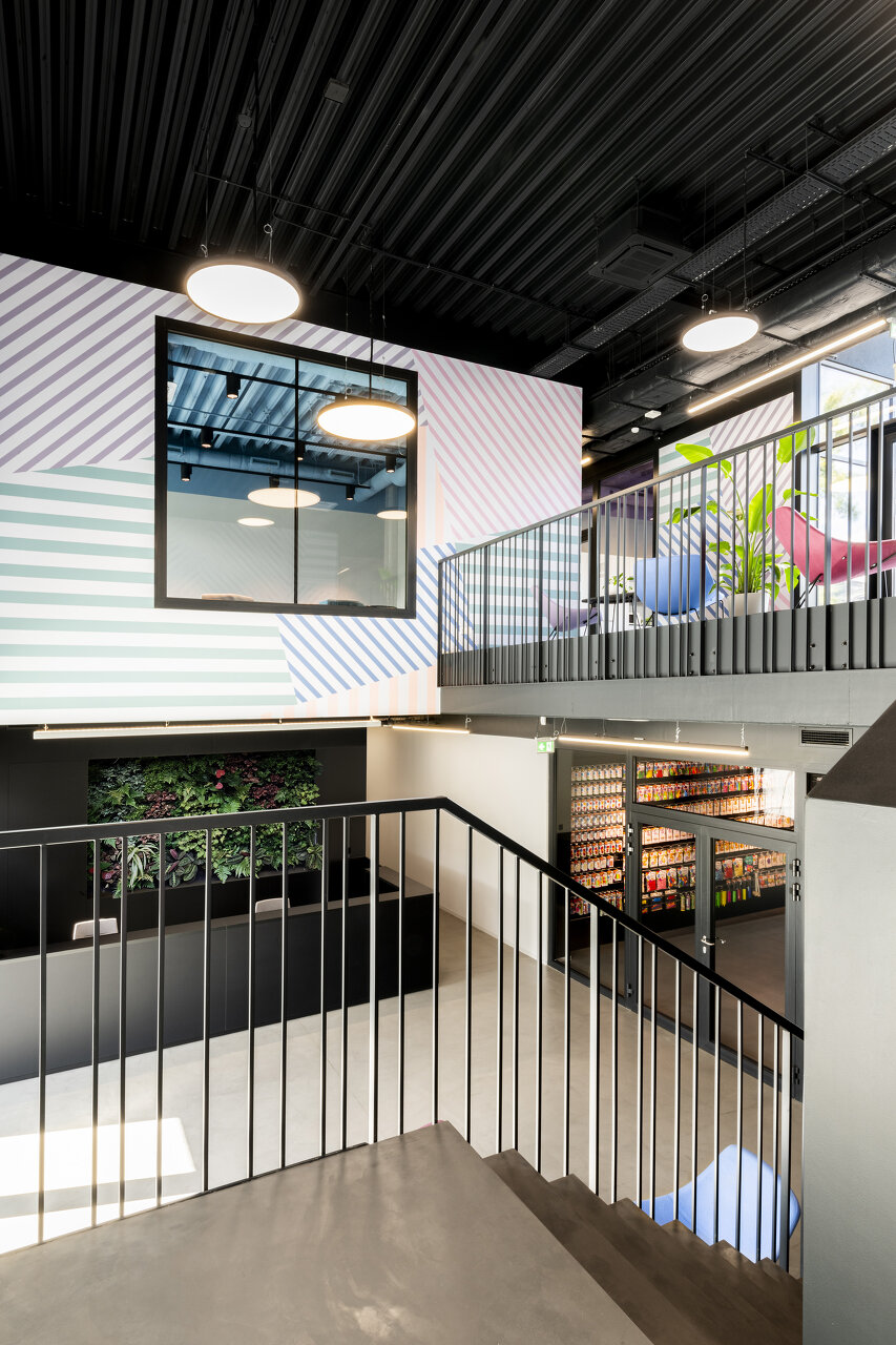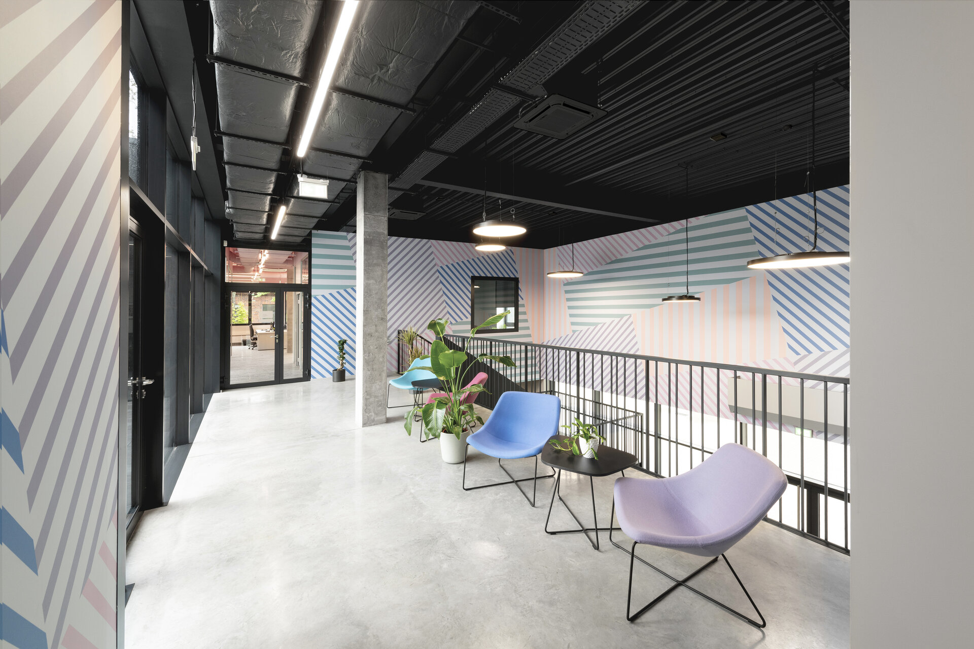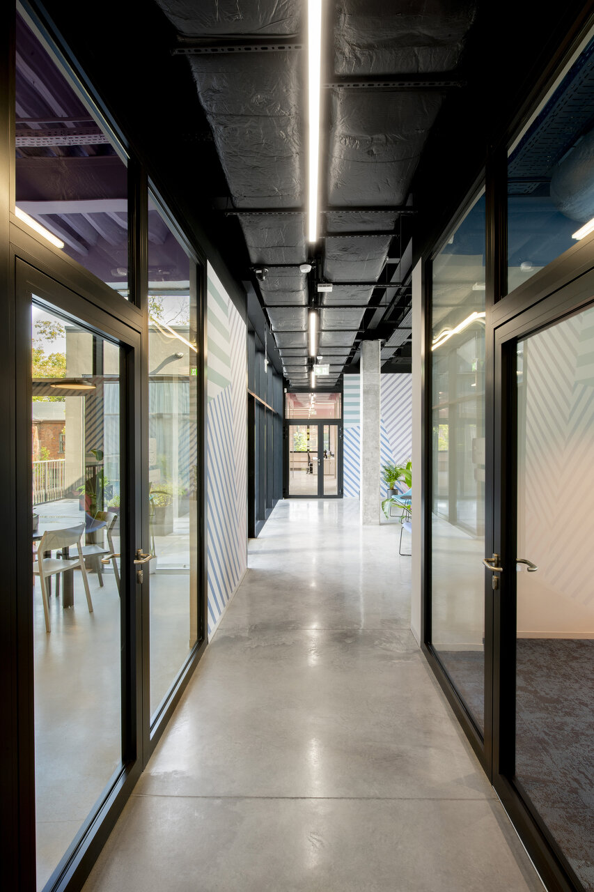 Im Kontrast zur dunkeln Fassade spiegeln sich die von viel Farbe geprägten Geschäftsfelder des Unternehmens im Innenraum in einer Abfolge von fein abgestimmten Deckenfarben und Wandtapeten – in Kombination mit der industriellen Anmutung roh belassener Materialen. (Autor: Achim Geissinger, nach einem Text der Architekt:innen)