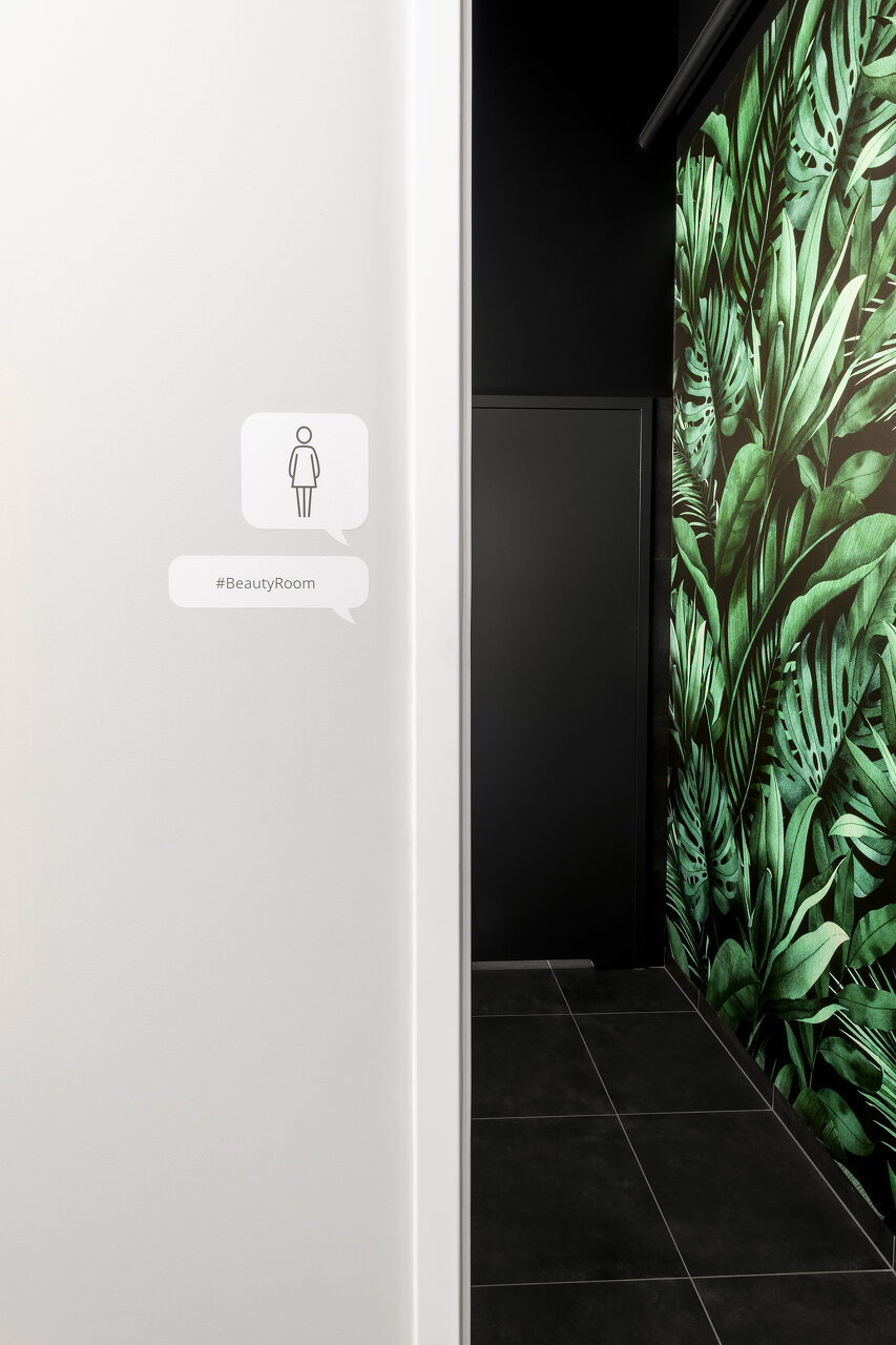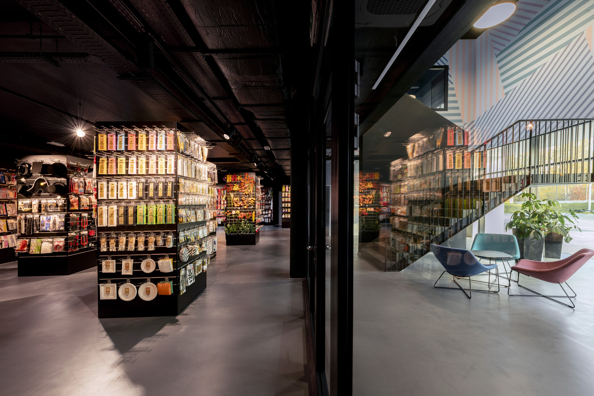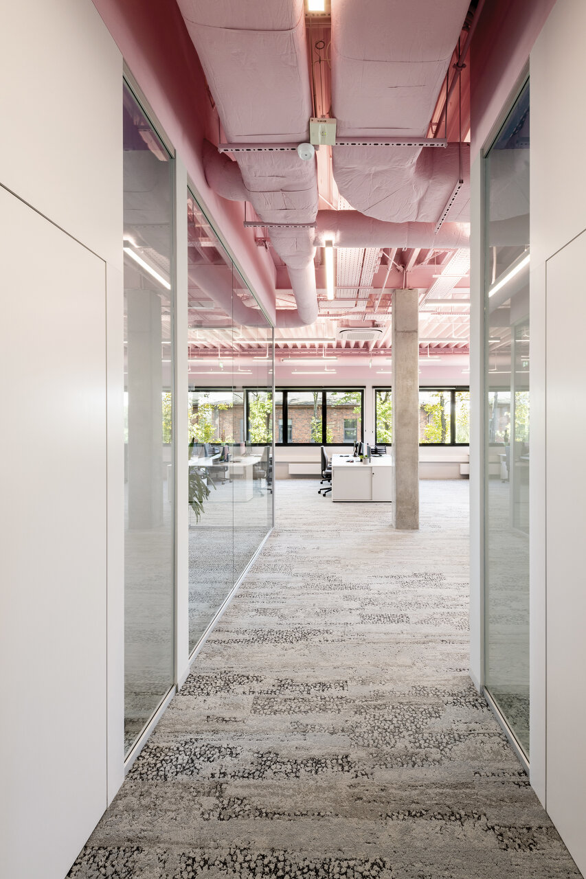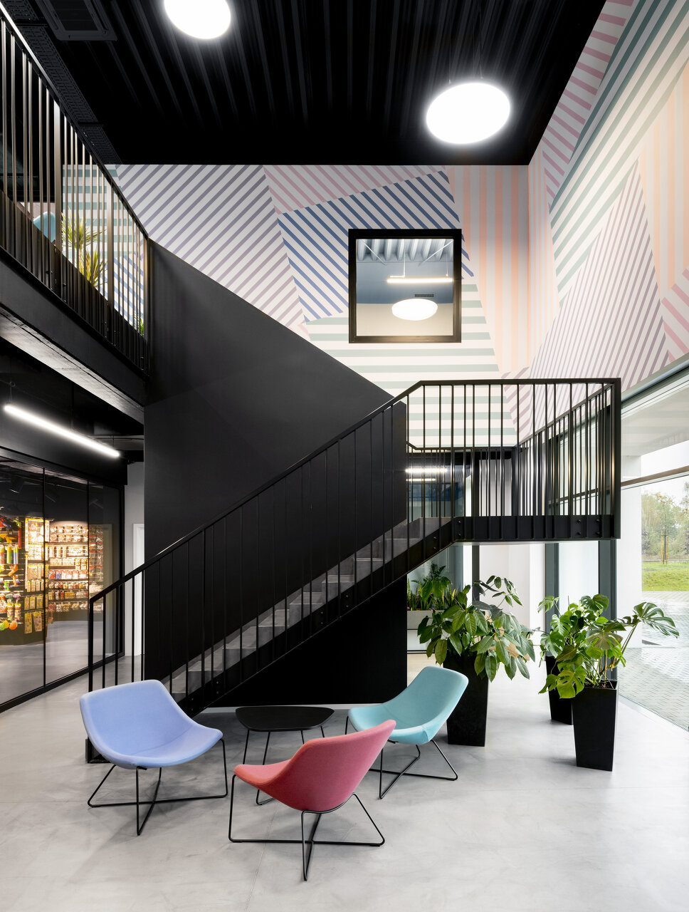 Im Kontrast zur dunkeln Fassade spiegeln sich die von viel Farbe geprägten Geschäftsfelder des Unternehmens im Innenraum in einer Abfolge von fein abgestimmten Deckenfarben und Wandtapeten – in Kombination mit der industriellen Anmutung roh belassener Materialen. (Autor: Achim Geissinger, nach einem Text der Architekt:innen)