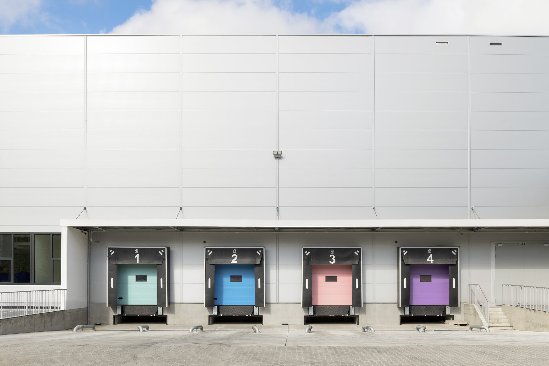 Die beiden quaderförmigen und sehr unterschiedlich großen Baukörper des Bürogebäudes und der Lagerhalle liegen versetzt im idealen Bezug der Funktionen zueinander und rahmen den Lade-Hof.