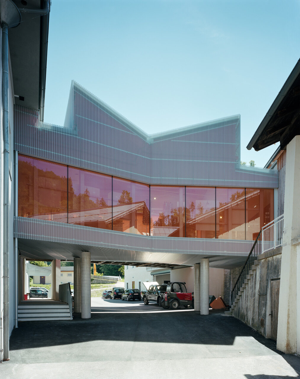 Insgesamt 65,24 Kilometer Stollen durchziehen den Dürrnberg, 12,4 Kilometer davon sind begehbar. Eine Fahrt in den Berg ist auch eine Fahrt durch die Geschichte. Kelten, Mittelalter, Barock, Gegenwart: Davon erzählen die „Salzwelten Salzburg“ auf jeder Ebene. Der authentische Ort spricht für sich – die Pölzungen, die Grenze zu Bayern im Berg, die Rutschen. Exponate und Installationen laden ihn mit Emotion auf. Scherenschnittartige Projektionen der Artfabrik zaubern die Silhouette Salzburgs untermalt mit Barockmusik an einen farbigen Horizont, farbig spiegelt sie sich im Salzsee. Die Tour endet im Shop, den TNE in einem neuen Brückenbauwerk unterbrachten. Es verläuft parallel zur alten Brücke, hat eine Einschnürung in der Mitte, die als Sog wirken soll, und erinnert vom polygonalen Grundriss her an die Wegführung der Stollen unter Tage. „Die Erkennung von Figuren ist sehr wichtig“, sagt Ernst Fuchs. „Für mich sind die Salzwelten ein Projekt der Dächer.“ Die frei geformten Additionen – der Trichter am Eingang, das Glasdach der Plaza, das Auditorium und dieser Brückenbau – fassen die Bestandsbauten zum verbindenden Ganzen zusammen.
