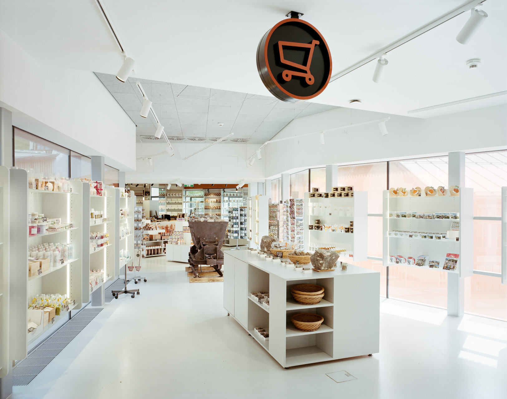 Oranges Glas verfremdet die Landschaft und macht den Shop zum magischen Raum. Gegenüber auf dem Kelten.Erlebnis.Berg produziert man in der Salzmanufaktur in vier Becken wieder Salz. Es kommt bei 68 Grad ins Solewasser, kristallisiert in kleinen Salzpyramiden, die auf einem Gitter aufgefangen und aus der Sole gehoben werden. Dieses heimische Fleur de Sel schmeckt sehr mild. Es ist der Bestseller.