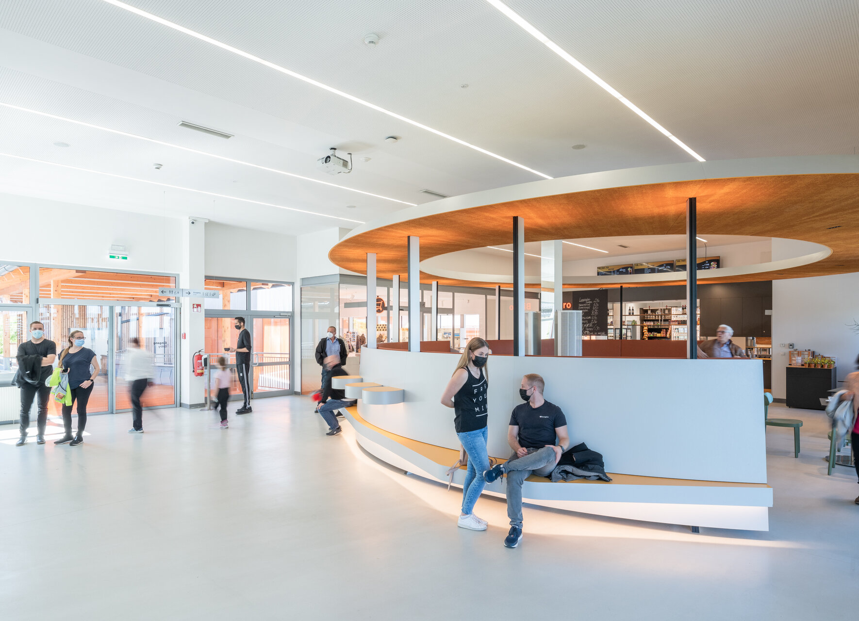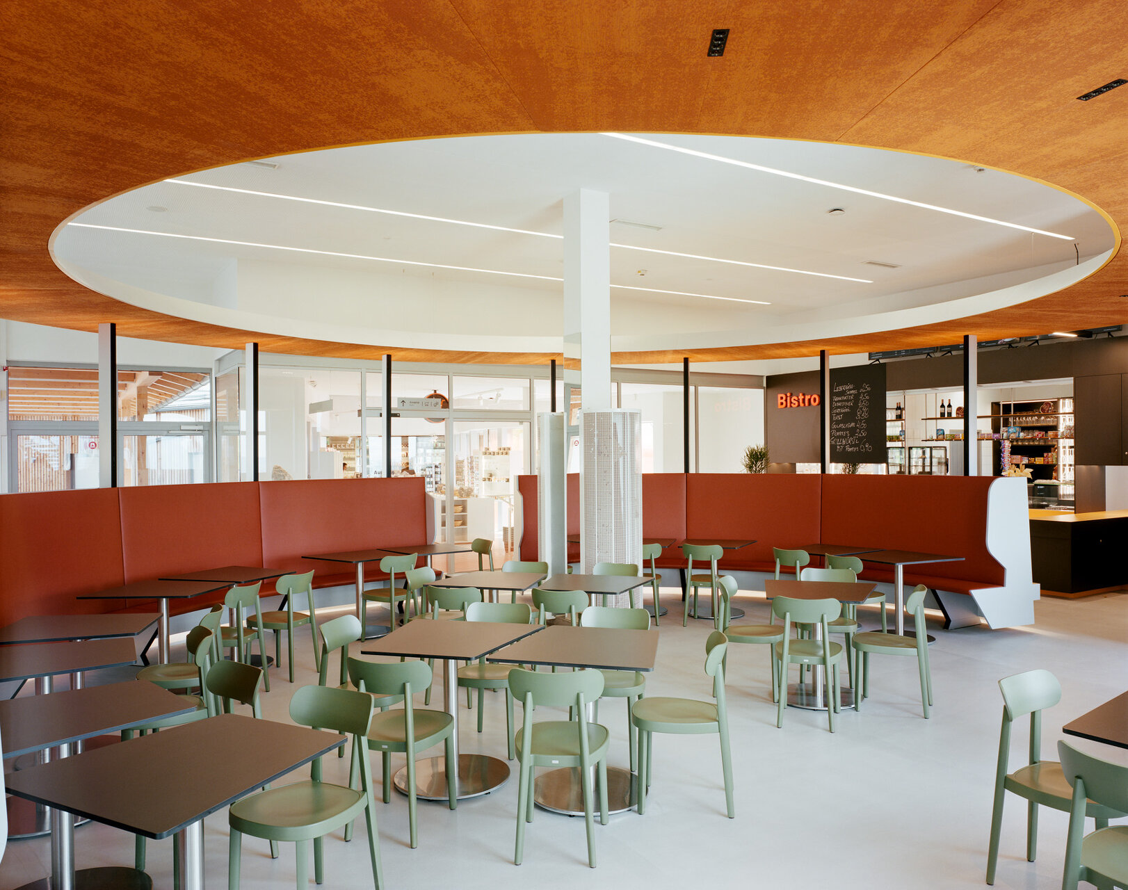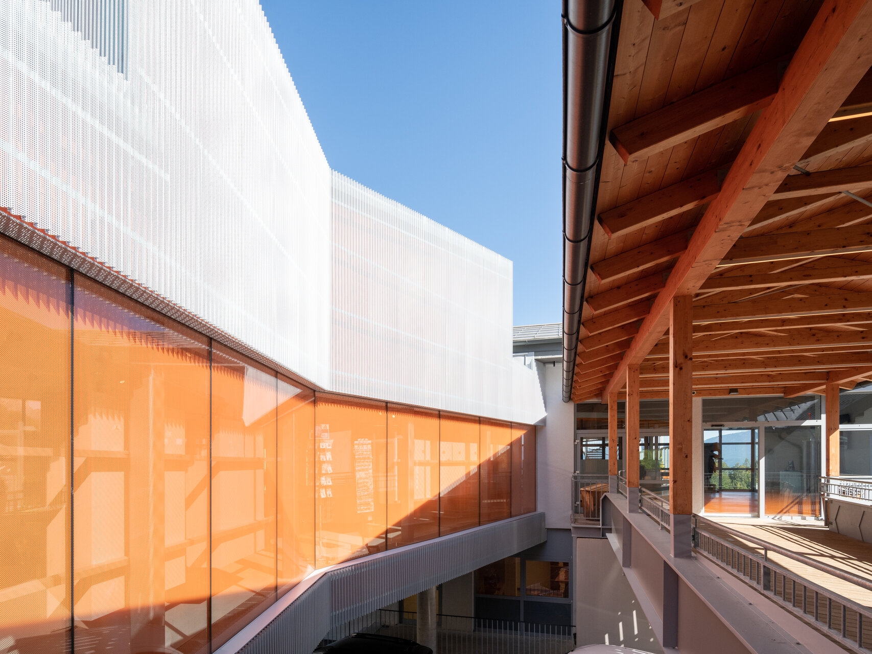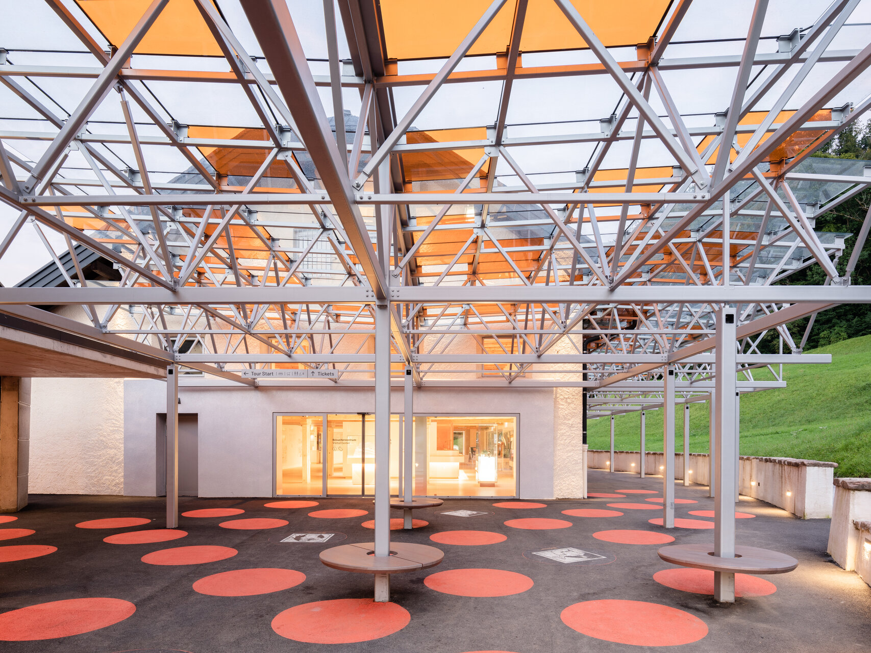 Orange ist die CI-Farbe der Salzwelten, generell sucht die Architektur den Bezug zum Steinsalzkristall. Der Estrich ist mineralisch platinbeschichtet, Weißaluminium und Stahl schimmern silbrig, Metall verweist auf die Industriegeschichte. Rund um die südwestliche Gebäudeecke des Besucherzentrums breitet sich unter einem Glasdach auf einer Stahlkonstruktion ein Platz aus. Oranges und hellblaues Glas erzeugt flirrende Farbspiele auf dem Boden. Als Oase, Treffpunkt und Verteiler liegt die Plaza günstig. Westwärts kommt man hinauf zum Kelten.Erlebnis.Berg. Im Norden mündet die Brücke ins Bergeinfahrtsgebäude ein. Ein klassisches Nadelöhr, in das TNE das Bistro als Raum-im-Raum-Pavillon implantierten. Ein oranger Lichtkreis über einer runden Wand, innen orange gepolsterte Bänke, in der Mitte 48 Sitzplätze, über dem Mundloch in den Berg mutiert der Verbindungsbau der 1990er-Jahre zur Aussichtsveranda. Was für ein Panorama!