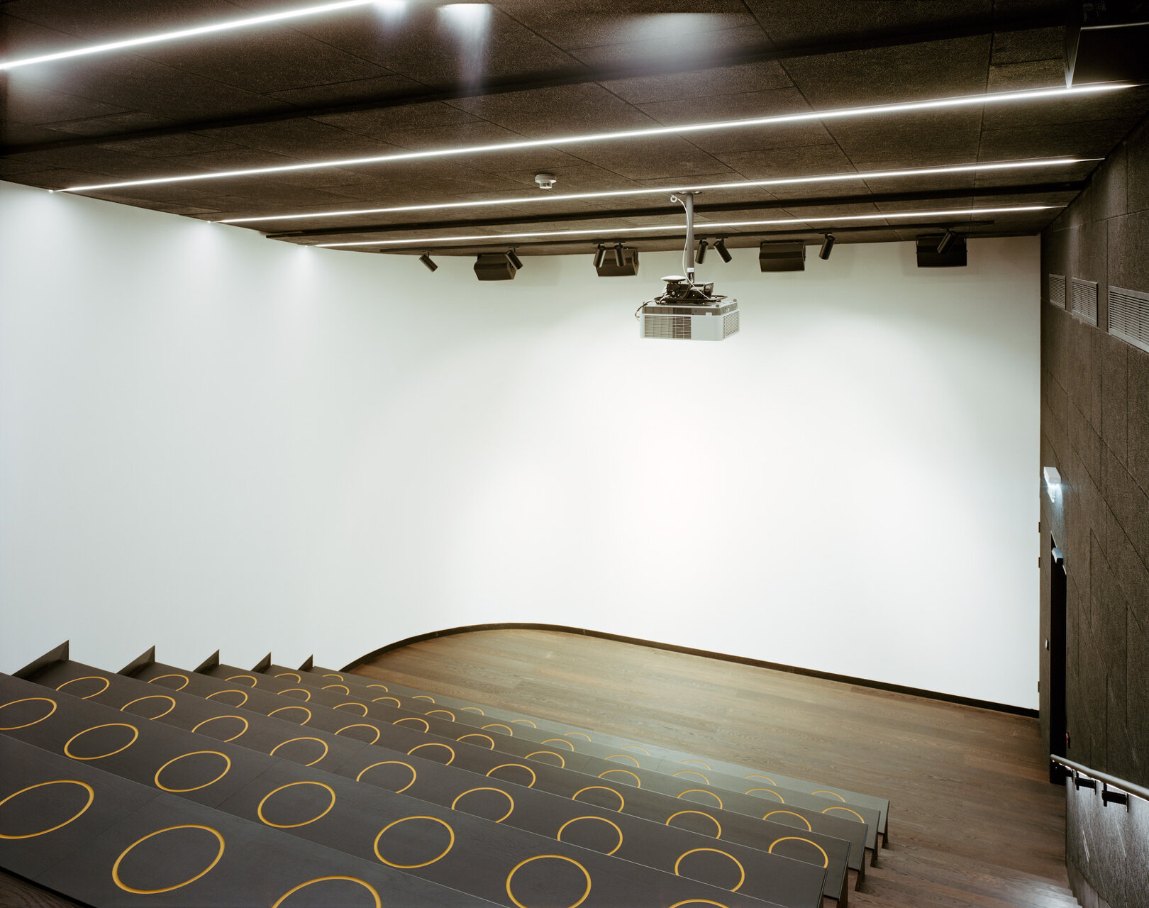 60 Personen bilden eine Gruppe für die Fahrt in den Stollen, alle zehn Minuten startet eine Tour. Flüssig lässt sich die Bistro-Insel umrunden, wandintegrierte Sitz- und Ablageflächen machen das Warten auf die Schutzkleidung erträglich. Ein salzig-weißer Raum mit verspiegelten Säulen ersetzt die vormals muffige Garderobe. Der besondere Clou liegt im Auditorium, das TNE stirnseitig an das Einfahrtsgebäude anbauten. Die gerundete Projektionsfläche und Tribüne bedingen die spezifische Form des orangen Zubaus mit der perforierten Profilmetallfassade, der auch die darunter liegende Rangierfläche der neu gebauten Metallwerkstatt überdacht. Selten sinnstiftend überwindet das Kino mit 65 Plätzen den Niveausprung ins Untergeschoß. Der Image-Film vom Studio Artfabrik erzählt Geschichten vom Salz, fast euphorisch beschreitet man den Steg zum Mundloch.