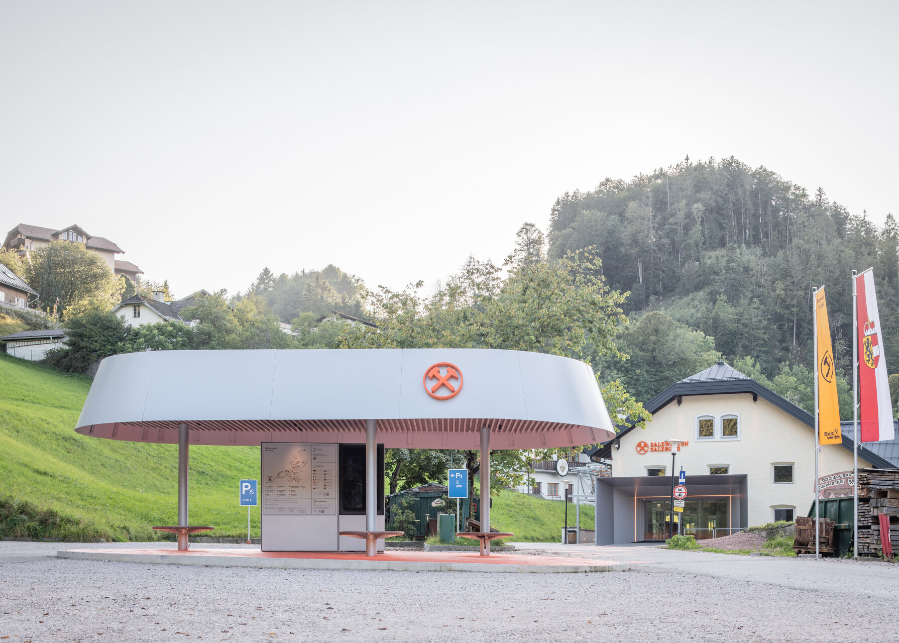 „Es geht um den Spagat zwischen Information und Unterhaltung“, sagen Marie-Therese Harnoncourt-Fuchs und Ernst J. Fuchs von TNE. „Die Salzwelten sind ein Stück Kulturlandschaft mit öffentlichem Interesse an ihrer Wartung.“ TNE betrachteten sie als Gesamtheit aus Empfangsbauten, der Führung unter Tag und dem Kelten.Erlebnis.Berg. Dieses Freilichtmuseum der 1990er-Jahre stellt aus rekonstruierten Holzhäusern ein Keltendorf nach. „Die Salzwelten sind ein historisch gewachsenes Ensemble aus unterschiedlichen Zubauten, wir wollten es in seiner vielfältigen Eigenheit stärken.“ TNE gingen von Vorgefundenem aus und verfolgten eine Strategie der Inselformationen. Punktuelle Eingriffe sollten Abläufe verbessern – das glückte außerordentlich gut. Den Anfang macht der Info-Terminal beim Parkplatz, orange Punkte auf dem Boden lenken den Schritt zum metall-orangenen Trichter vor dem Eingang ins Besucherzentrum. Dieser Bau spielt eine Schlüsselrolle, war aber immer schon da. TNE entrümpelten ein altes Lagerhaus und legten den solide dimensionierten Holzdachstuhl frei. Einzig ein paar Diagonalstreben mussten verstärkt werden. Die Konstruktion hat viel Patina, sie wurde sandgestrahlt, gebürstet und gekalkt. Das erinnert an den weißen Salzfilm der Pölzungen (Abstützung durch Pfosten) im Berg; zwischen den Säulen ist genug Platz für Bänke, Displays, Menschen.