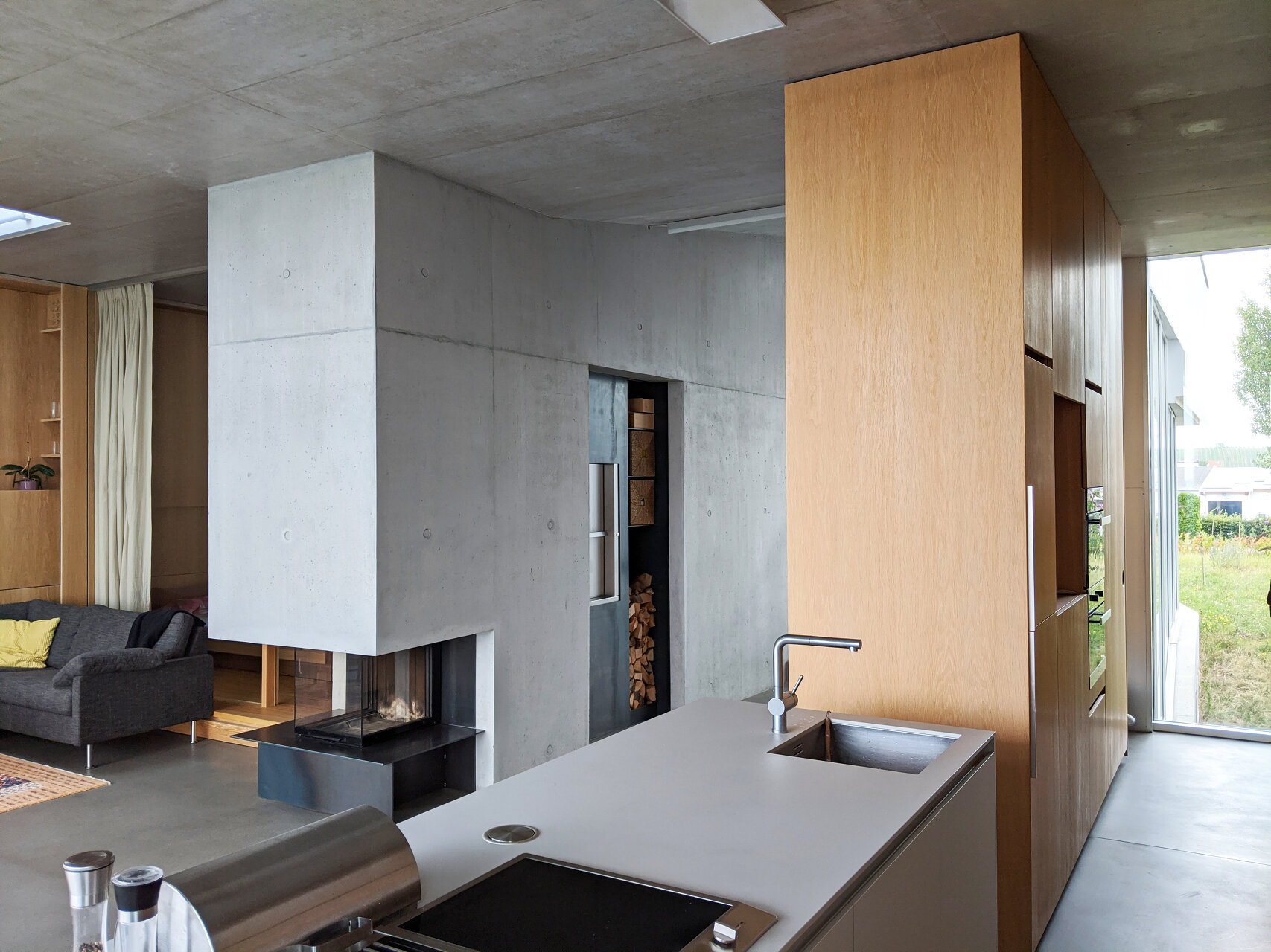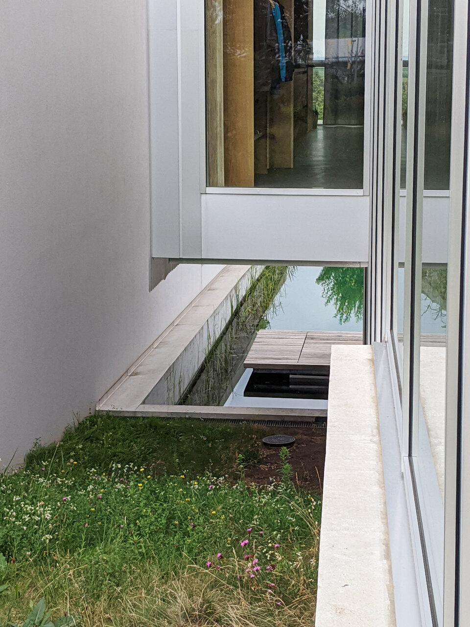 Das Gebäude ist teilweise vom Niveau abgehoben und lässt das Grundstück durchlässig. Es formt verschiedene, durch Mauern an den Grundgrenzen abgeschirmte Freiräume und schafft ein Wohnen mit starkem Außenraumbezug auf mehreren Ebenen mit Ausblick zum Neusiedler See.