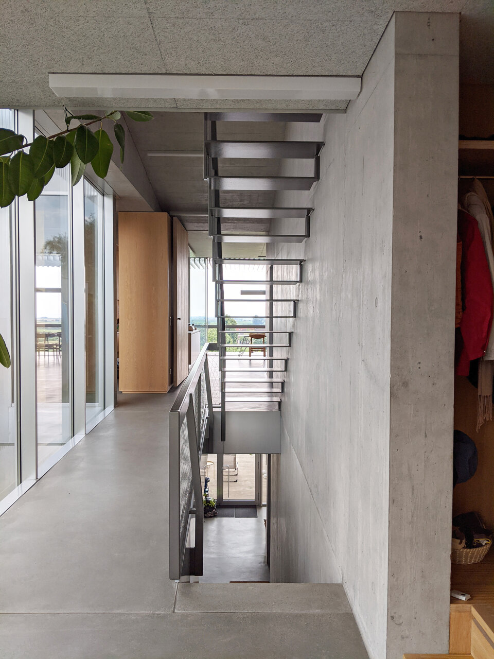 Im Inneren entstehen durch die Tiefe des Baukörpers unterschiedliche Raumqualitäten, durch die verschiedene Nutzungen angeregt werden. Blickachsen über die drei Geschosse verknüpfen diese Bereiche. Sie schaffen einen zusammenhängend erlebbaren, nach Südwesten gerichteten Raum über dem in der vorgefundenen Vegetation gehaltenen Garten.
