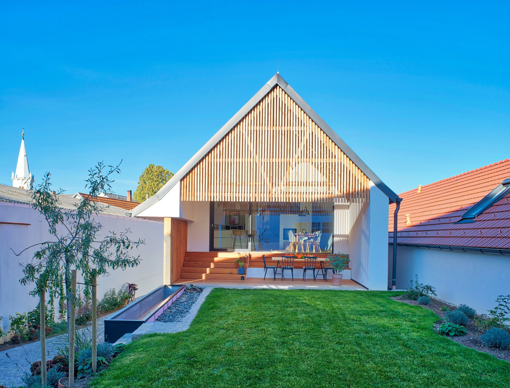 Der Wohnbereich wurde giebelseitig zu einem kleinen Garten zwischen dem Streckhof und dem Stadel geöffnet. Aufgrund der Tatsache, dass auch der Streckhof des Nachbarn zeitgleich saniert und umgebaut wurde, entstand hier ein sehr intimer und attraktiver Außenbereich. (Text: Architekt)