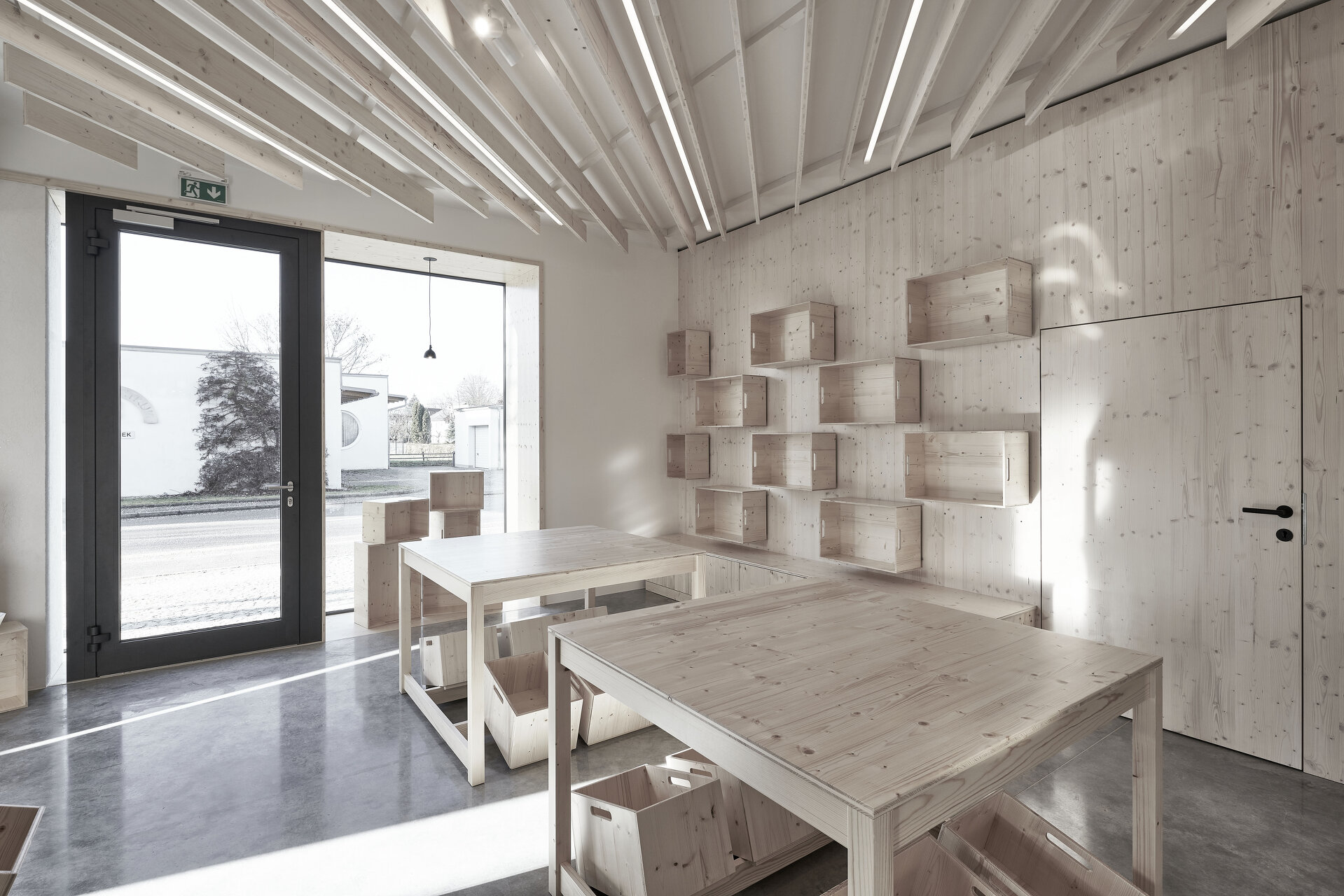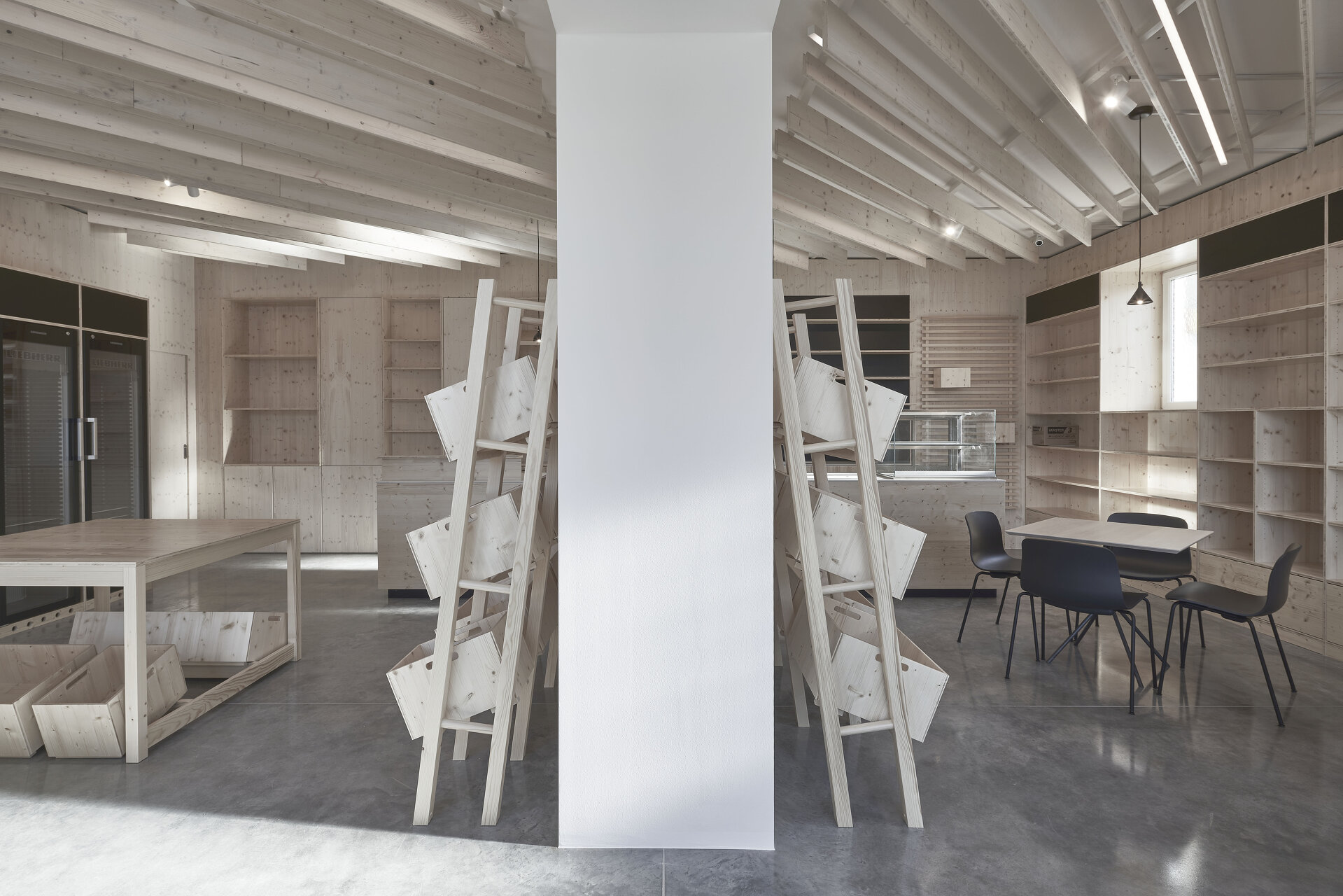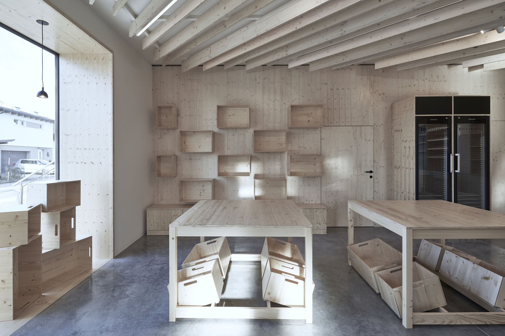 Der Boden wurde als beheizbare, monolithische Platte aus flügelgeglättetem Beton komplett neu aufgebaut. Möbel und Wandtäfelungen aus Fichtenholz schaffen angenehme Atmosphäre und wirken als natürlicher Hintergrund für die Präsentation der Waren. Eine reibungslose Logistik wird durch die Anlieferung über ein Nebenlager gewährleistet, das vom Verkaufsraum direkt zugänglich ist. Die kleine Küche im Backoffice mitsamt Garderobe rundet das Funktionsprogramm ab. Ein vorinstalliertes elektronisches System bietet grundsätzlich die Möglichkeit, auch außerhalb der Öffnungszeiten per Chipkarte einkaufen zu gehen. (Text: Tobias Hagleitner, nach einem Text der Architekten)