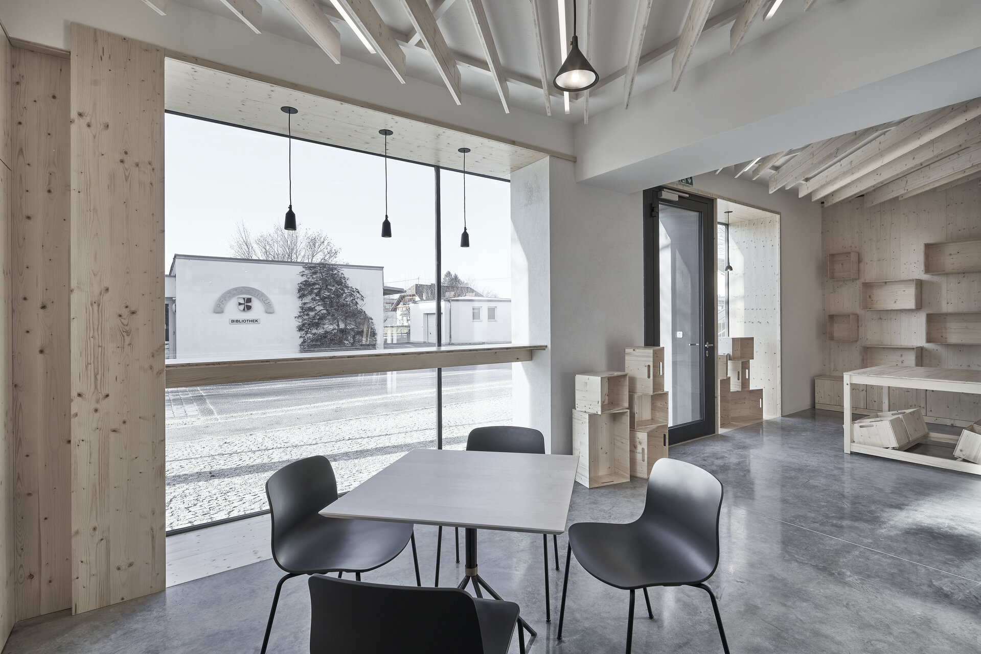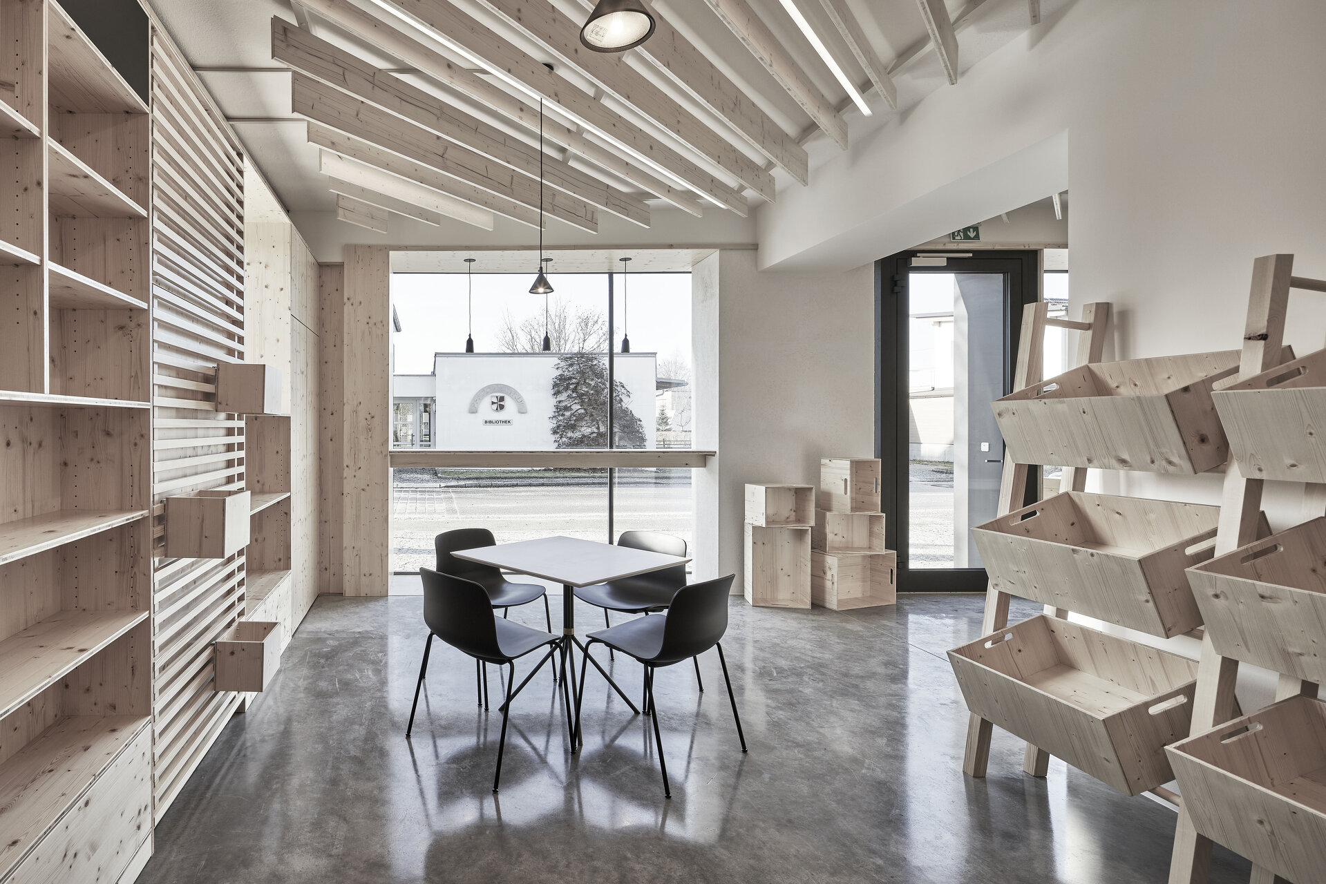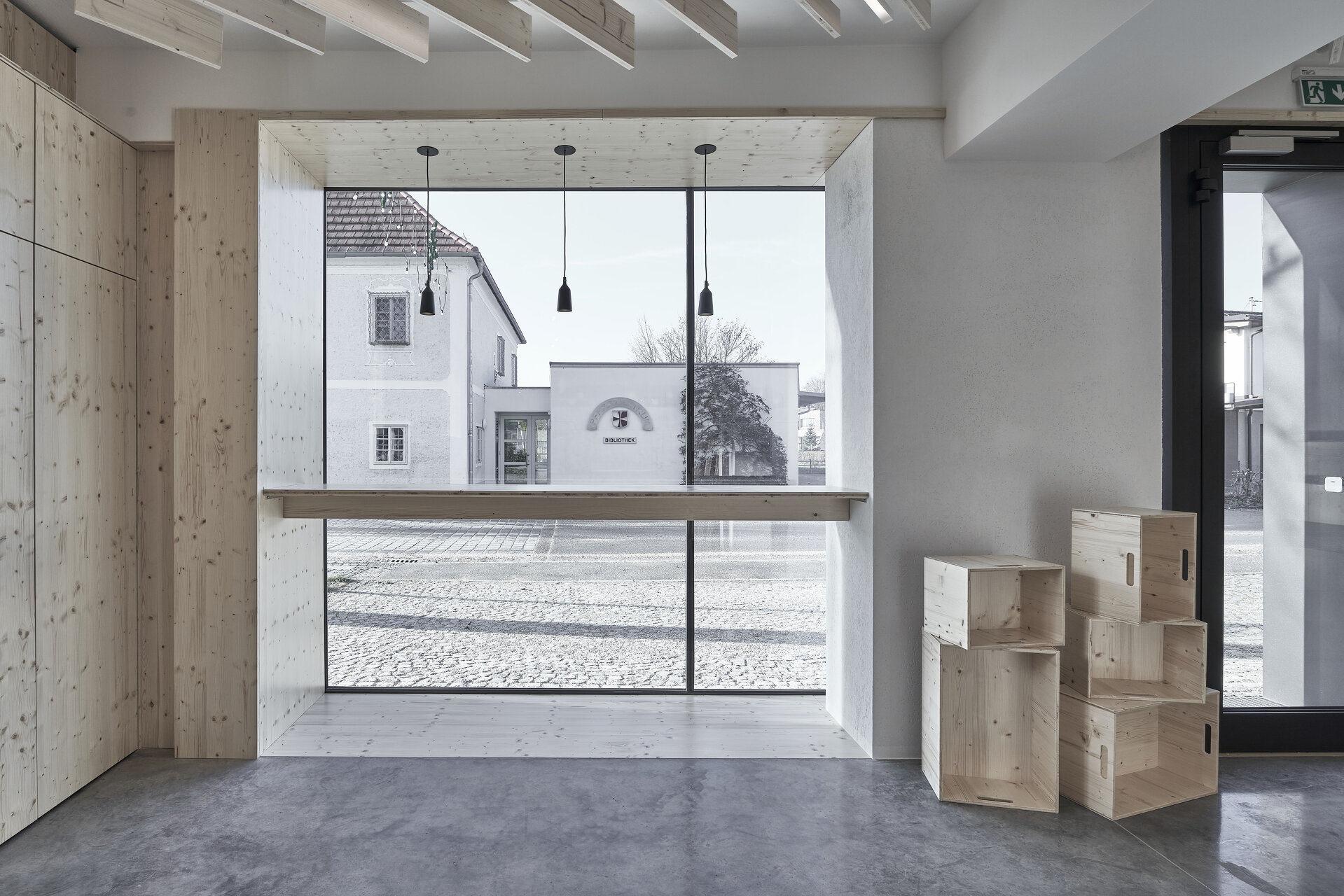 Der Boden wurde als beheizbare, monolithische Platte aus flügelgeglättetem Beton komplett neu aufgebaut. Möbel und Wandtäfelungen aus Fichtenholz schaffen angenehme Atmosphäre und wirken als natürlicher Hintergrund für die Präsentation der Waren. Eine reibungslose Logistik wird durch die Anlieferung über ein Nebenlager gewährleistet, das vom Verkaufsraum direkt zugänglich ist. Die kleine Küche im Backoffice mitsamt Garderobe rundet das Funktionsprogramm ab. Ein vorinstalliertes elektronisches System bietet grundsätzlich die Möglichkeit, auch außerhalb der Öffnungszeiten per Chipkarte einkaufen zu gehen. (Text: Tobias Hagleitner, nach einem Text der Architekten)