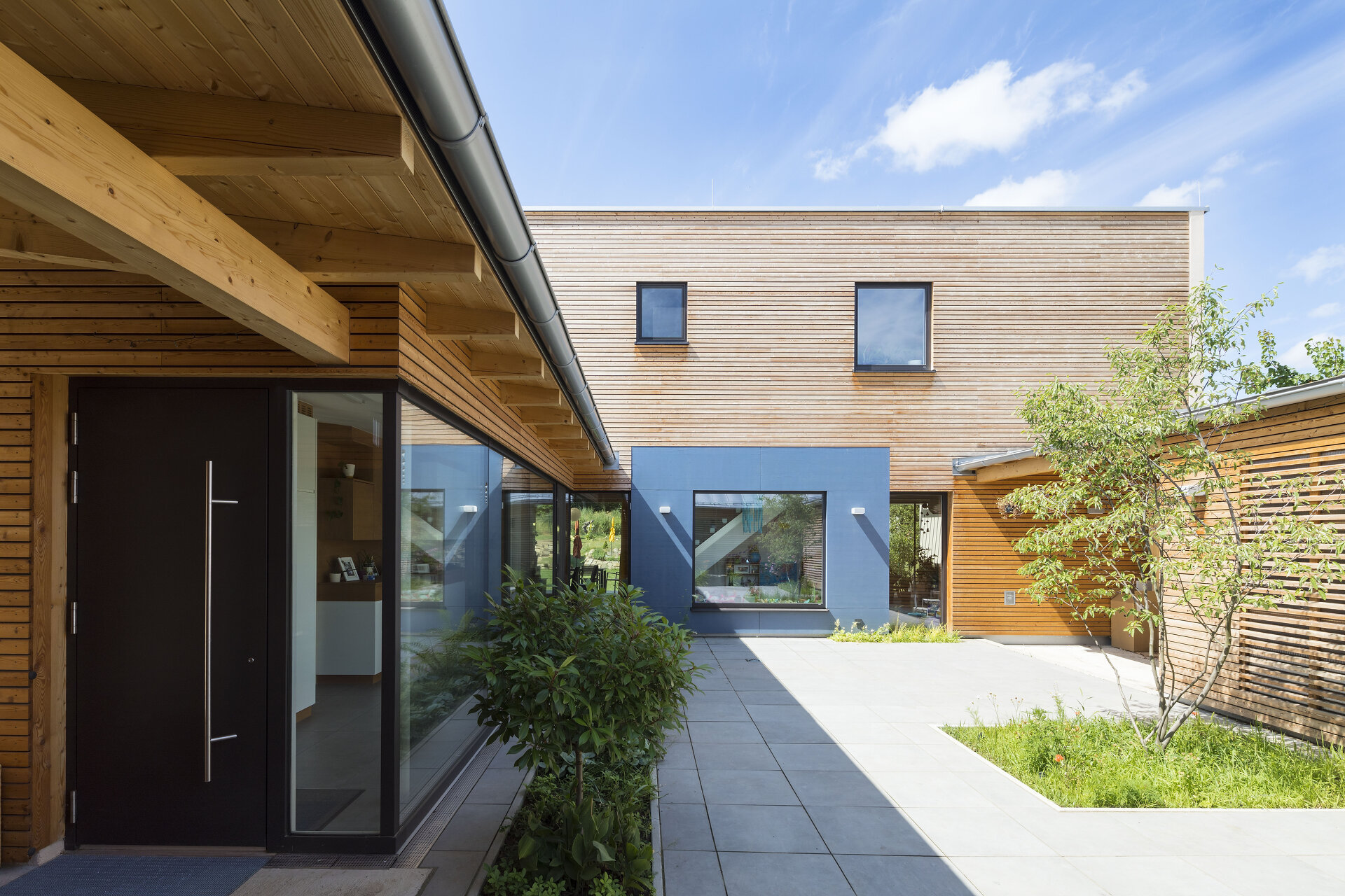 Das Haus gliedert sich in zwei winkelförmige Gebäudeteile: Der „kalte Winkel“ ist unbeheizt und beinhaltet Hauseingang, Garage und die Wirtschaftsräume. Er ist eingeschossig und zur Straße orientiert. Der „warme Winkel“ beinhaltet die eigentlichen Wohnfunktionen und ist zur Gartenseite zweigeschossig. Beide Winkel zusammen bilden ein nicht einsehbares, windgeschütztes Atrium, das als erweitertes Wohnzimmer im Sommer dient.
