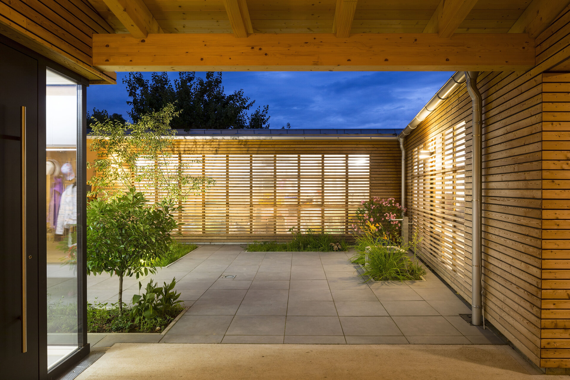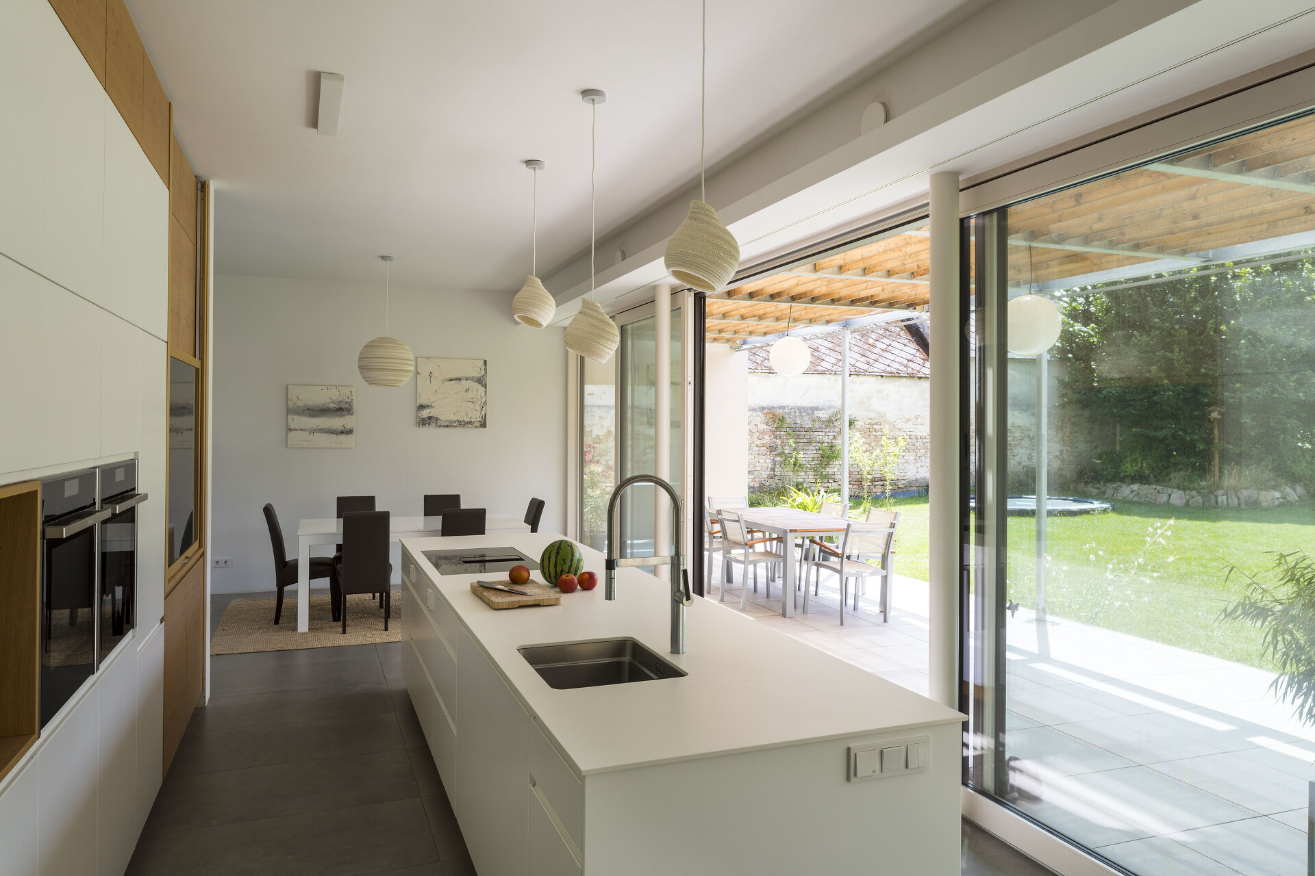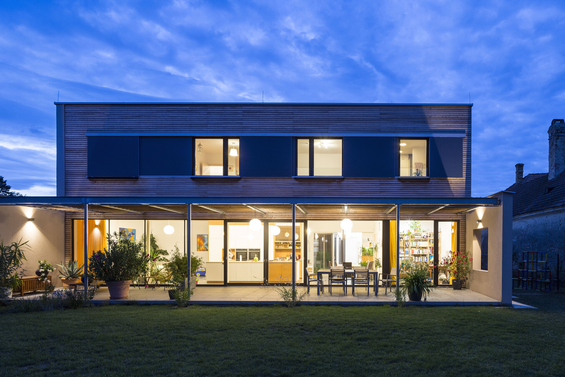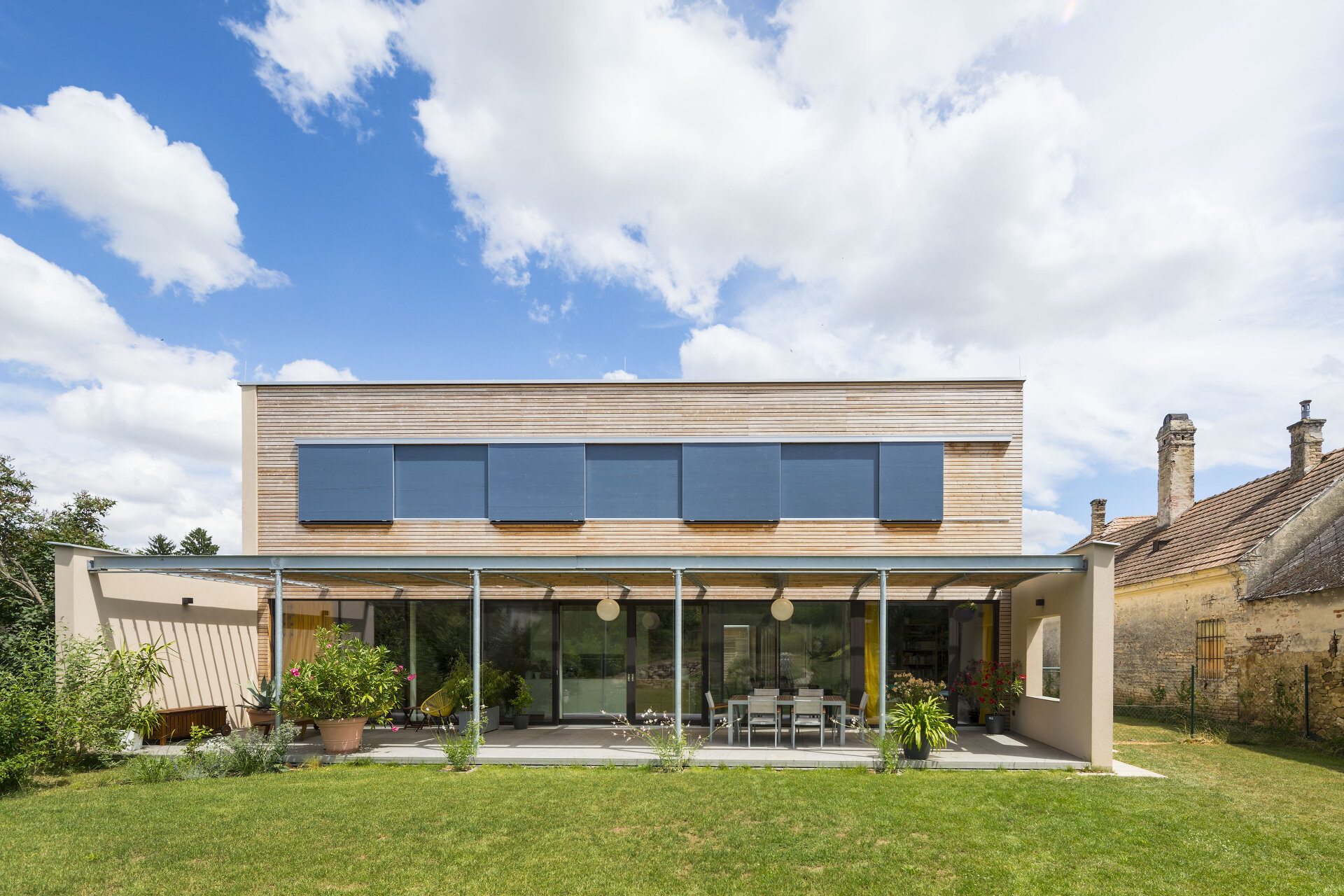 Das nach Süden orientierte, zweigeschossige Wohngebäude ist im Erdgeschoß zur Gänze verglast, um eine ungehinderte Verbindung zwischen Innen- und Außenraum zu gewährleisten. Als Sonnenschutz dient eine Stahlpergola, die textile Beschattungselemente aufnimmt.