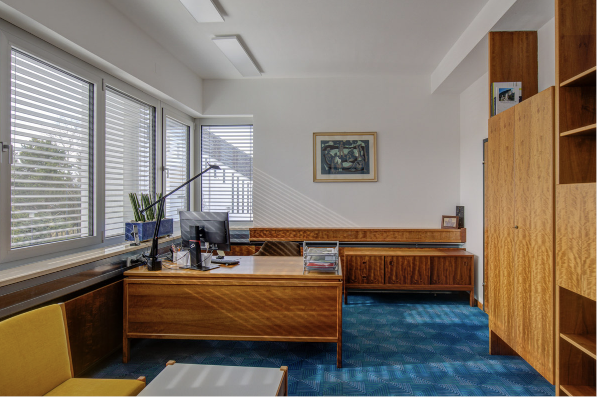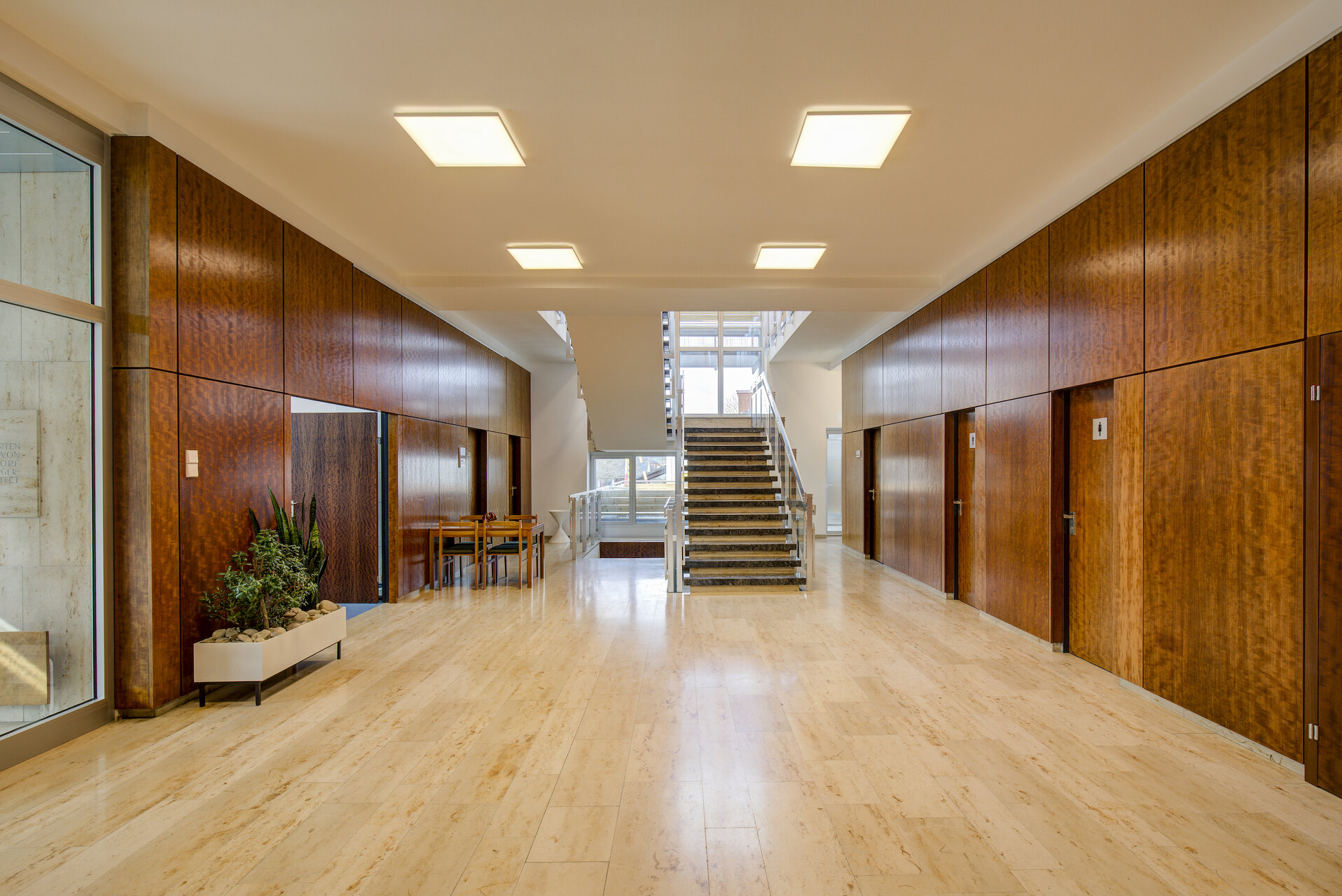 Die ungedämmten Bandfenster und deren Beschattung wurden vollständig ersetzt und dabei ein dem original kohärenten Gesamteindruck aufrechterhalten. Die restliche Fassade sowie das Untergeschoß wurden konsequent innen mit Glasschaumplatten wärmegedämmt und damit die aussenliegenden schlanken Stützen und den grossformatigen Keramikplatten im Originalzustand erhalten. Im Sinne der beanspruchten Nachhaltigkeit wurde das Heizsystem von Gas (ursprünglich ÖL) auf Nahwärme umgestellt. Die elektrischen und haustechnischen Installationen erneuert und das Lichtsystem konsequent auf LED umgestellt.