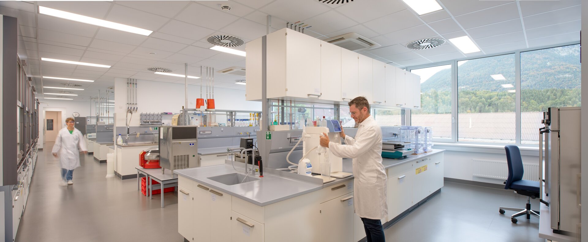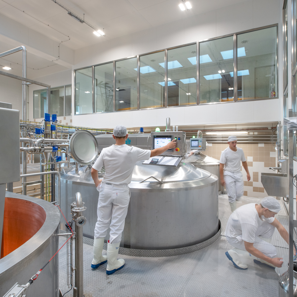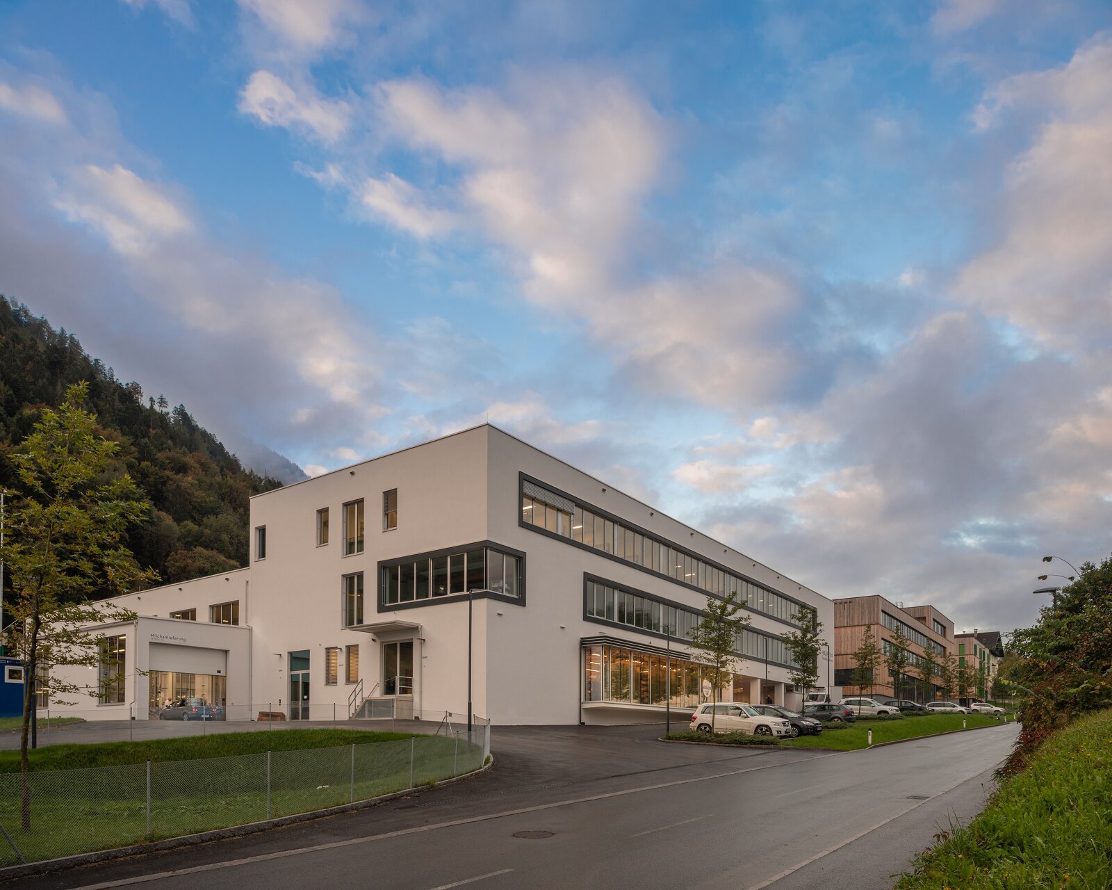 Östlich der Schule liegt das ebenfalls über U-förmigem Grundriss aufgeführte Gebäude für Forschung & Service, das aufgrund der Hygienevorschriften komplett in Beton errichtet wurde. In dem Seitenschenkel Richtung Schule liegen Labors zur mikrobiolgischen und chemischen Untersuchung von Milchprodukten, in denen auch Teile des praktischen Unterrichts stattfinden und die mittels einer Brücke an die Schule angebunden sind. Im zweiten Schenkel ist u.a. eine Käserei mit einer zweigeschoßigen Produktionshalle untergebracht, eine Galerie bietet den Besucher:innen die Möglichkeit eines Einblicks in den Produktionsprozess. Außerdem beinhaltet das Gebäude sämtliche weitere für Verwaltung und Forschung notwendigen Räumlichkeiten sowie ein Geschäftslokal für regionale Produkte. (Text: Claudia Wedekind)