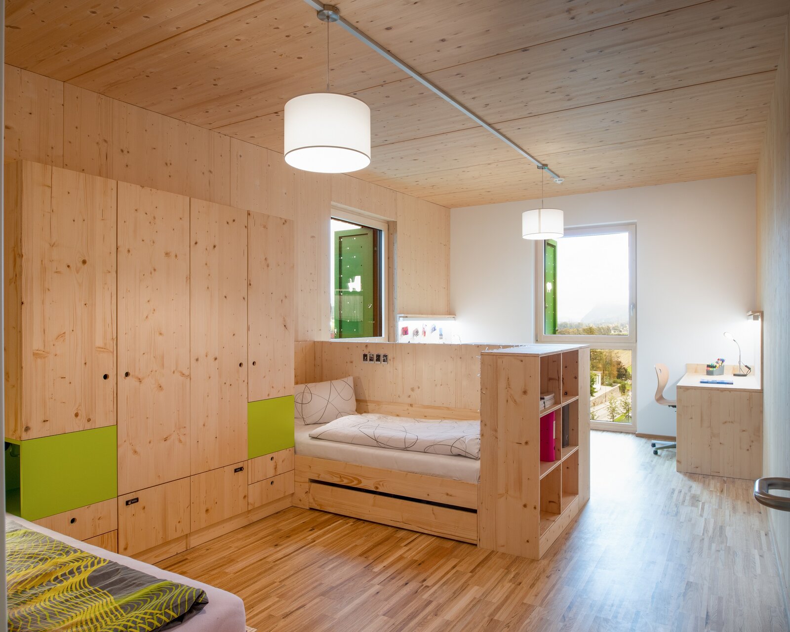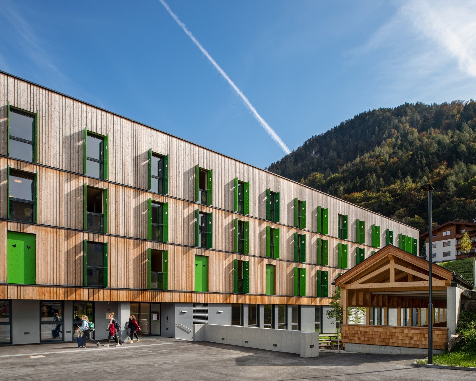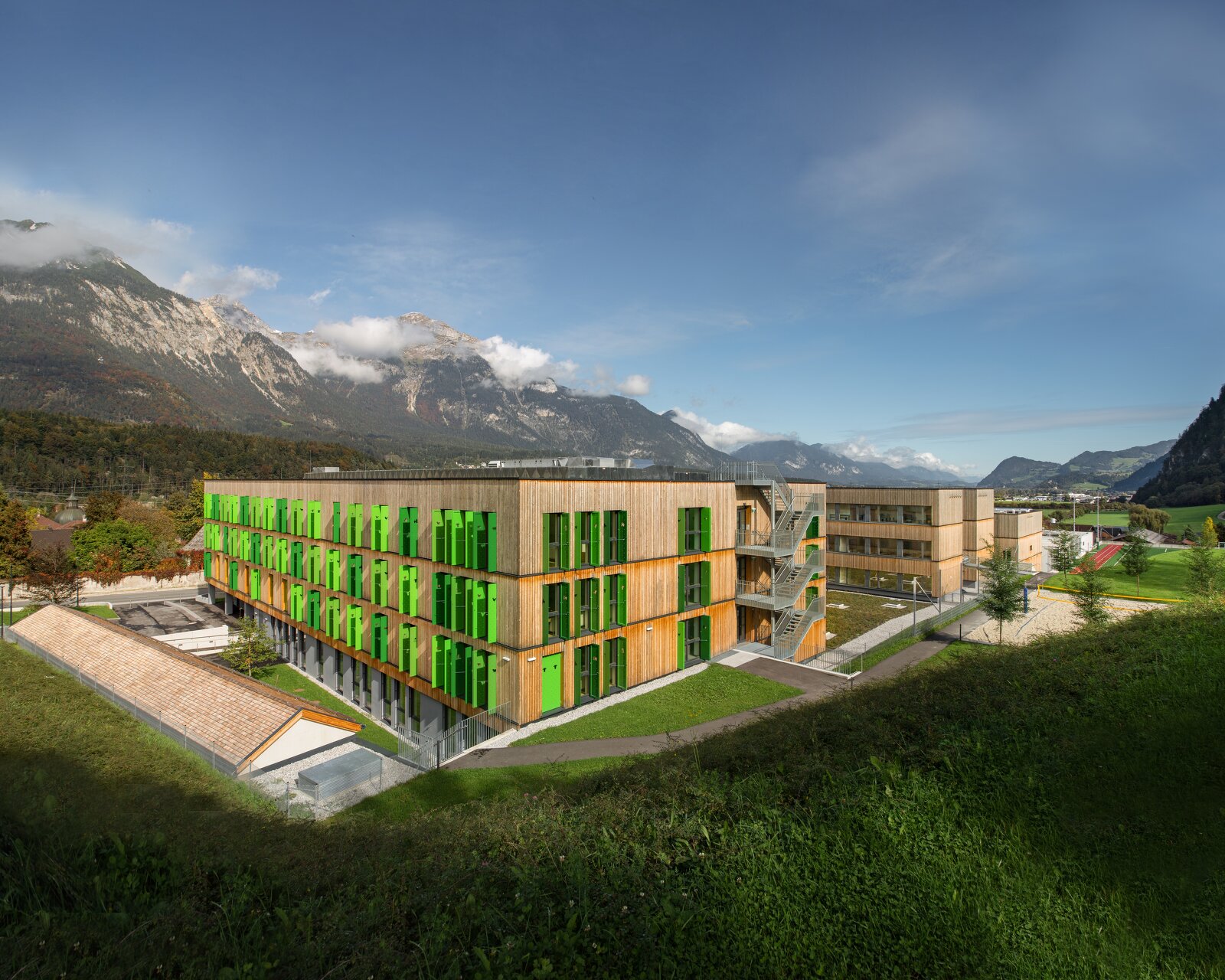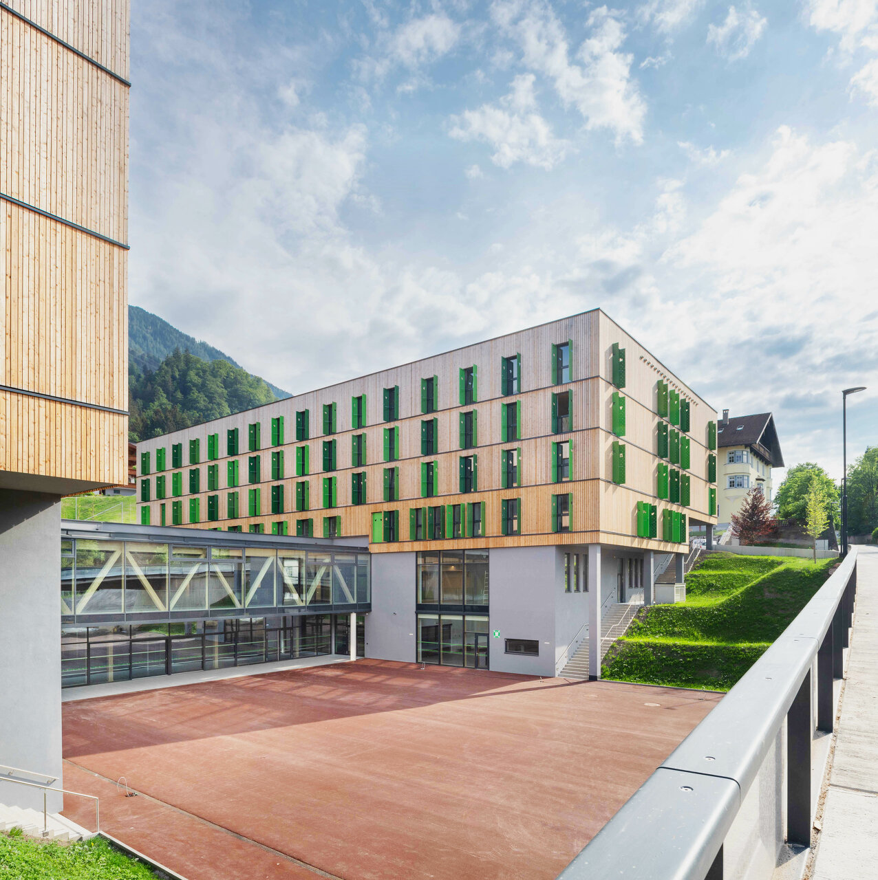 Am höchsten Punkt des Geländes steht an der westlichen Grundgrenze der riegelförmige, 6-geschoßiger Baukörper für das Internat, dessen Obergeschoße ebenfalls in Holzbauweise ausgeführt sind. Rund um einen über alle Geschoße reichenden Luftraum organisiert liegen die Wohnräume für insgesamt 200 Schüler:innen, aufgeteilt auf 50 Wohneinheiten zu jeweils zwei Zweibettzimmern mit gemeinsamer Dusche und WC. In jedem Geschoß gibt es einen gemeinsamen Aufenthaltsraum mit Teeküche, weitere Aufenthaltsmöglichkeiten gibt es im Erdgeschoß bzw. mit einer Caféteria im Untergeschoß.