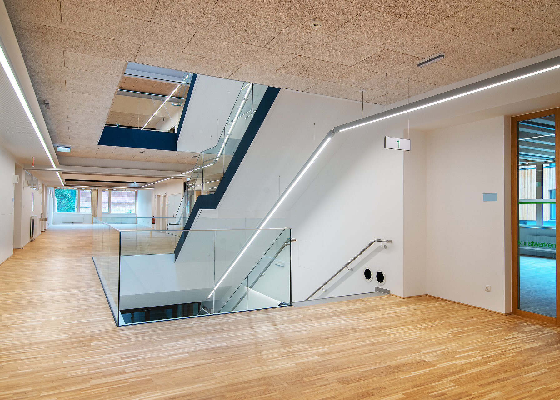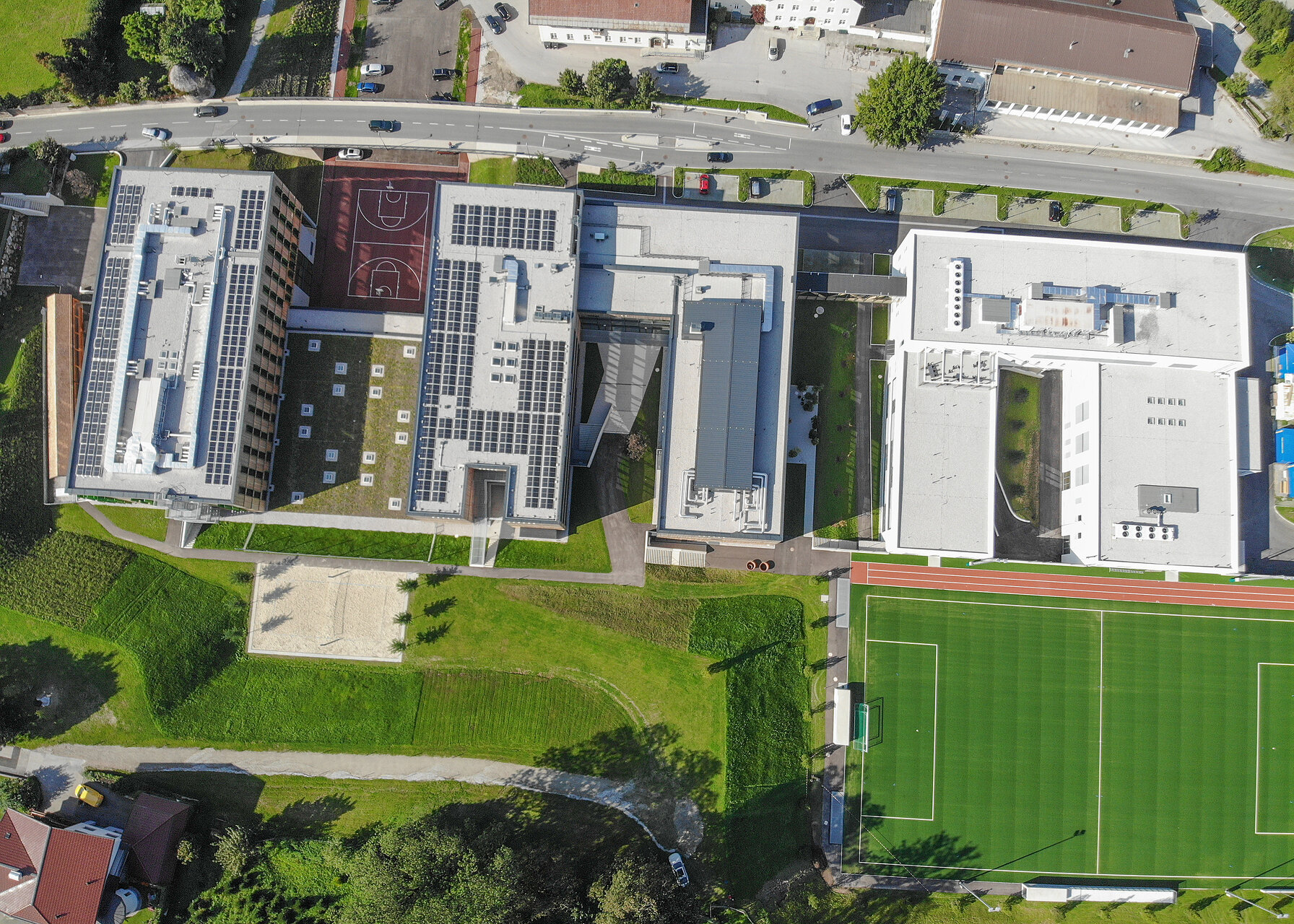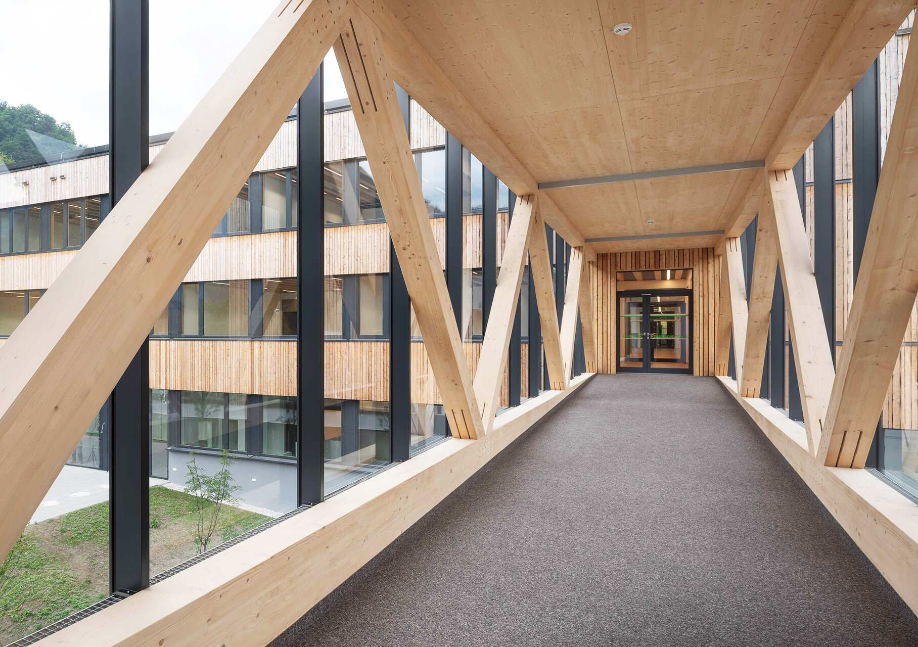 Am höchsten Punkt des Geländes steht an der westlichen Grundgrenze der riegelförmige, 6-geschoßiger Baukörper für das Internat, dessen Obergeschoße ebenfalls in Holzbauweise ausgeführt sind. Rund um einen über alle Geschoße reichenden Luftraum organisiert liegen die Wohnräume für insgesamt 200 Schüler:innen, aufgeteilt auf 50 Wohneinheiten zu jeweils zwei Zweibettzimmern mit gemeinsamer Dusche und WC. In jedem Geschoß gibt es einen gemeinsamen Aufenthaltsraum mit Teeküche, weitere Aufenthaltsmöglichkeiten gibt es im Erdgeschoß bzw. mit einer Caféteria im Untergeschoß.