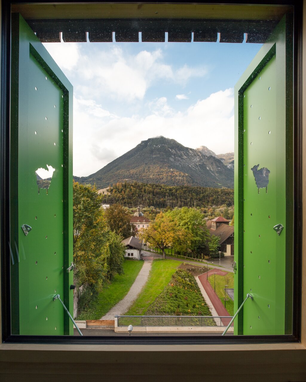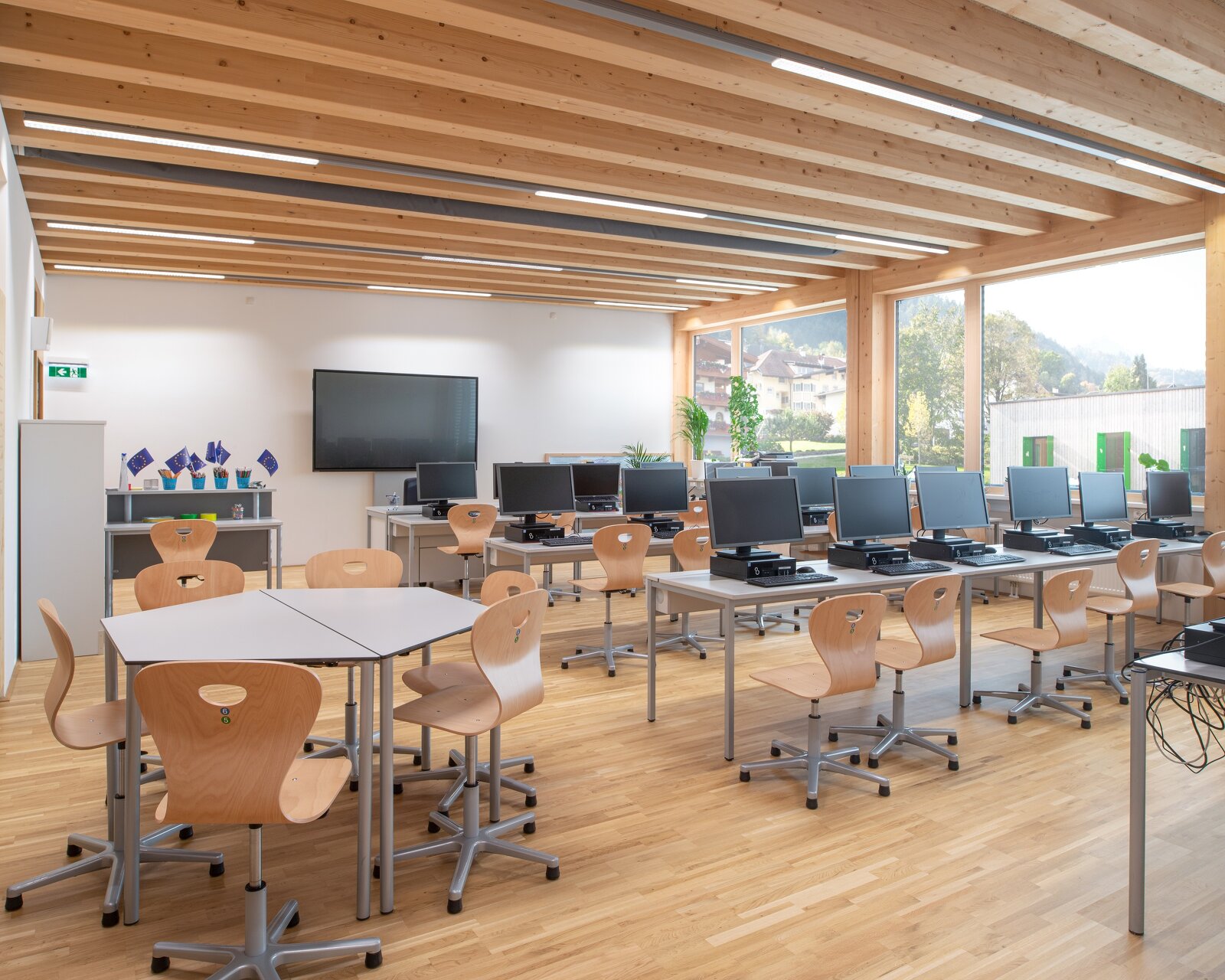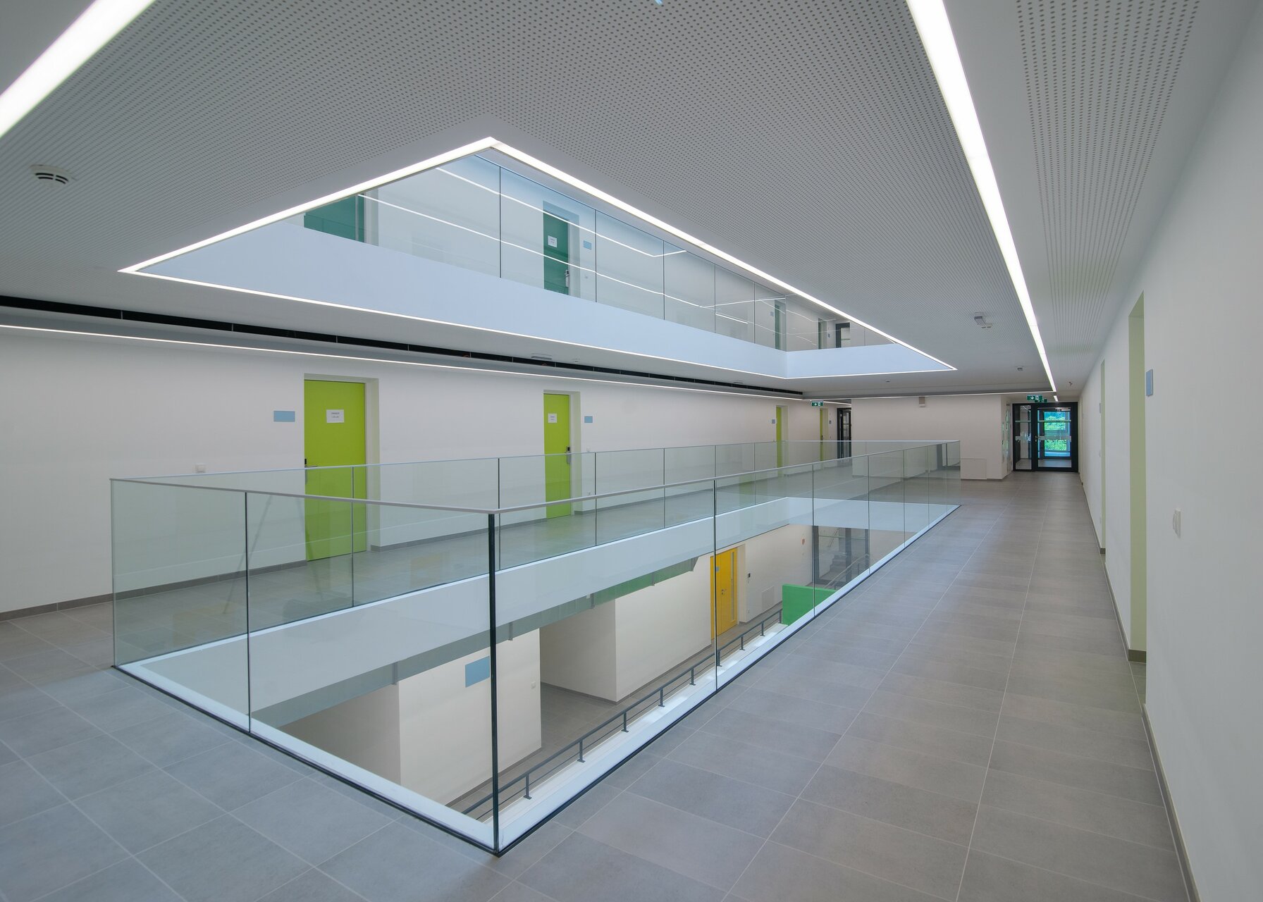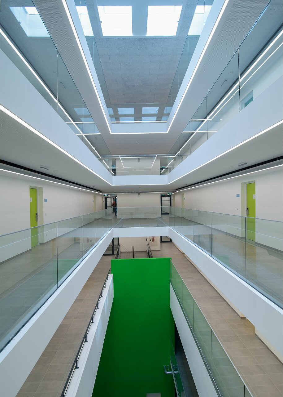 Am höchsten Punkt des Geländes steht an der westlichen Grundgrenze der riegelförmige, 6-geschoßiger Baukörper für das Internat, dessen Obergeschoße ebenfalls in Holzbauweise ausgeführt sind. Rund um einen über alle Geschoße reichenden Luftraum organisiert liegen die Wohnräume für insgesamt 200 Schüler:innen, aufgeteilt auf 50 Wohneinheiten zu jeweils zwei Zweibettzimmern mit gemeinsamer Dusche und WC. In jedem Geschoß gibt es einen gemeinsamen Aufenthaltsraum mit Teeküche, weitere Aufenthaltsmöglichkeiten gibt es im Erdgeschoß bzw. mit einer Caféteria im Untergeschoß.