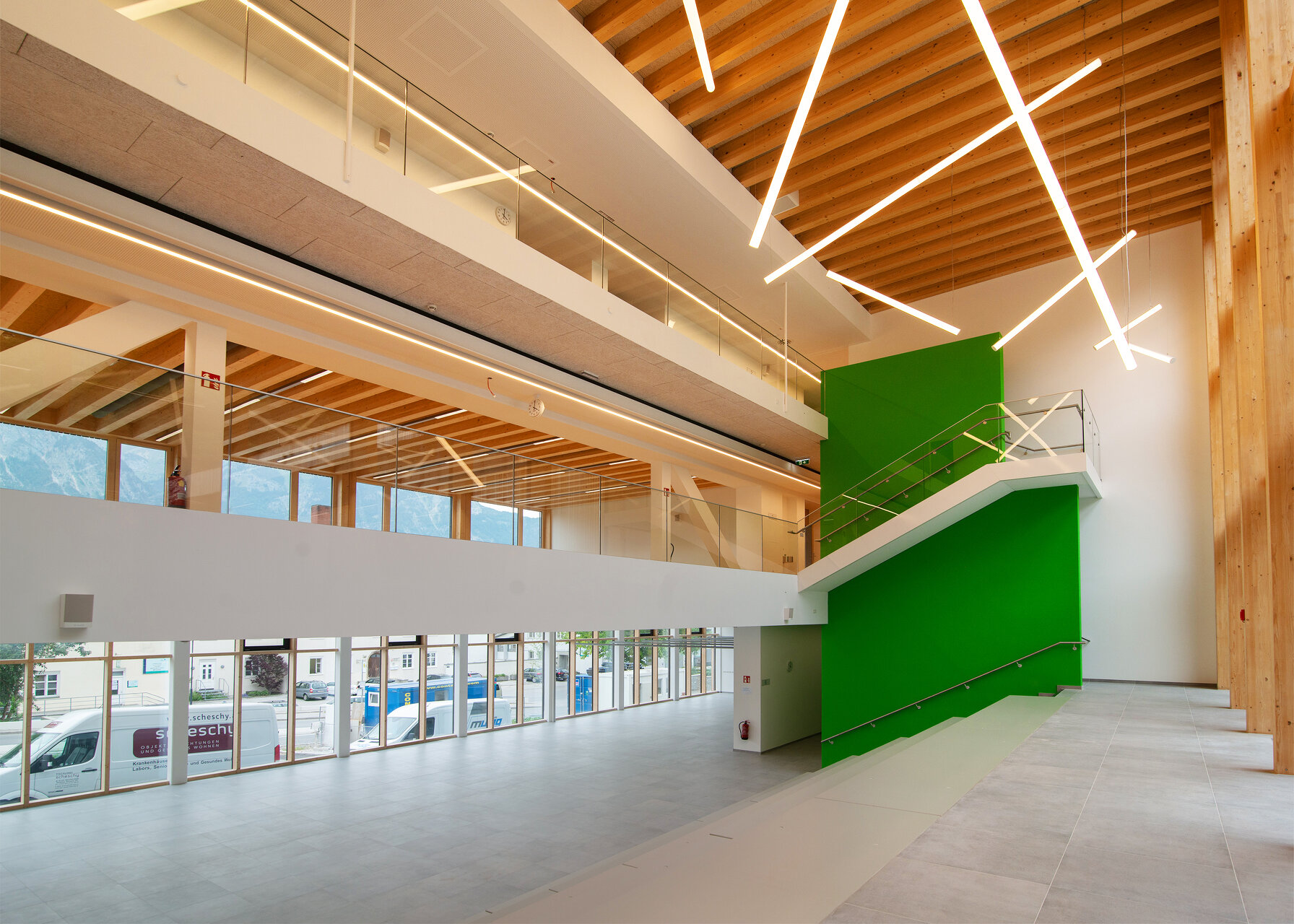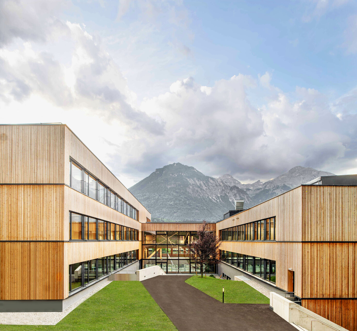 Das Zentrum bildet das U-förmige Schulgebäude, in dem etwa 500 Schüler:innen in 13 Stammklassen unterrichtet werden. Ein transparent gehaltener Mittelteil mit den allgemeinen Unterrichtsräumen verbindet die Straße über eine mehrgeschoßige Aula mit dem grünen Innenhof, in den beiden 4- bzw. 5-geschoßigen Schenkeln befinden sich die Räume für den theoretischen und praktischen Unterricht. Das in den Obergeschoßen in Holzbauweise errichtete Gebäude wird von vorgefertigten Fassadenelementen aus unbehandelten, vertikalen Lärchenholzlatten umhüllt.