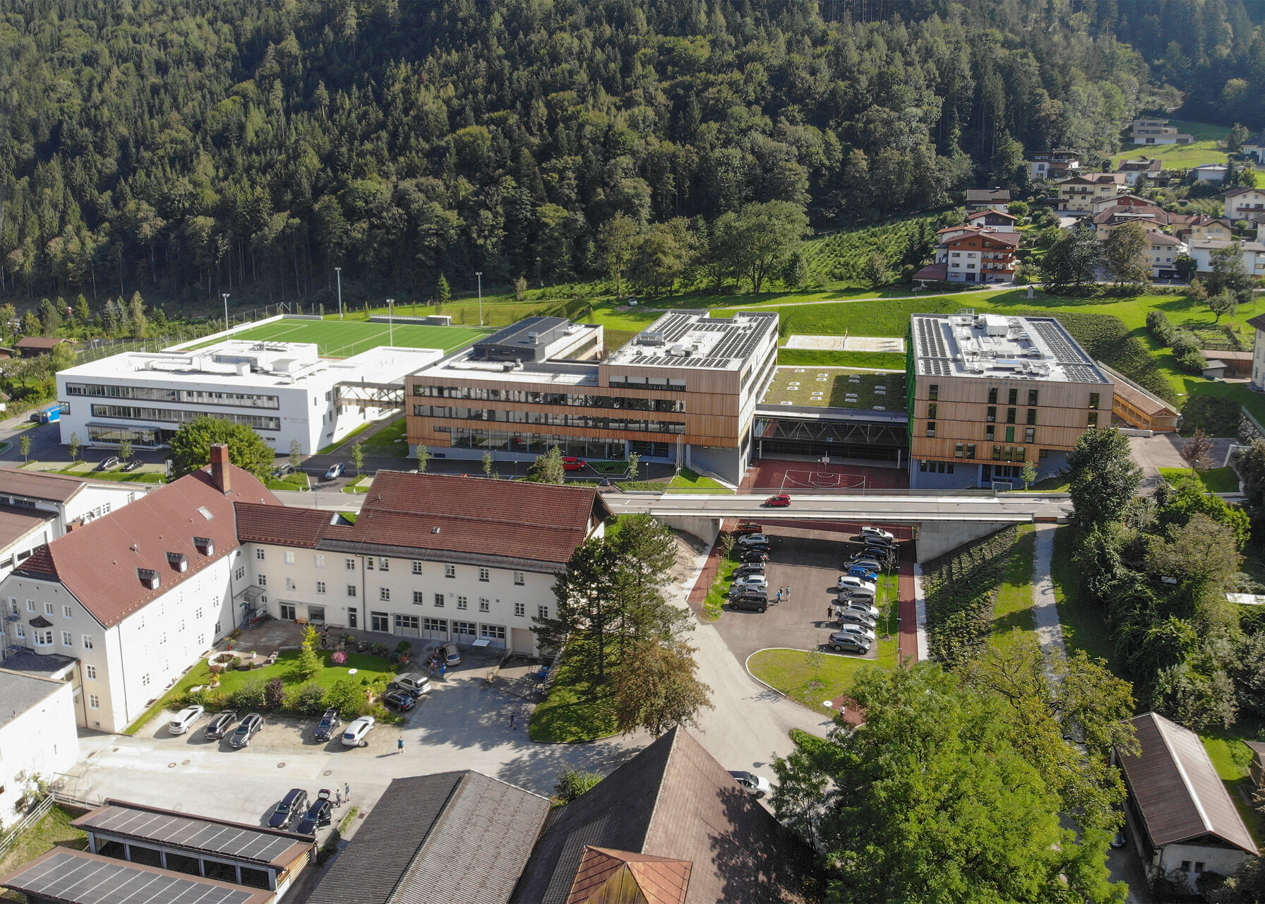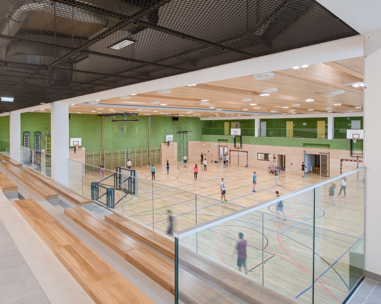 Zwischen Schule und Internat befindet sich zum einen in einem niederen, zurückversetzten Trakt die Doppelturnhalle mit einer Zuschauergalerie im Obergeschoß, die zugleich Verbindung zwischen Schule und Internat ist. Zum anderen bildet hier ein multifunktional nutzbarer „Festplatz“ das Herzstück des neuen Schulcampus. Von diesem aus werden Schule und Internat erschlossen, die Turnhalle kann zum Platz hin geöffnet werden und eine breite Unterführung unter der Landesstraße verbindet den Platz mit der gegenüberliegenden Landwirtschaftlichen Lehranstalt.