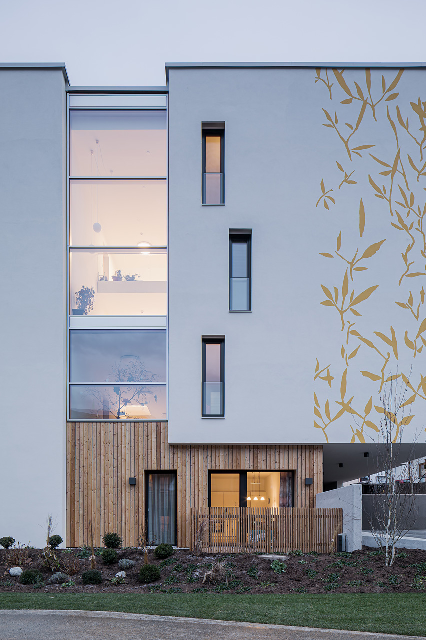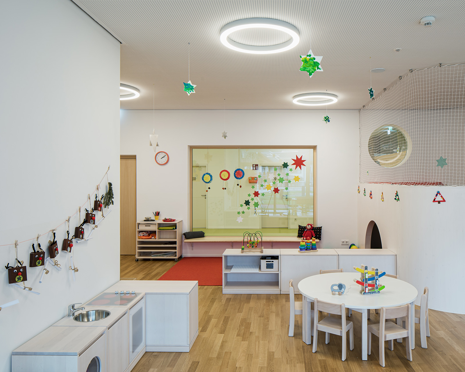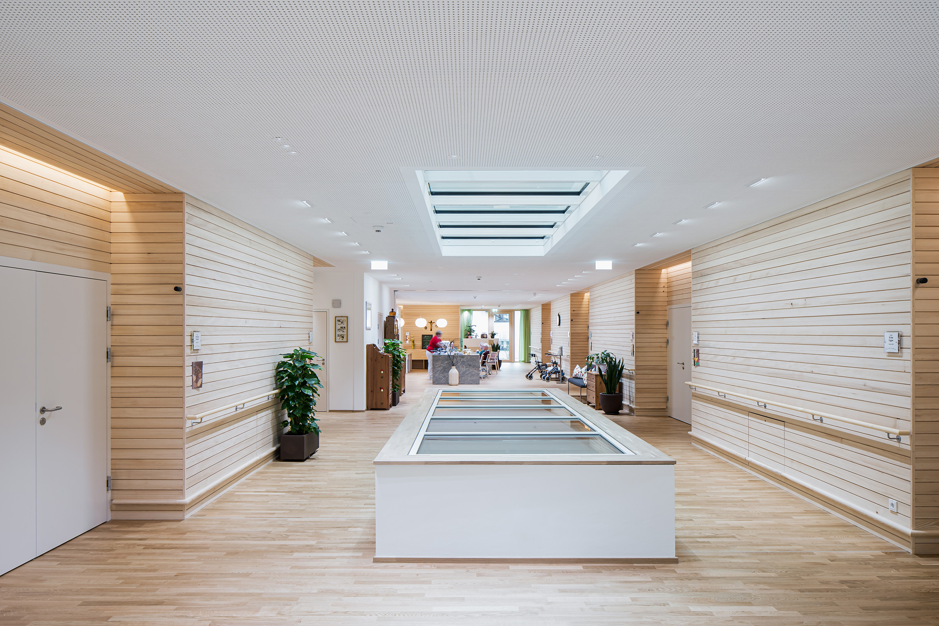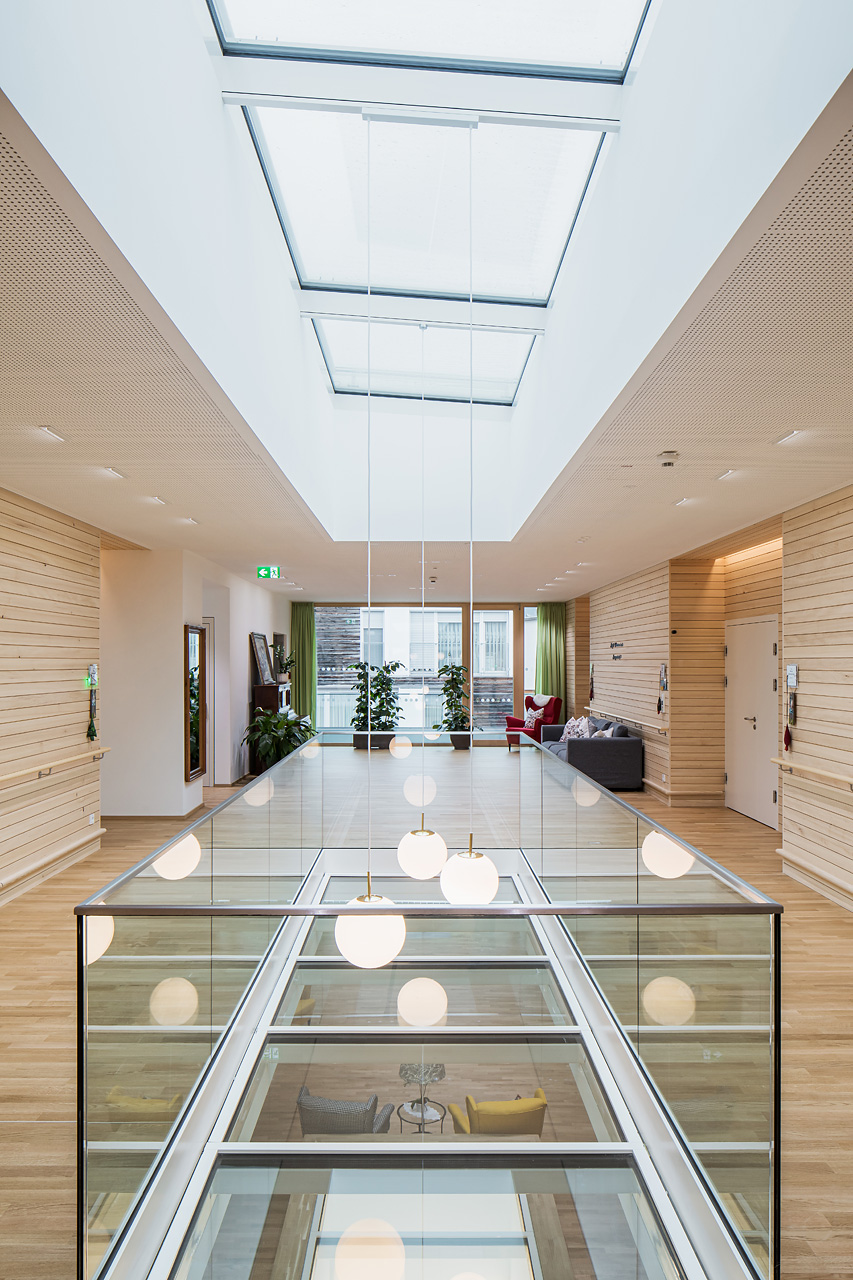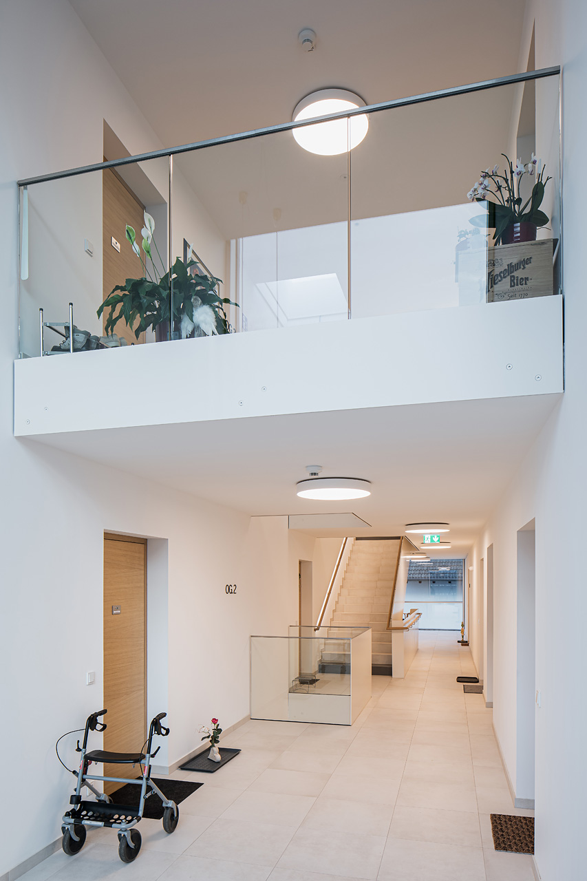 Der Neubau für das Betreute Wohnen – ein viergeschoßiger, weiß verputzter Baukörper – sitzt an der Hangkante und schließt so den Straßenraum des Knappenangers. Insgesamt 20 Kleinwohnungen für Menschen mit leichtem Pflegebedarf verteilen sich auf die Wohngeschoße, die jeweils von einem breiten, durchgestreckten Mittelflur erschlossen werden. Dessen verglaste Enden erleichtern die Orientierung im Haus, können als Art Wintergarten genutzt werden und sind bei Bedarf auch potentielle Erweiterungsfläche. Eine große, helle Begegnungs- und Gemeinschaftszone im Erdgeschoß erweitert das Angebot für die hier lebenden Menschen.