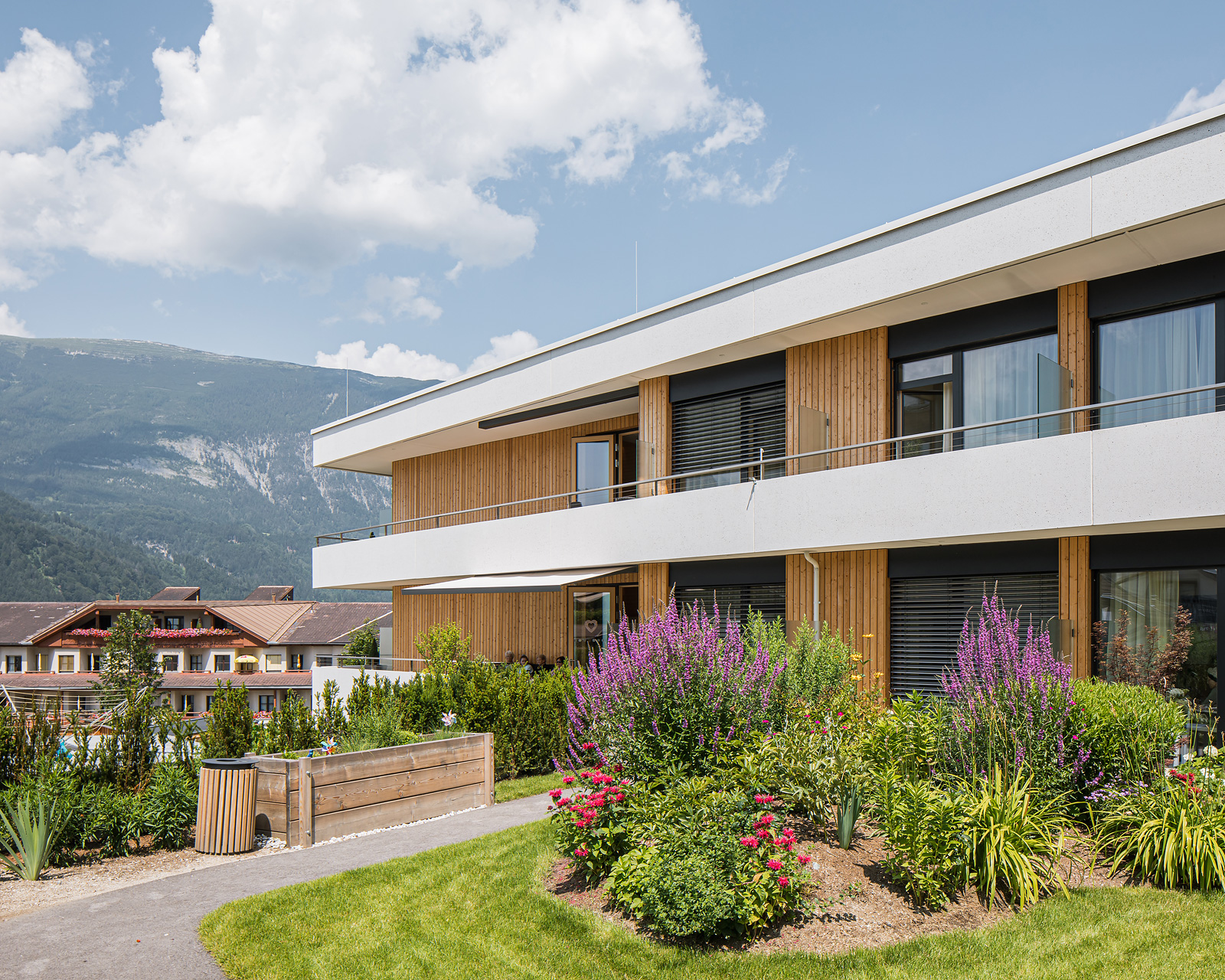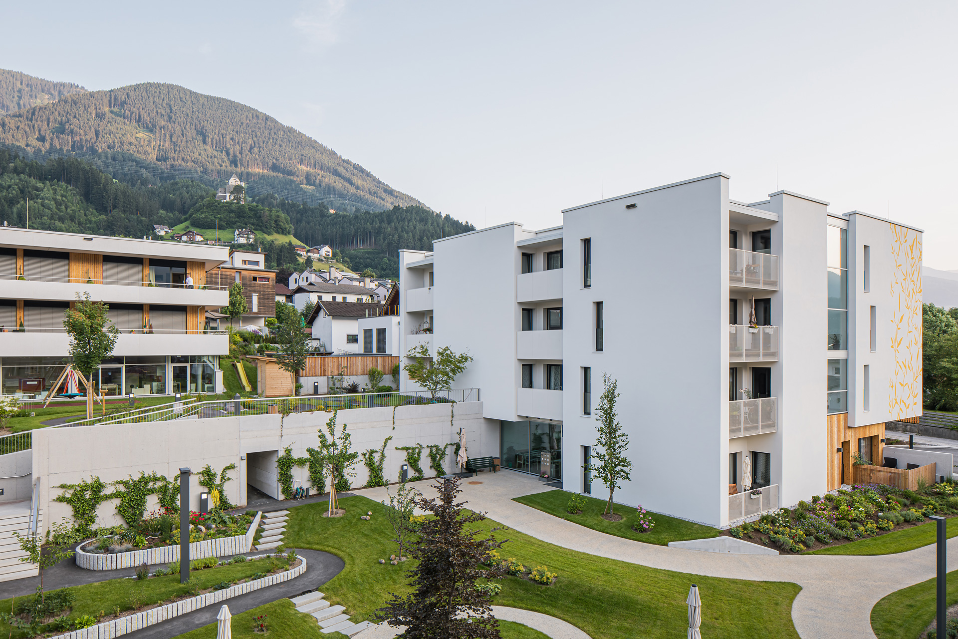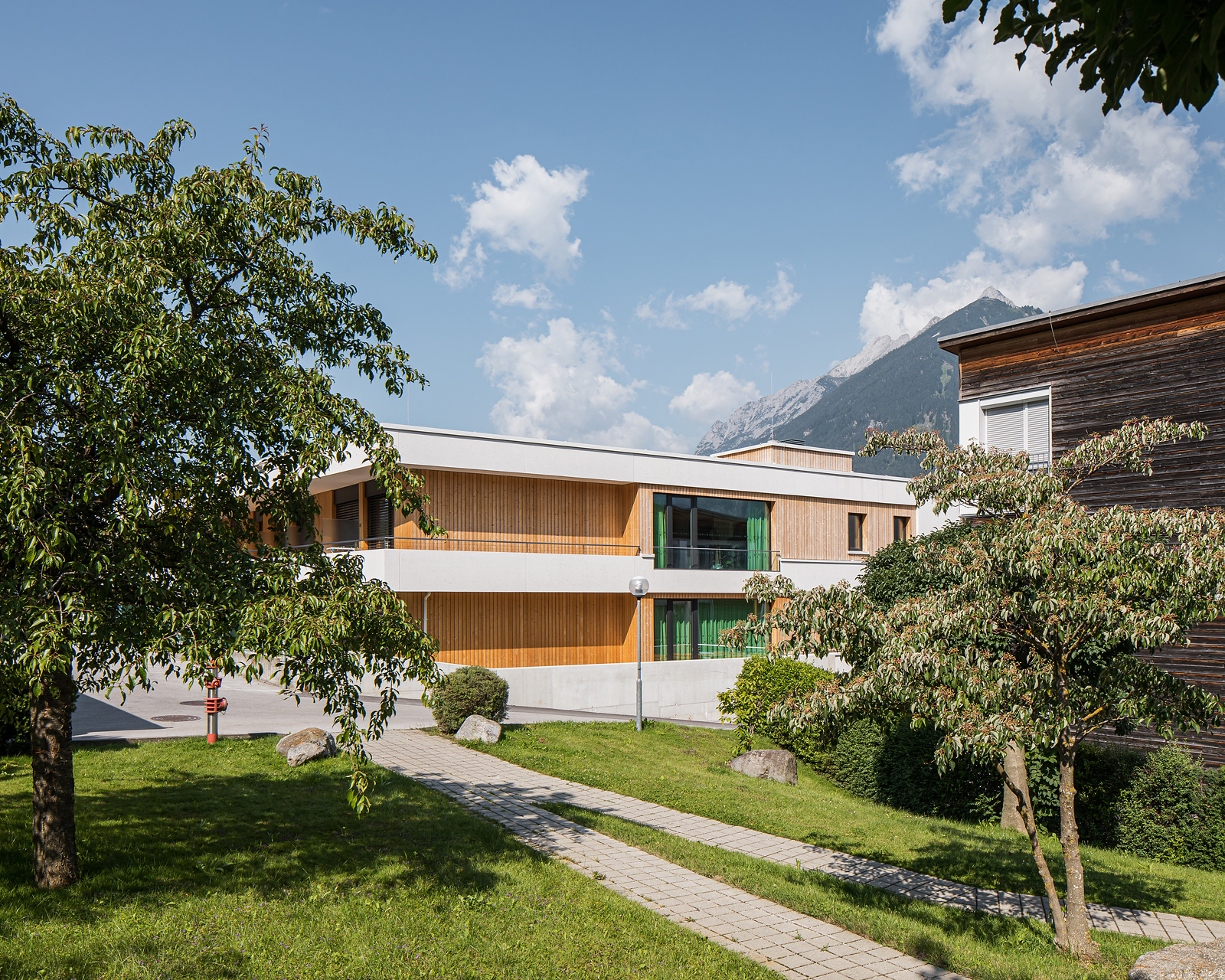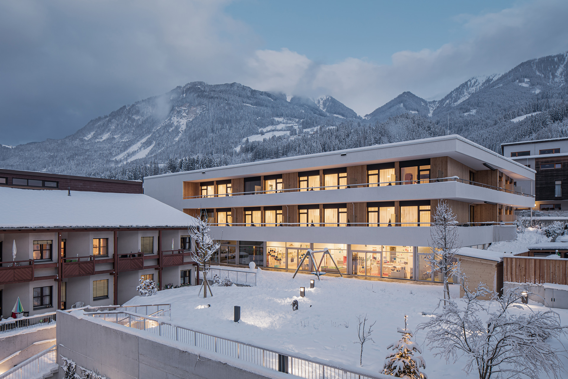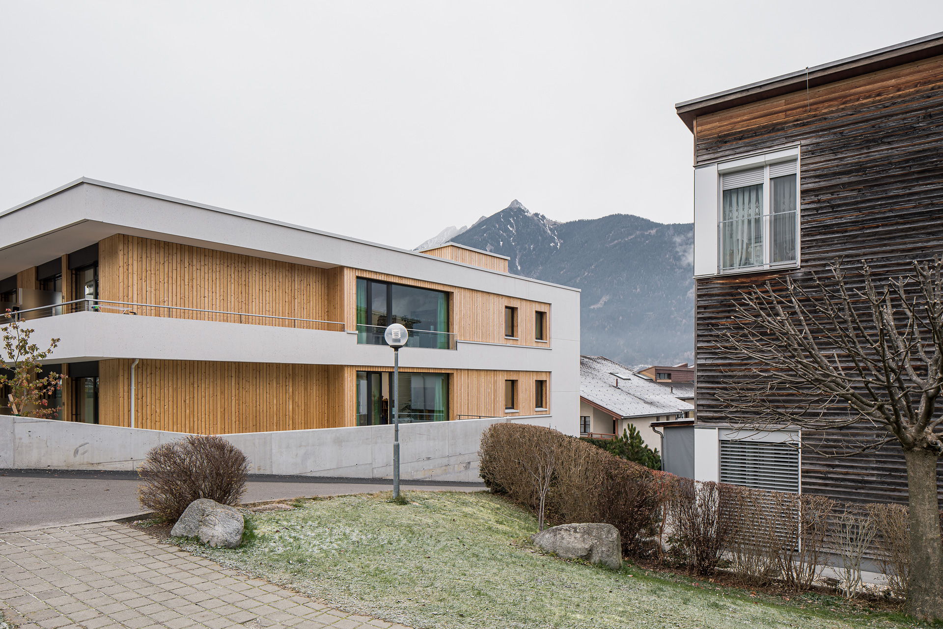 Das unter dem Namen „Silberhoamat Knappenanger“ betriebene Altenwohnheim ist eine von drei Einrichtungen des aus 8 Schwazer Gemeinden bestehenden Altenheimverbands Schwaz und Umgebung. Ein Grundstück südlich des in den 1980er-Jahren errichteten Haupthauses wurde bereits in den 1990ern vom Verband für eine spätere Erweiterung erworben, mit dem Kauf eines weiteren Nachbargrundstücks 2017/18 entstand die Idee der Integration einer Hauses für Betreutes Wohnen. Mit den beiden, von Adam Architektur und Fessler Architekten errichteten, jeweils aus Architekturwettbewerben hervorgegangenen Neubauten entstand nunmehr am Knappenanger ein Gebäudeensemble, in dem Menschen in allen Lebensphasen wohnen und arbeiten.Die Erweiterung des Altenwohnheims um 30 Zimmer wurde nach dem Konzept einer „Villa im Grünen“ umgesetzt. Der dreigeschoßige, durch Balkonbänder und ein vorspringendes Flachdach horizontal strukturierte Solitär stellt in seiner Höhenentwicklung den Übergang zur Nachbarbebauung her und nutzt die ansteigende Topografie für ebenerdige Bezüge zum Außenbereich im Erdgeschoß bzw. im ersten Obergeschoß. In den beiden Obergeschoßen liegt jeweils eine Wohngruppe mit einem zentralen Wohn- und Essbereich, der sich nach drei Seiten in den Außenraum öffnet. Rund um diese, auch von oben belichtete Begegnungszone gruppieren sich die Zimmer in drei, in unterschiedliche Himmelsrichtungen orientierten Gruppen. Jedes Zimmer verfügt über einen privaten Balkon, der zusammen mit den gemeinschaftlich nutzbaren Terrassen den Bewohner:innen unterschiedlichste Bereiche zum Verweilen bietet. Im Erdgeschoß wurde ein kleiner, dreigruppiger Kindergarten integriert, der sich auf Gartenniveau nach Norden auf eine überdachte Terrasse und die Spielwiese öffnet. Über eine unterirdische Verbindung ist der Erweiterungsbau direkt an den Bestand angebunden.