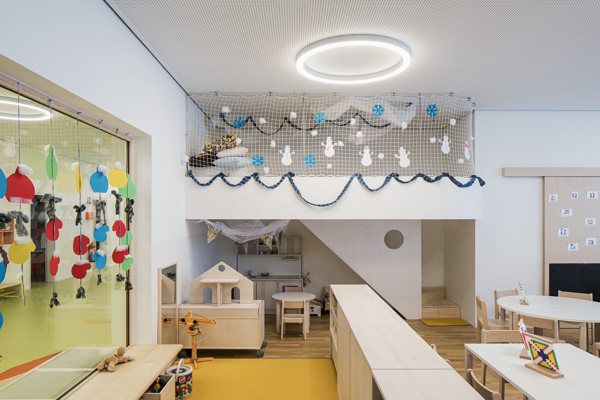 Der Freiraum zwischen Alt- und Neubauten wurde als „Dorfplatz“ neu gestaltet. In der auf zwei Ebenen liegenden, durch Stiegen und Rampen verbundenen, parkartigen Fläche können sich die Bewohner:innen treffen und auch die Aktivitäten der Kindergartenkinder miterleben. (Text: Claudia Wedekind)
