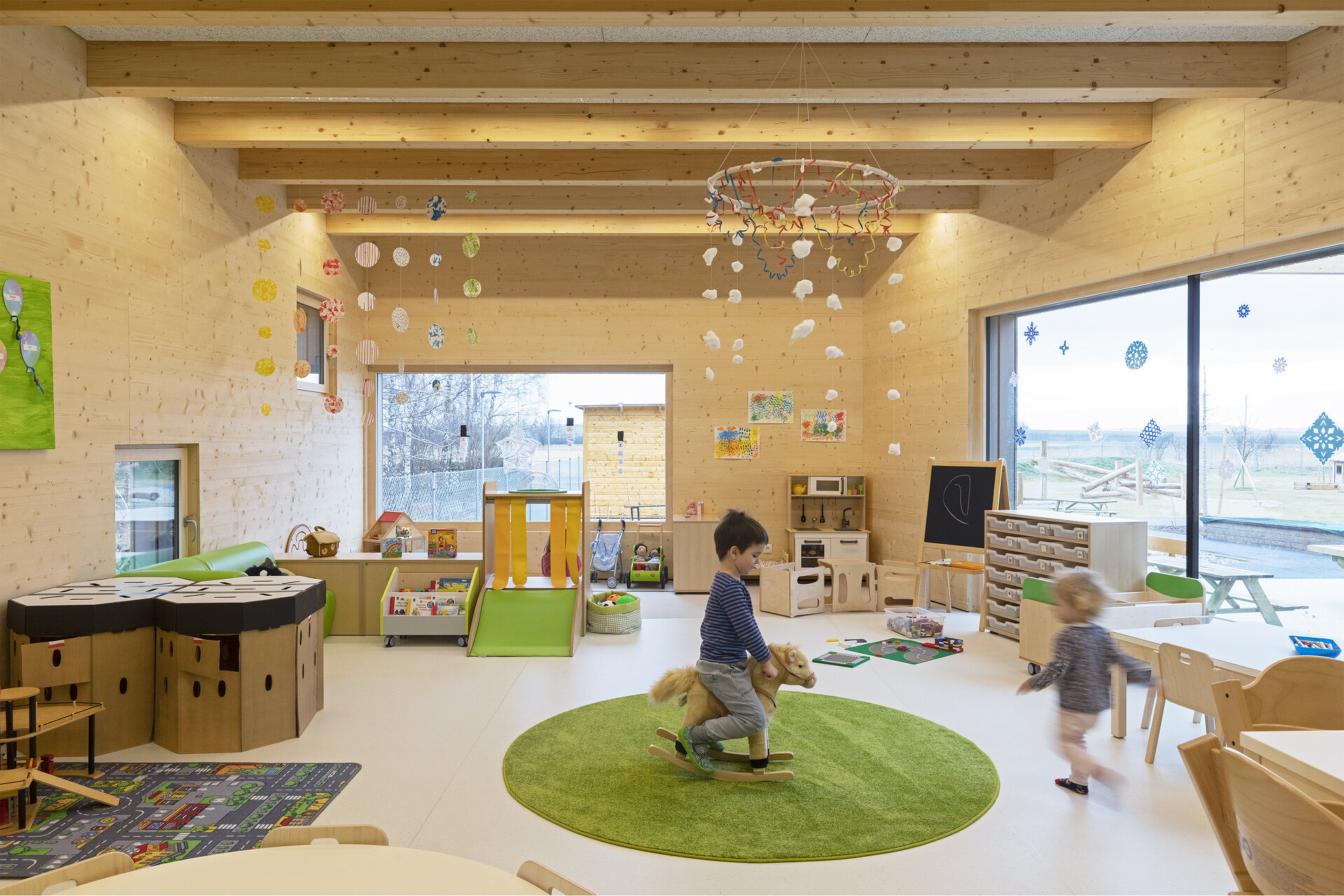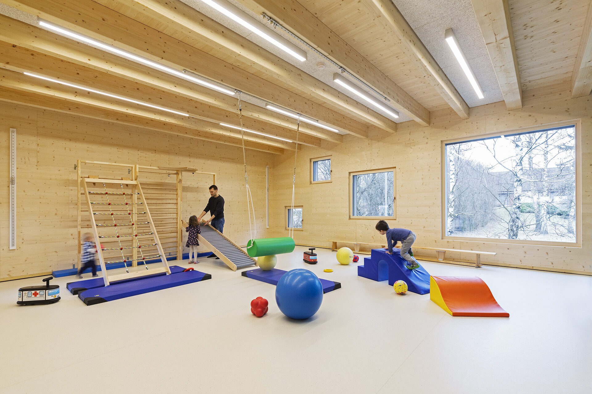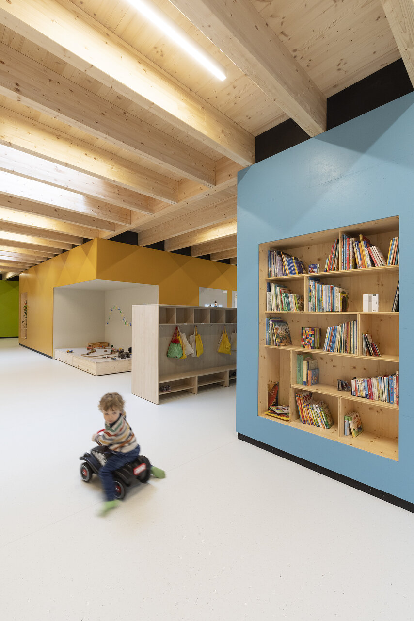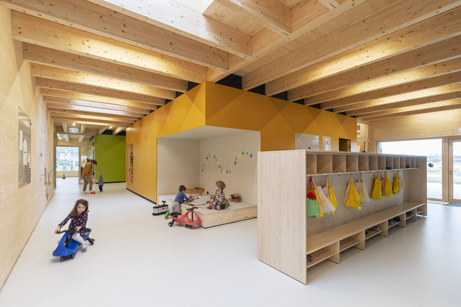 Die frei liegenden Holzbalken bereichern die Wahrnehmung um Rhythmus und Struktur und zeigen, wie die Konstruktion aufgebaut ist – vielleicht nehmen die Kinder dabei Ideen für ihr Spielen mit oder gar eine Ahnung von Konstruktion oder Gefügtheit.