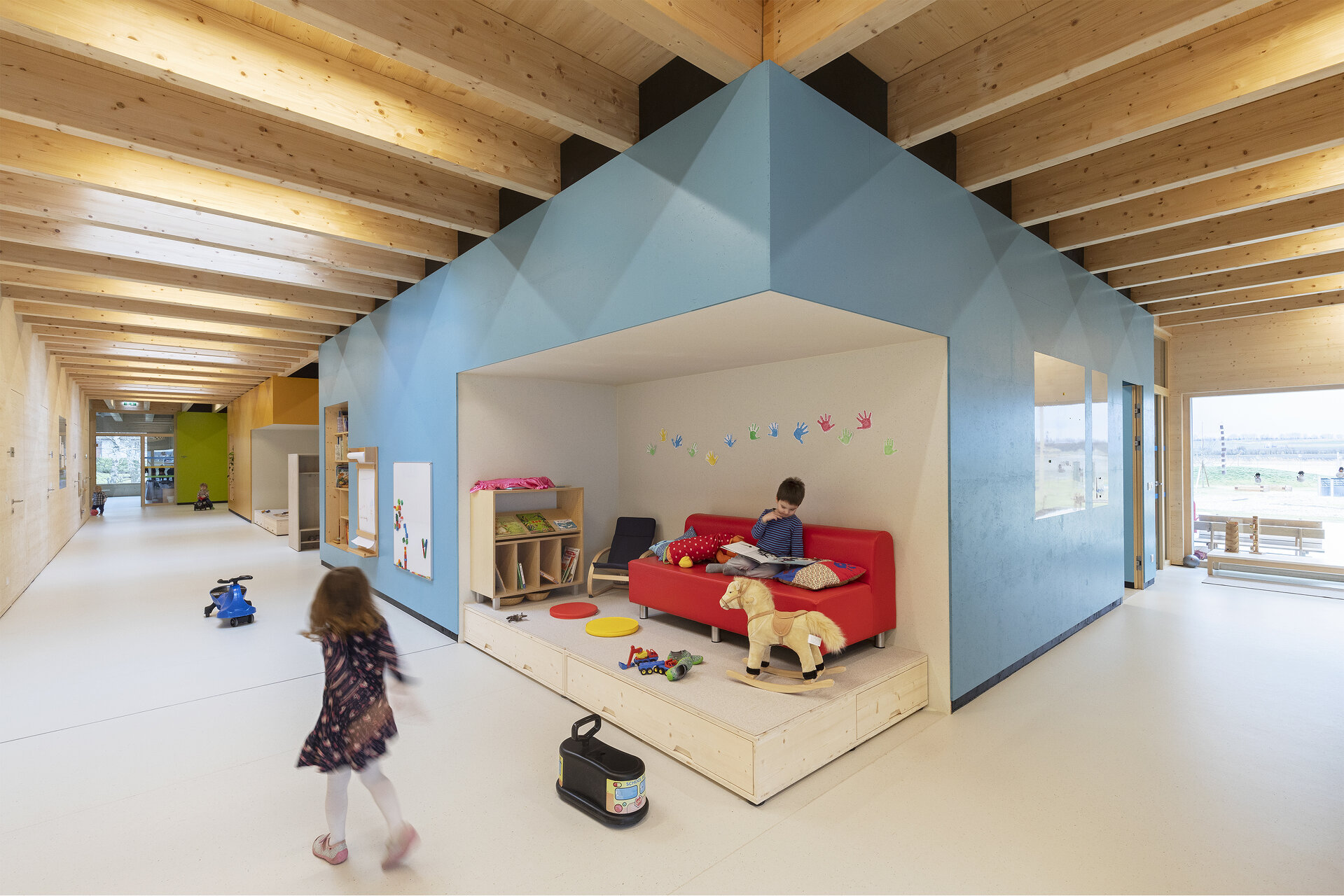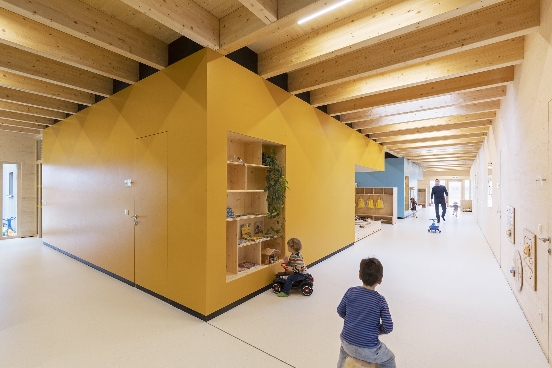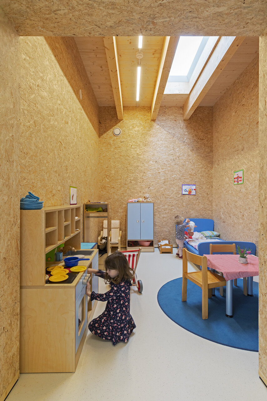 Der stark verbreiterte Flurbereich bietet unter Oberlichtern unterschiedliche Spielflächen. Einbauregale dienen als Bibliothek, Spielnischen zum Bilderbuchschauen oder Eisenbahnspielen. Von der „Dorfstraße“ gelangen die Kinder in ihre drei Häuser, die Gruppenräume, jeweils mit privateren Rückzugsnischen, die die Kinder als Schlafkojen oder Spielküche nutzen. Interaktion, aber auch Rückzug ist jederzeit möglich.