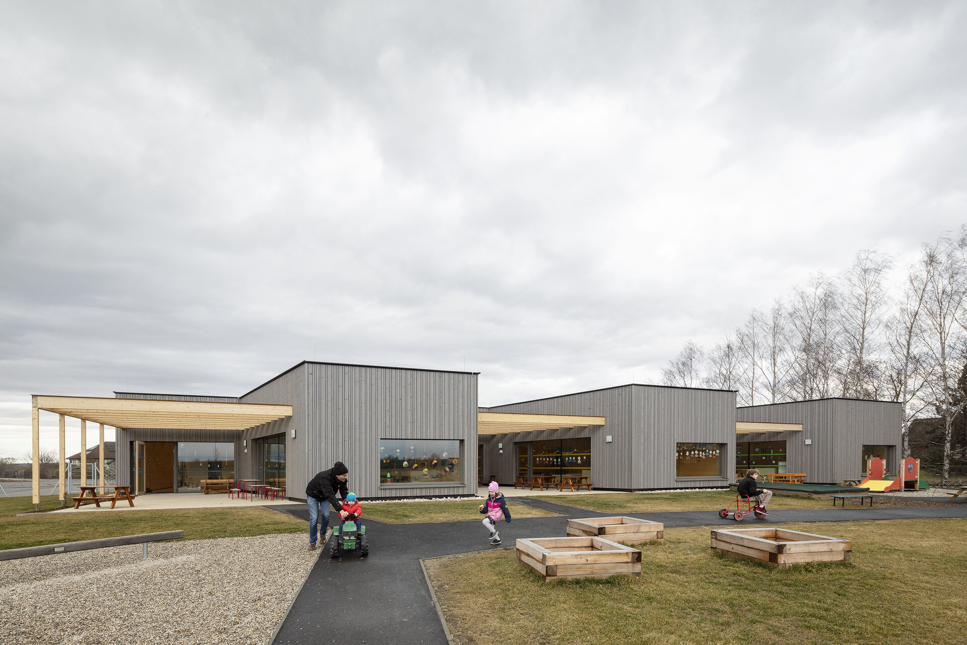 Die drei Gruppenräume sind dreiseitig belichtet und verfügen jeweils über einen Zugang zu einem eigenen schattigen Spielbereich mit Pergola im Freien, der sich gut überblicken lässt.