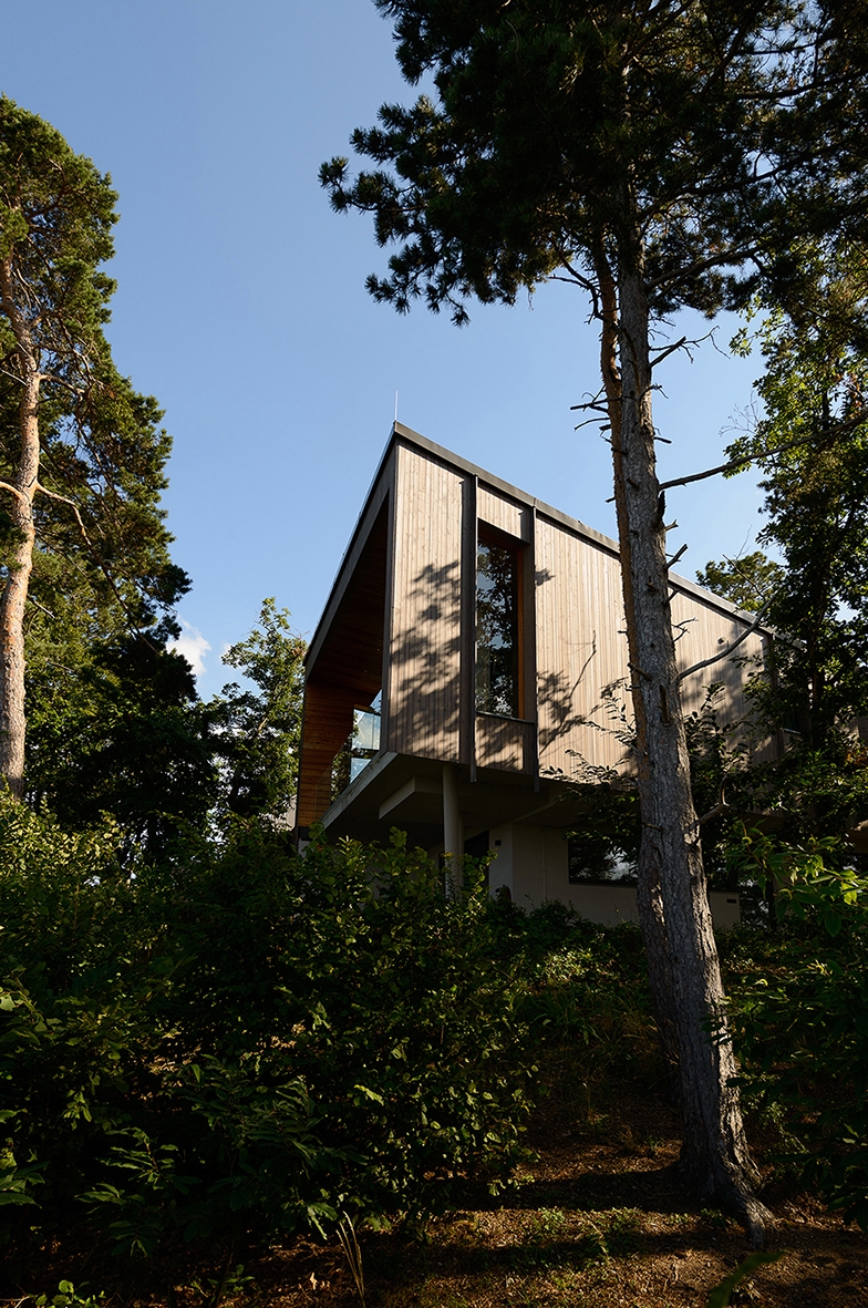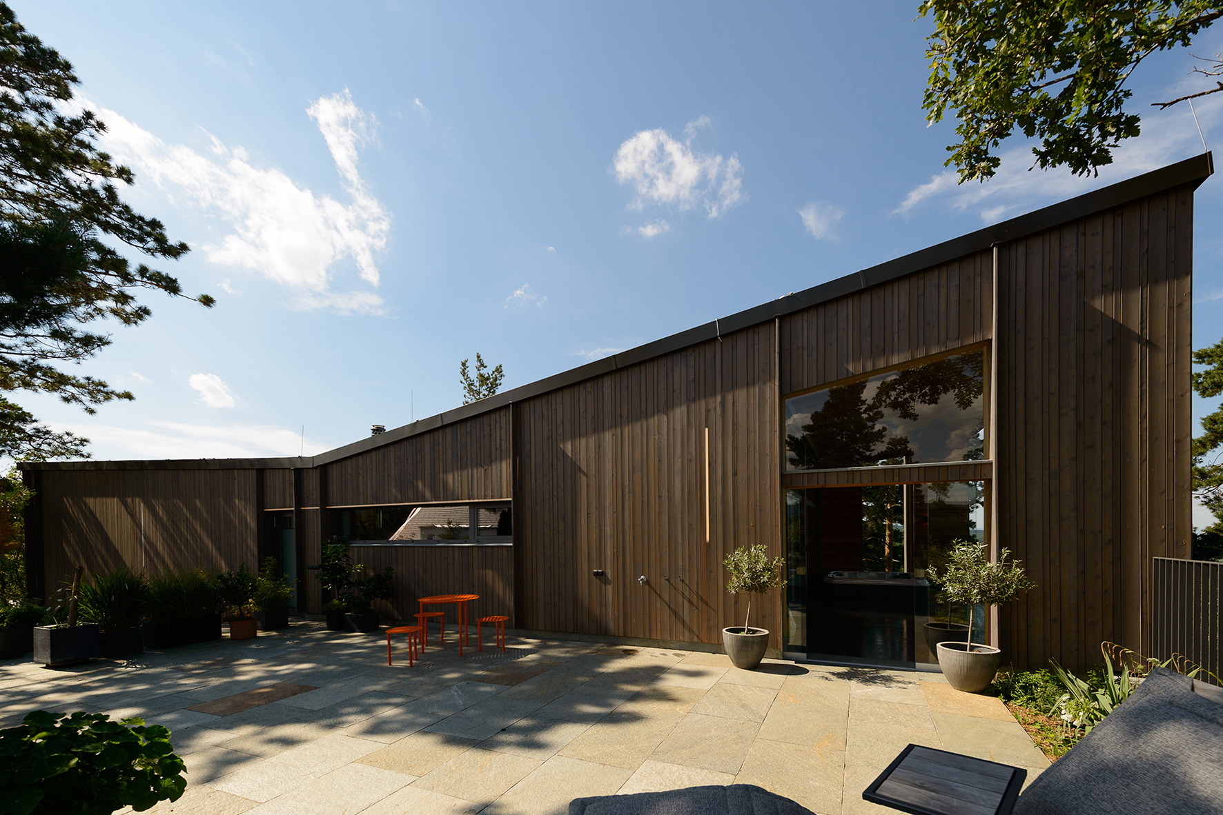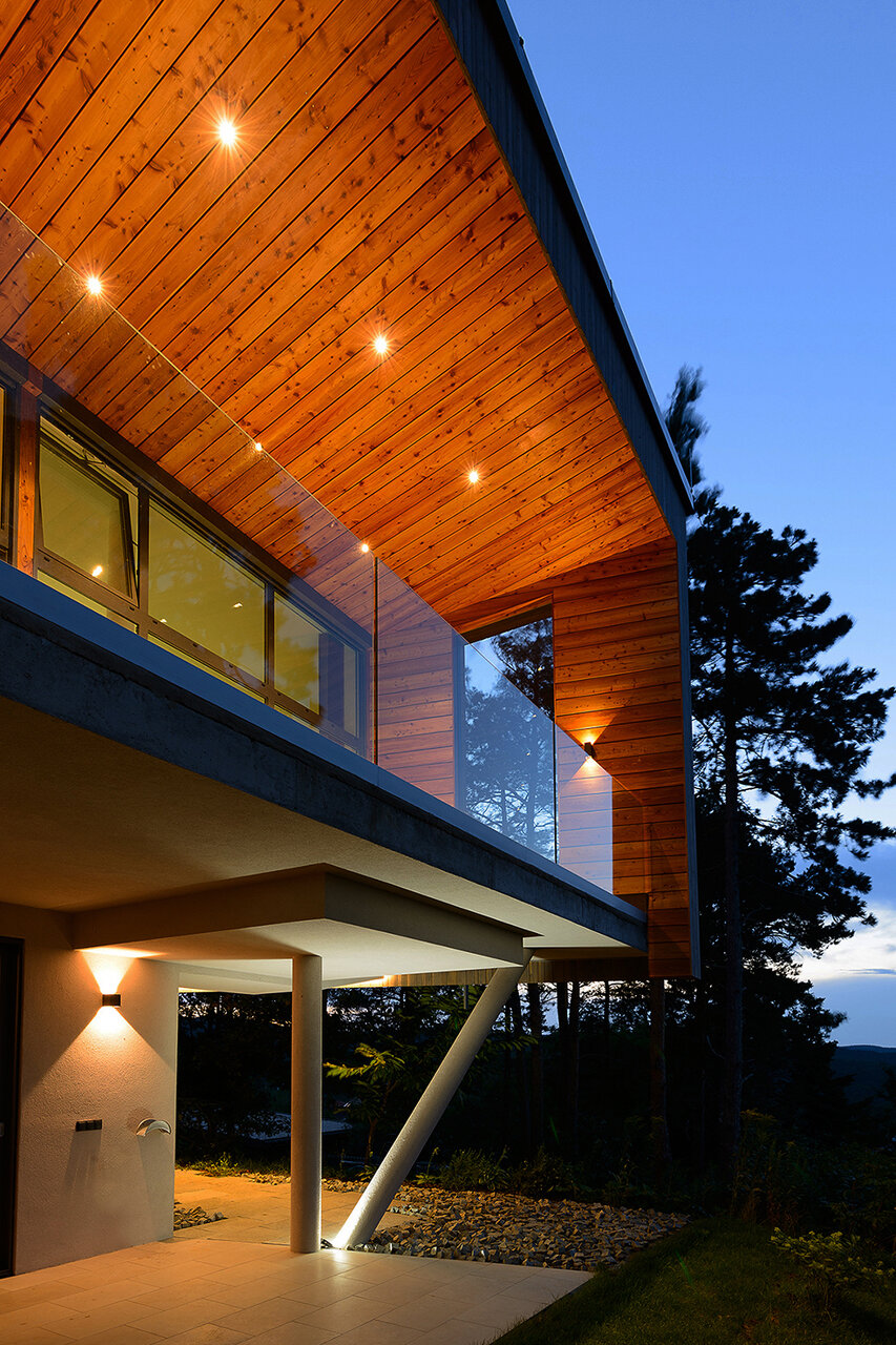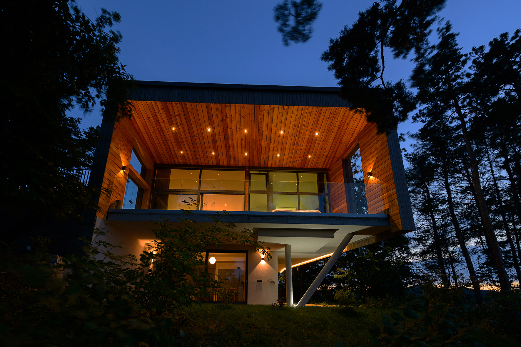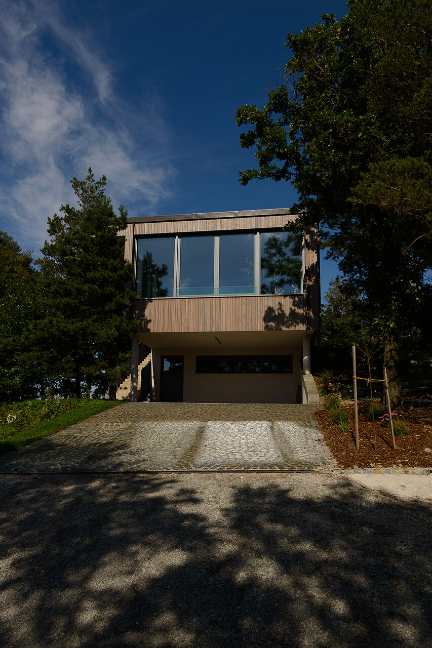 Der zweiteilige Baukörper ist Ost-West-orientiert. Ein Körper - zwei Richtungen: Wir nennen sie „Bergblick“ nach Westen und „Talblick“ oder „Fernblick“ nach Osten. Vom Wohnzimmer und von der Terrasse aus überblickt man fast die gesamte Wulkaebene bis zum Neusiedler See. An klaren Tagen ermöglicht die Lage einen Fernblick von 52 km Luftlinie.