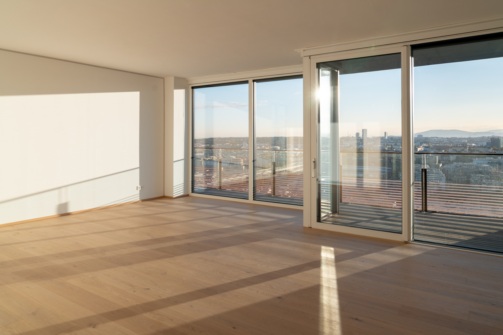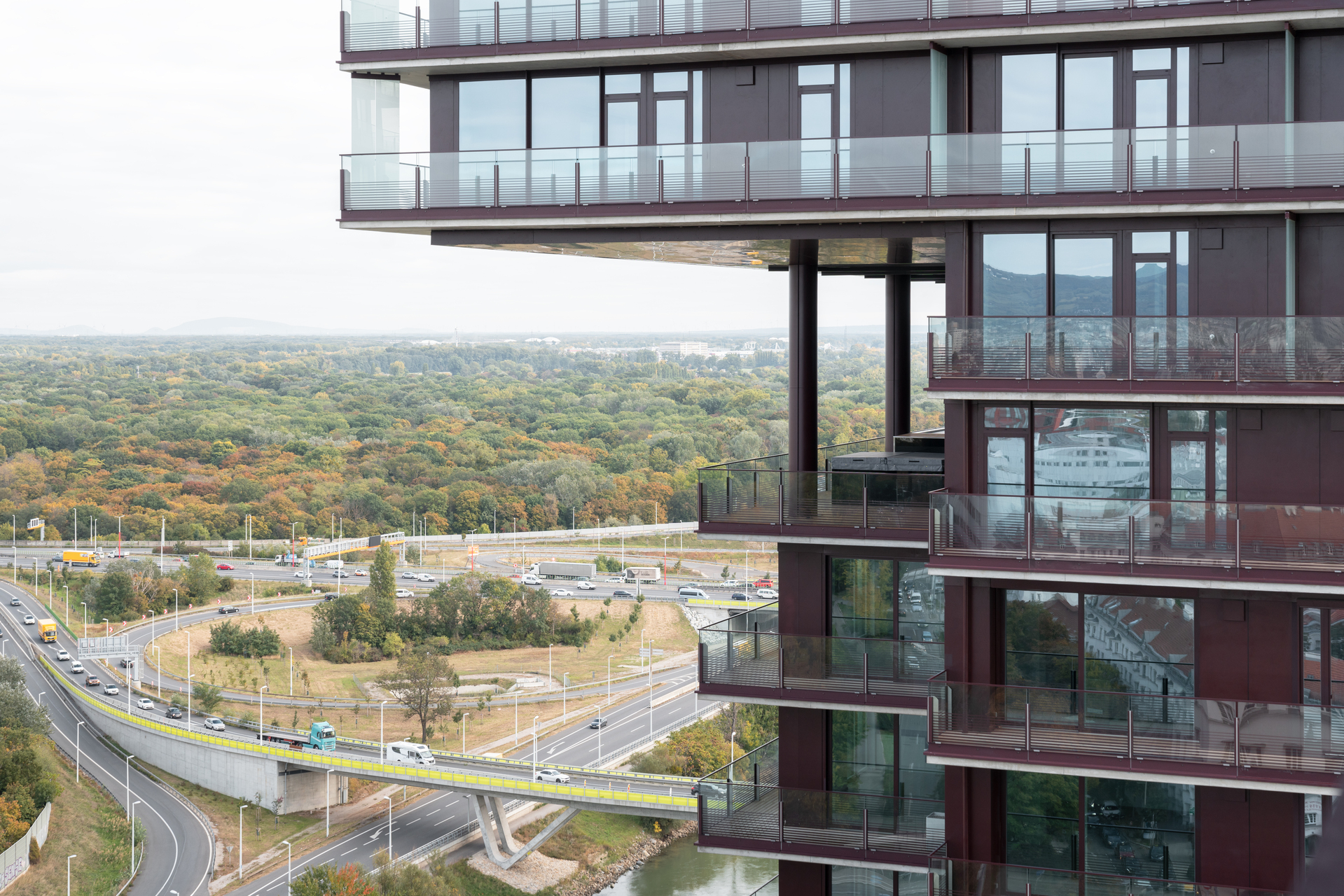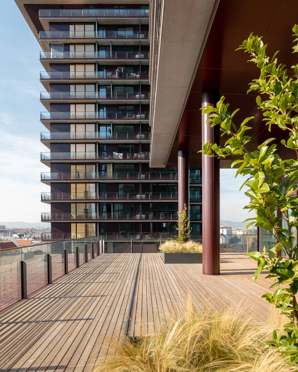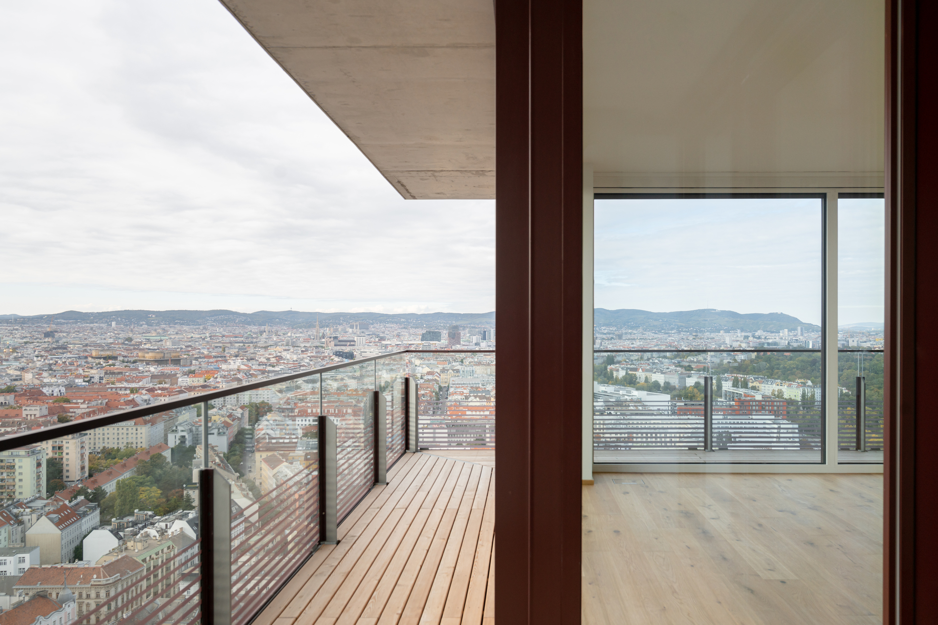 Als Prämissen für die Wohngeschosse galten neben der maximalen Flexibilität die zweiseitige Belichtung möglichst vieler Wohnungen, dazu die natürliche Belichtung der Erschließung, die Raumhöhe von 2,80 m, großflächige Verglasungen mit Schiebetüren und großzügige Freibereiche in Form von Loggien, Balkonen und Terrassen. So entstand neben Schnellstraße und Autobahnzufahrt mit Blick auf das Atominstitut der Österreichischen Universitäten, Praterwiesen und Stadion komfortabler und lebenswerter Wohnraum in höheren Preisklassen genauso wie in den Kleinstwohnungen für Studierende. (Autor: Achim Geissinger, nach einem Text der Architekten)
