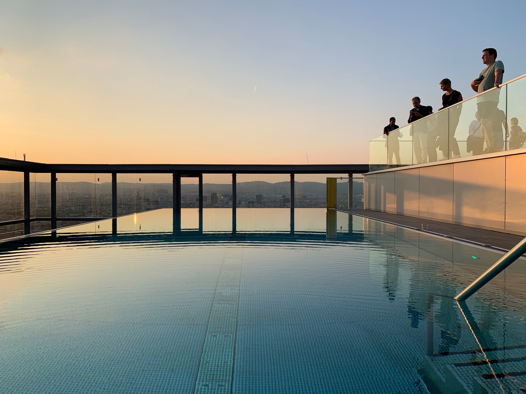Die Türme sind durch ein zweigeschossiges Sockelbauwerk untereinander verbunden, in welchem u.a. ein Kindergarten, ein Restaurant und Geschäfte untergebracht sind und so das monofunktionale Büroumfeld der gegenüberliegenden „TownTown“ beleben. Eine Freitreppe führt vom gut dimensionierten, dem Haupteingang vorgelagerten Quartiersplatz über eine Zwischenterrasse mit Restaurant hinauf zu einer Gartenebene. Diese ist über Brücken an die hoch gelegene, das „TownTown“ längs durchziehende Magistrale angeschlossen und zur Donauseite hin an den Dachgarten auf der Überbauung des Autobahnzubringers Erdberger Lände.