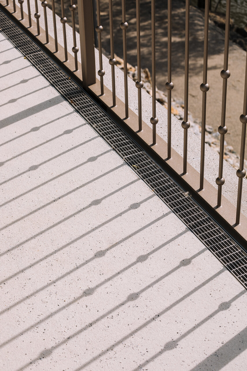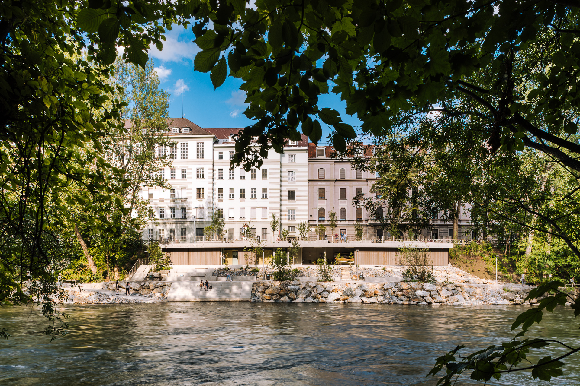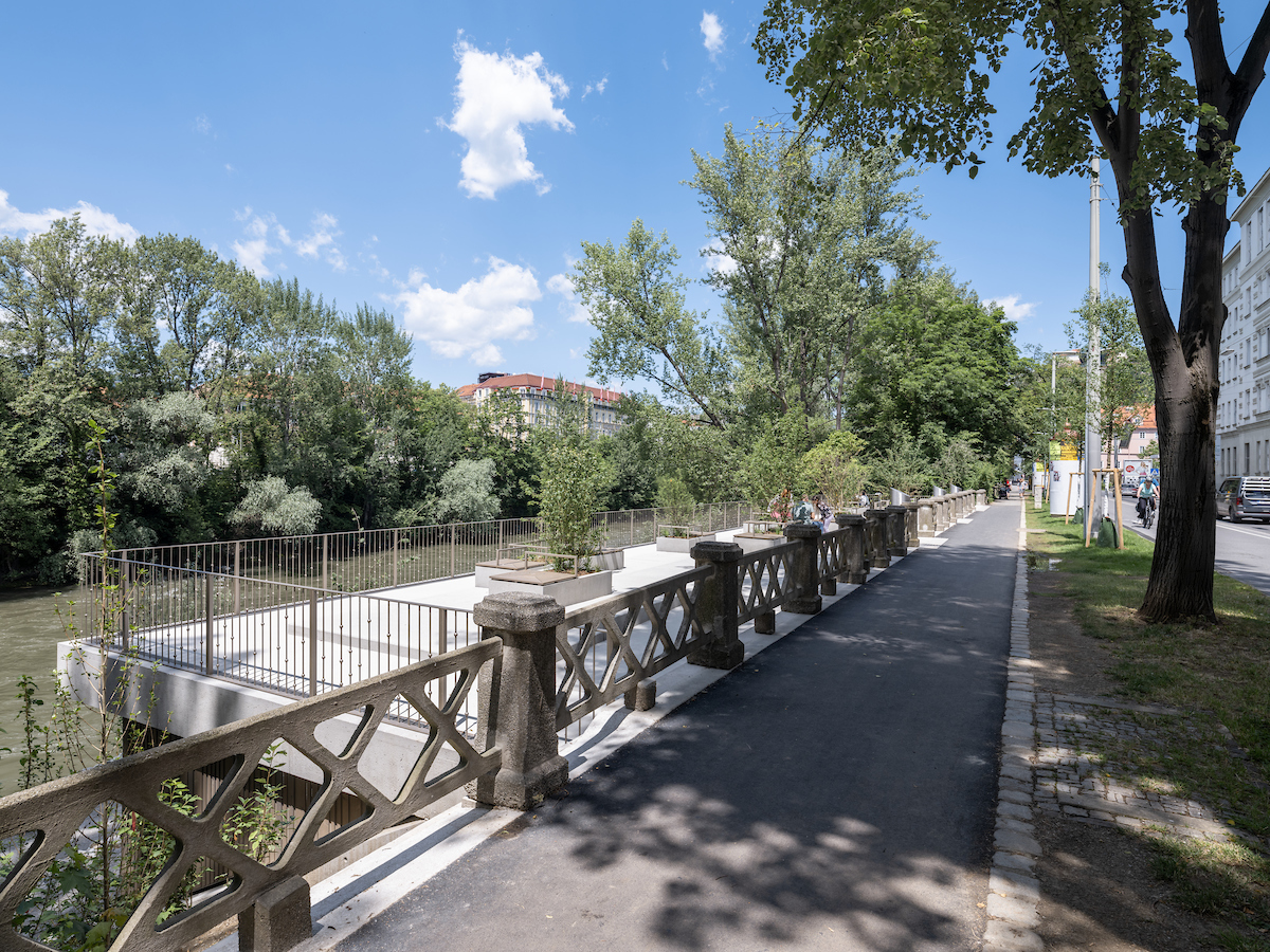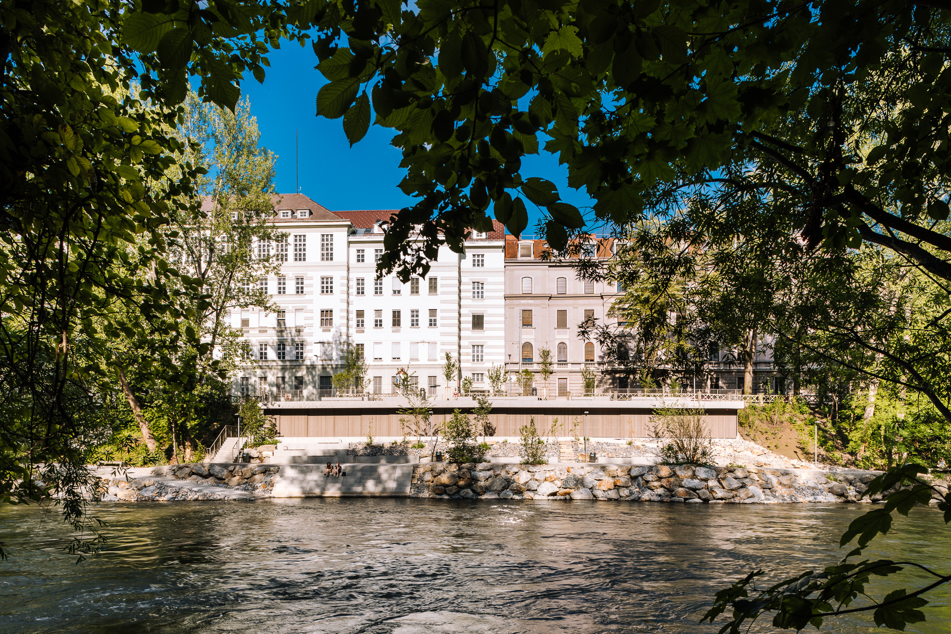 Um den Paddler:innen einen optimalen Einstieg ins Wasser zu ermöglichen, sind neben einer Stufenanlage zum Fluss noch eine Slip-In-Stelle und eine Kehrwasserbühne umgesetzt worden, die zusätzlich eine Aufweitung der Uferpromenade formt und so den Stadtbewohner:innen als Aussichtsplattform im Fluss dient. (Text: Architektin)