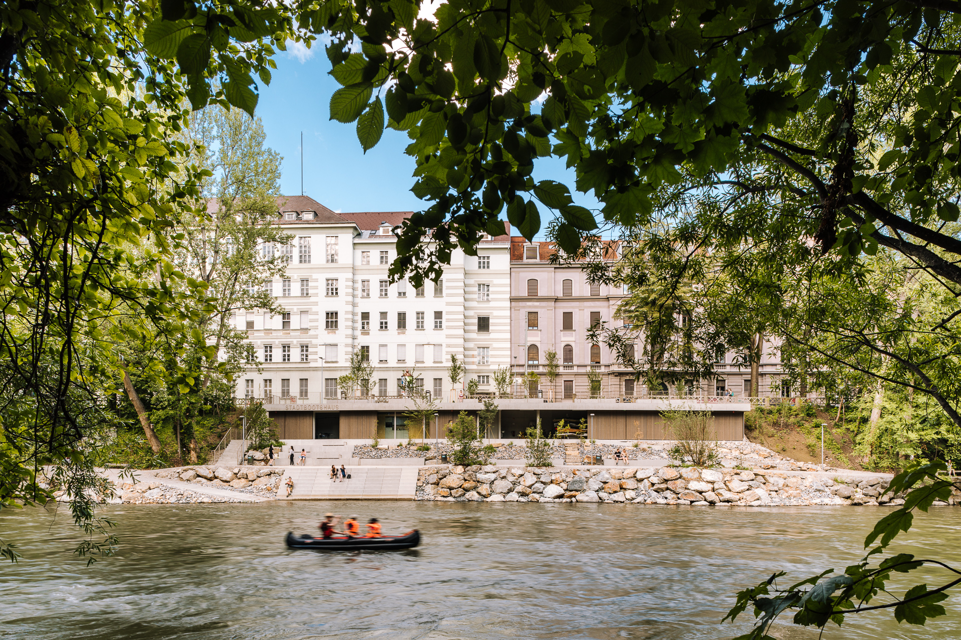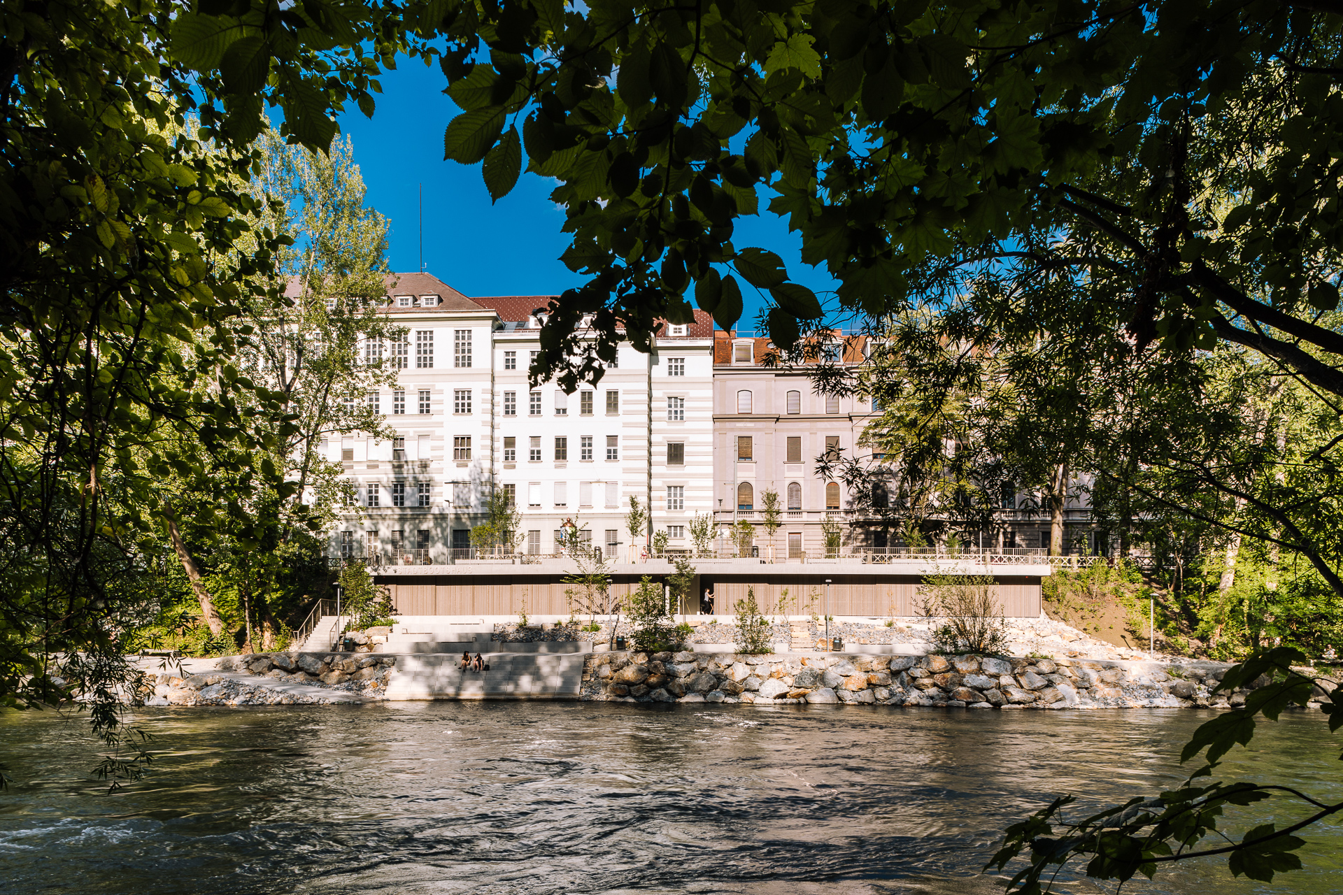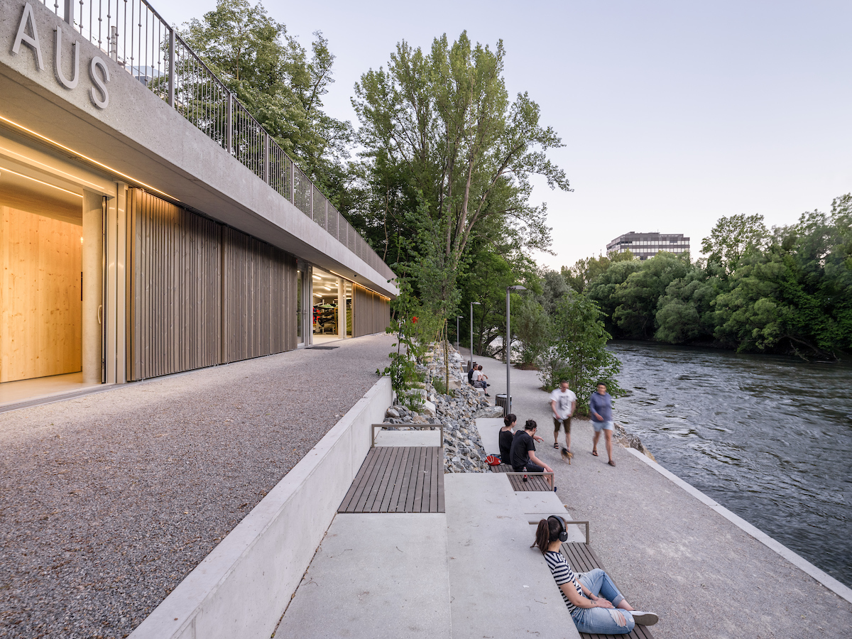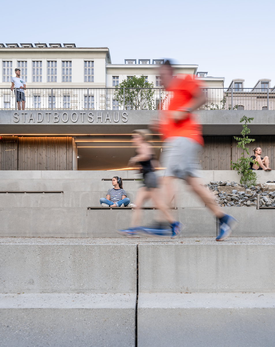 Das direkt vom Kai aus barrierefrei begehbare Gebäudedach mit Pflanztrögen und Sitzbereichen ist zur Mur hin abgetreppt und dient den Stadtbewohner:innen und -flaneur:innen als „Stadtbalkon“ zum konsumfreien Verweilen und als Zusehertribüne der Vereinsaktivitäten des „Kanu Club Graz“ und „Grazer Kajakclub Wikinger“.