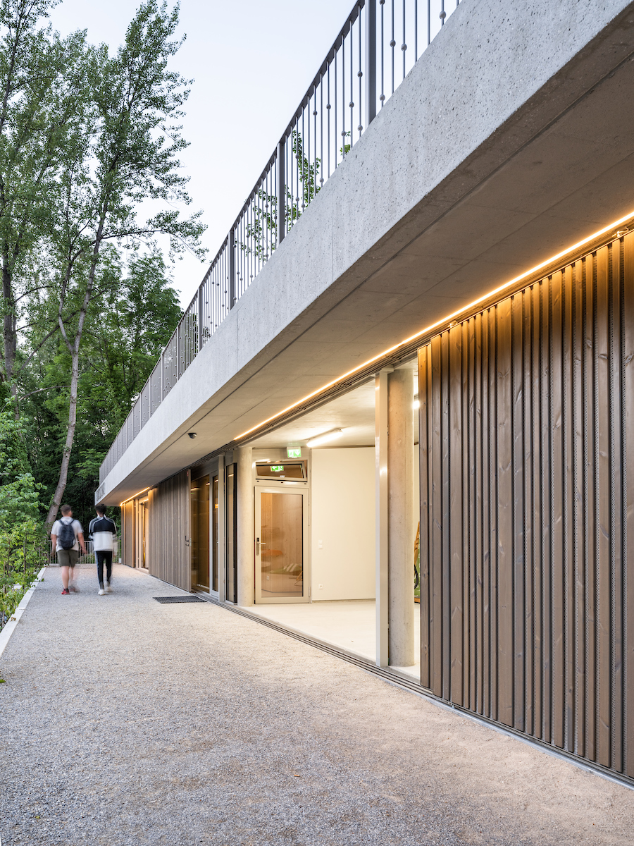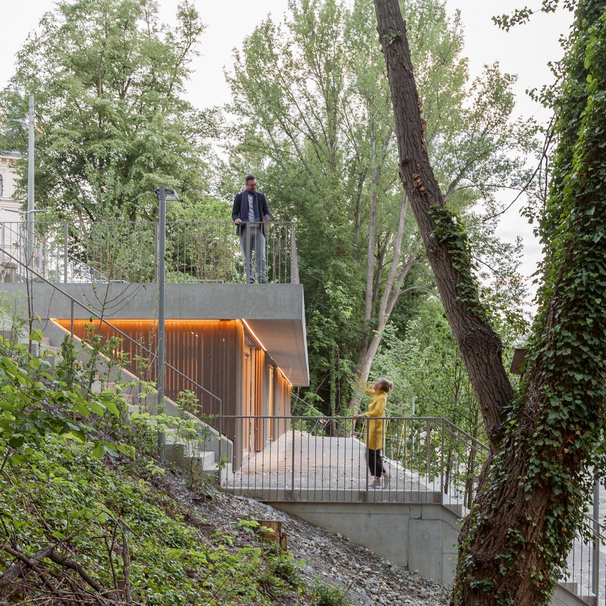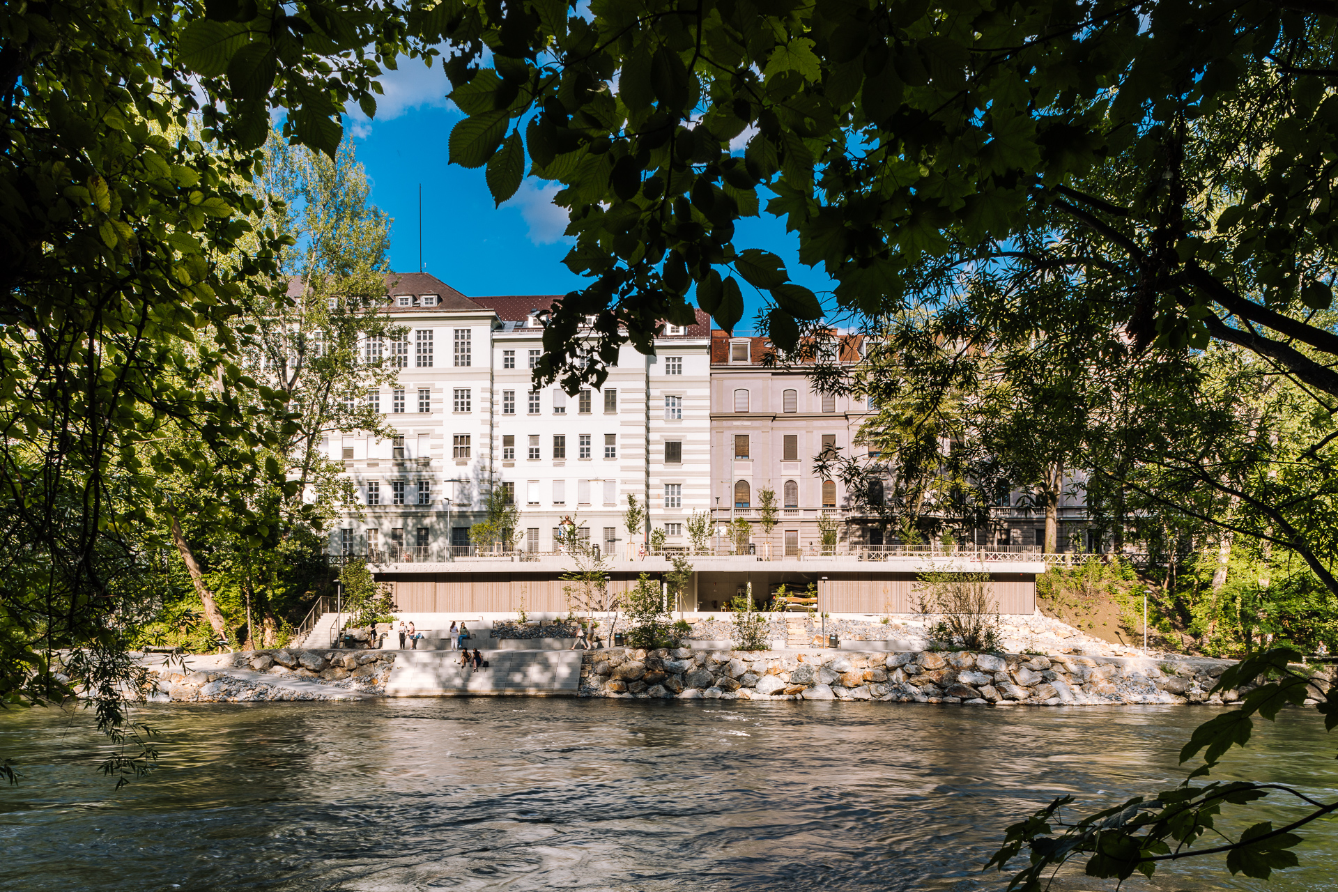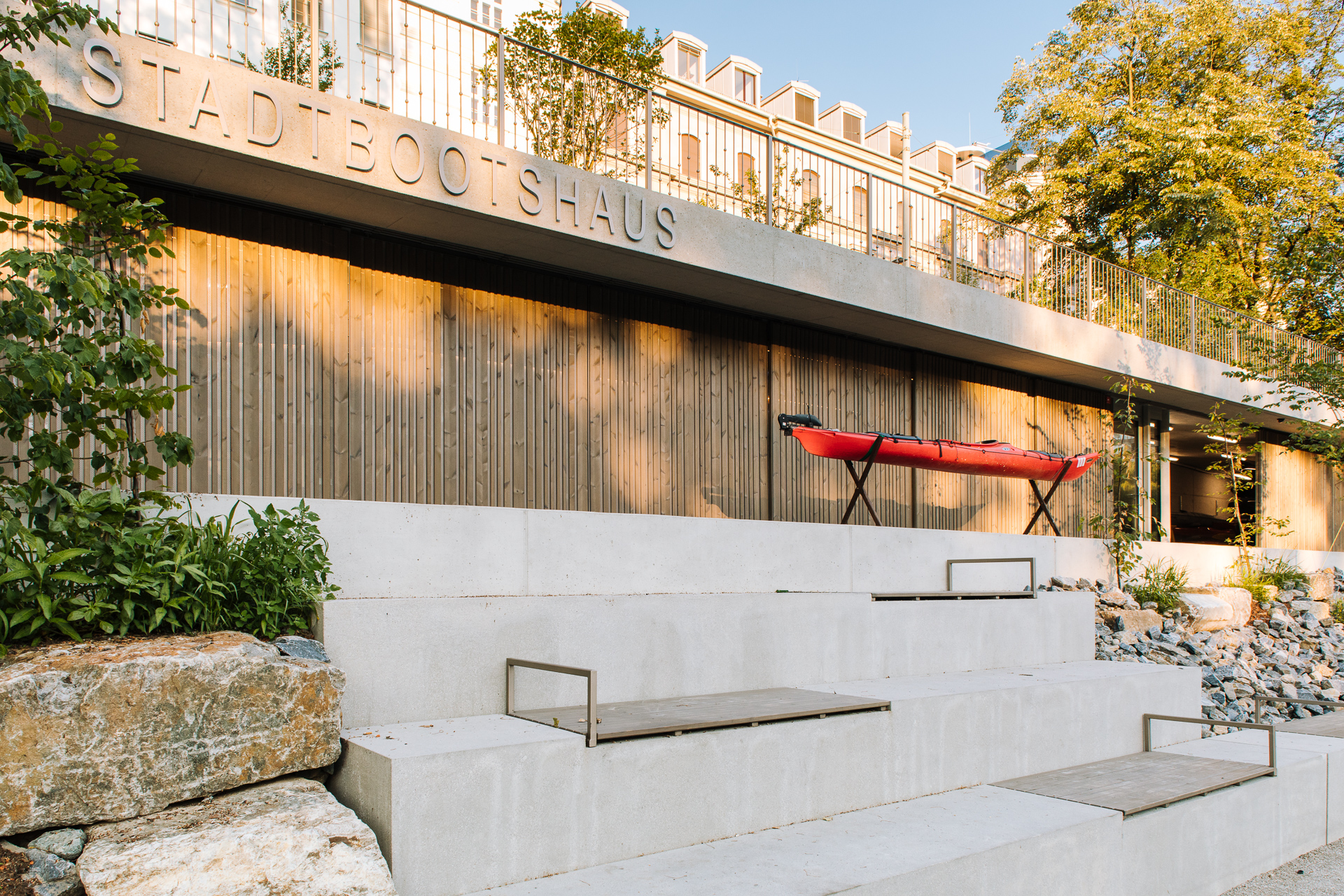 Das direkt vom Kai aus barrierefrei begehbare Gebäudedach mit Pflanztrögen und Sitzbereichen ist zur Mur hin abgetreppt und dient den Stadtbewohner:innen und -flaneur:innen als „Stadtbalkon“ zum konsumfreien Verweilen und als Zusehertribüne der Vereinsaktivitäten des „Kanu Club Graz“ und „Grazer Kajakclub Wikinger“.