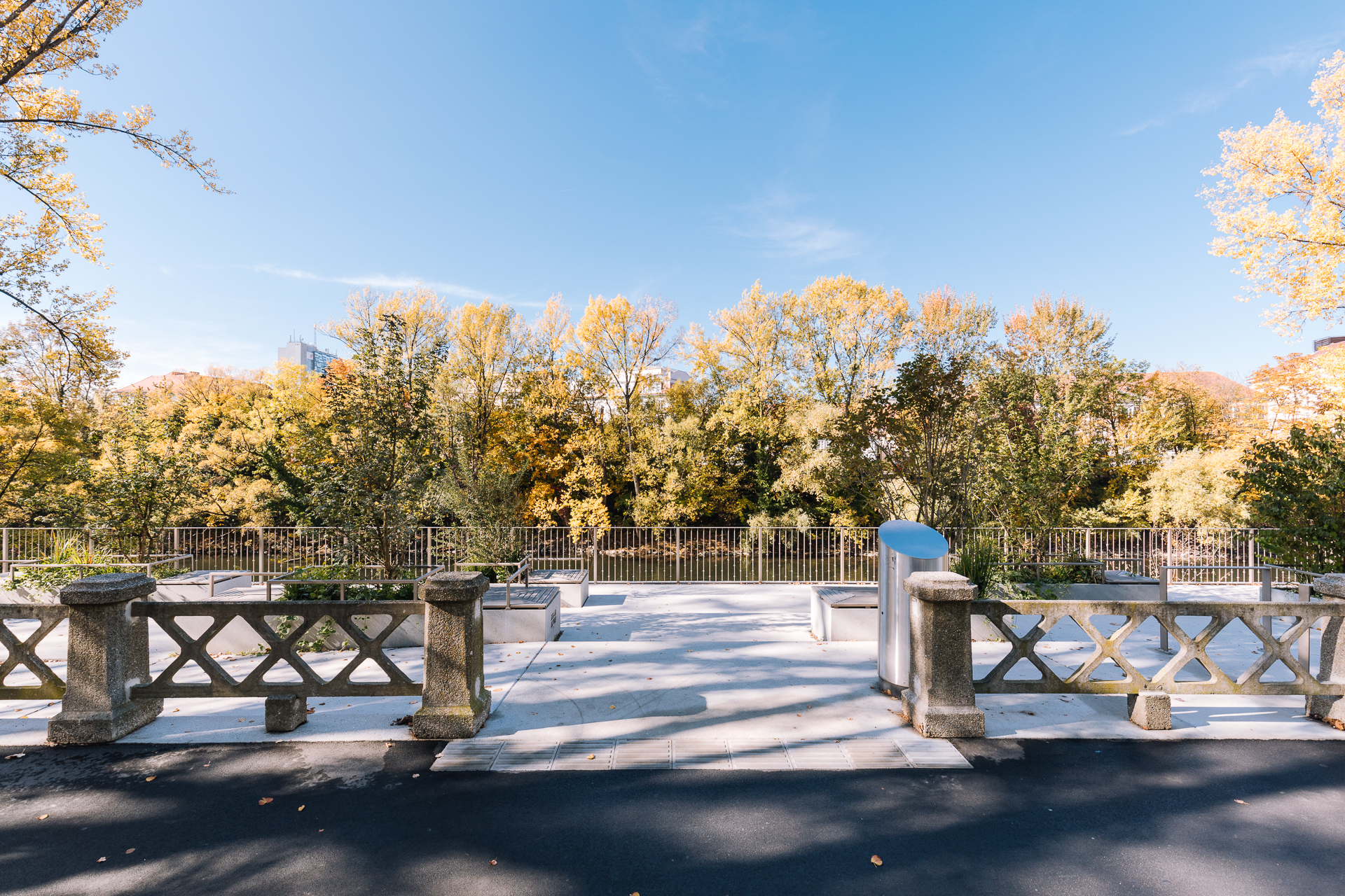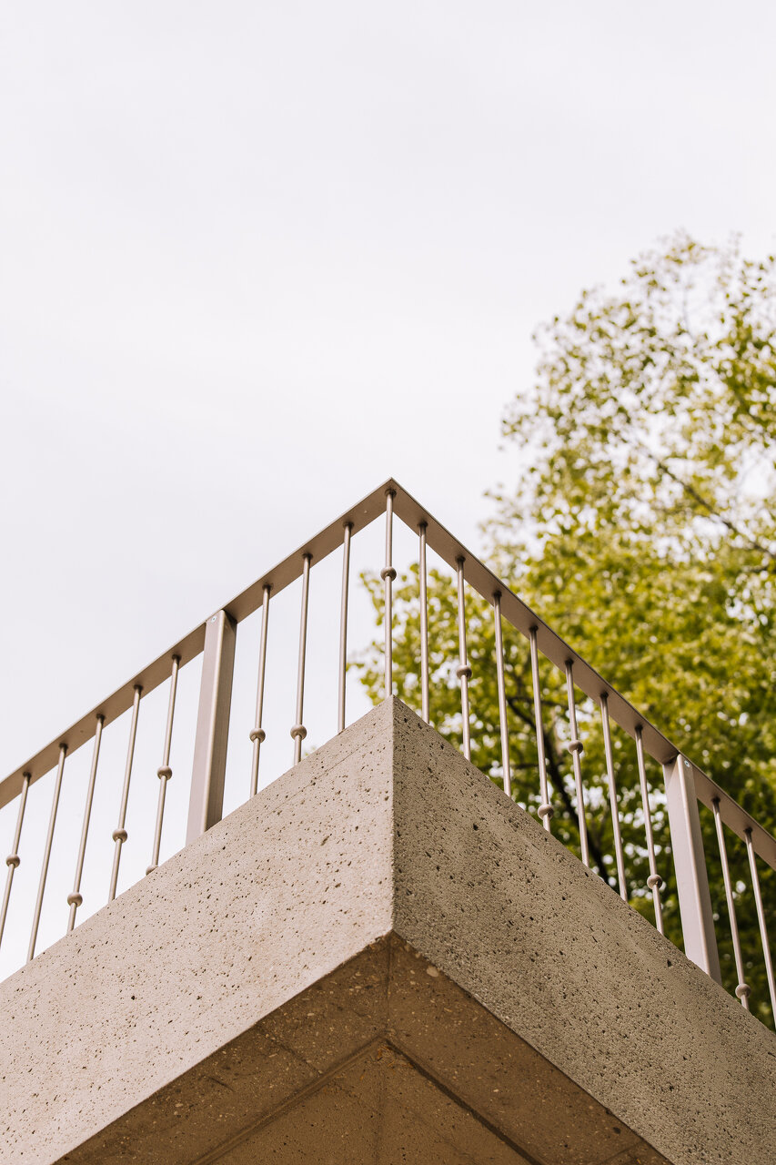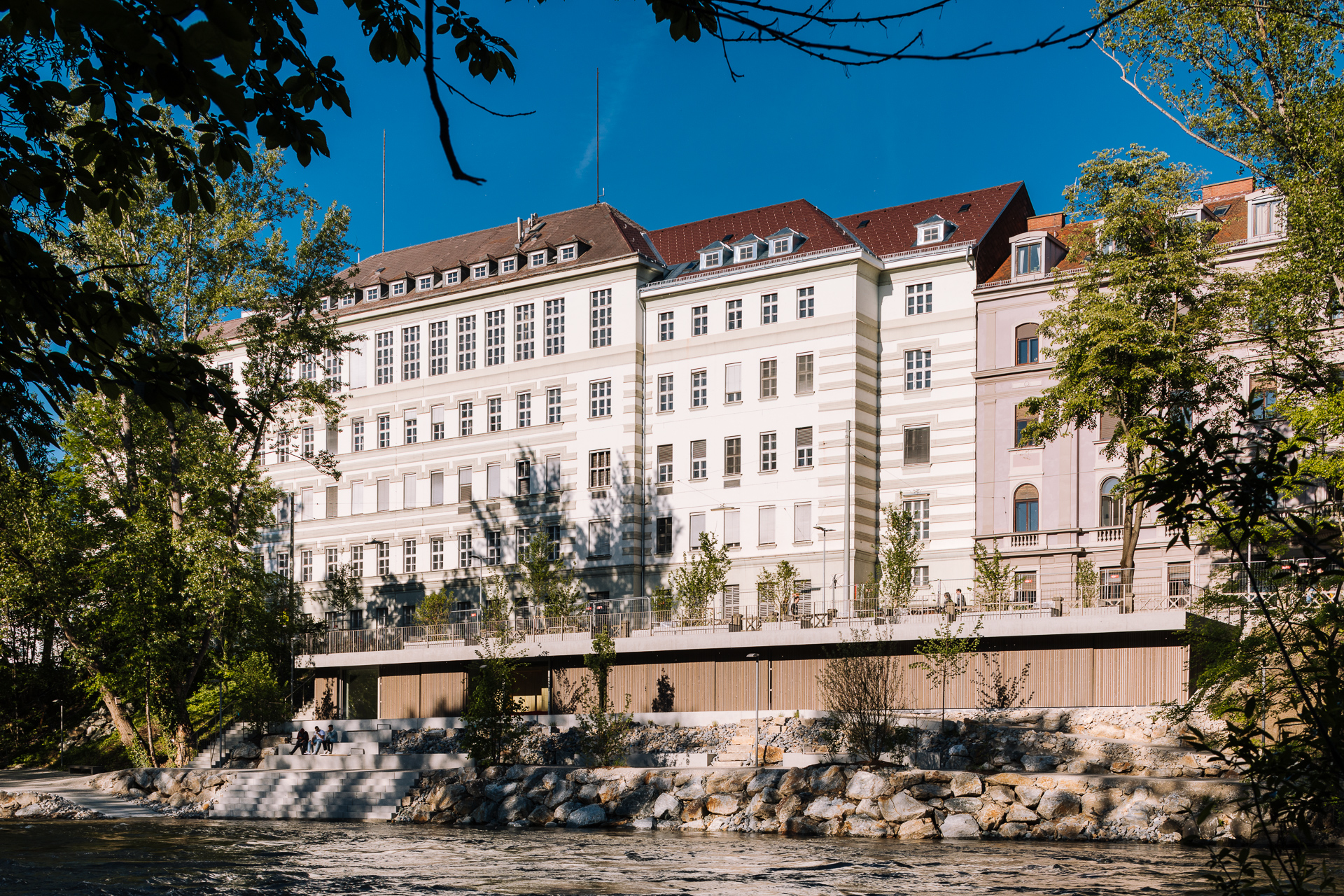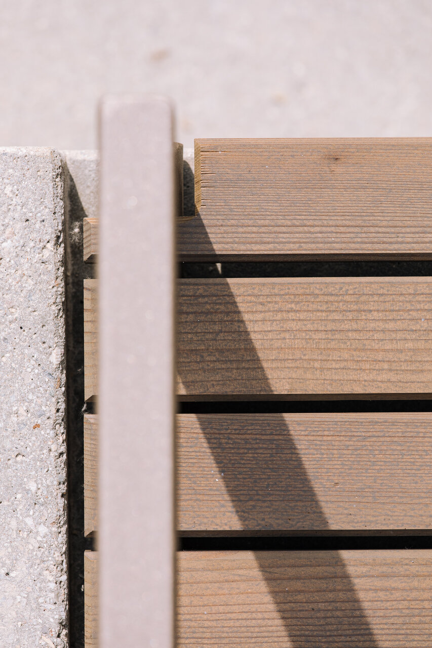 Das direkt vom Kai aus barrierefrei begehbare Gebäudedach mit Pflanztrögen und Sitzbereichen ist zur Mur hin abgetreppt und dient den Stadtbewohner:innen und -flaneur:innen als „Stadtbalkon“ zum konsumfreien Verweilen und als Zusehertribüne der Vereinsaktivitäten des „Kanu Club Graz“ und „Grazer Kajakclub Wikinger“.