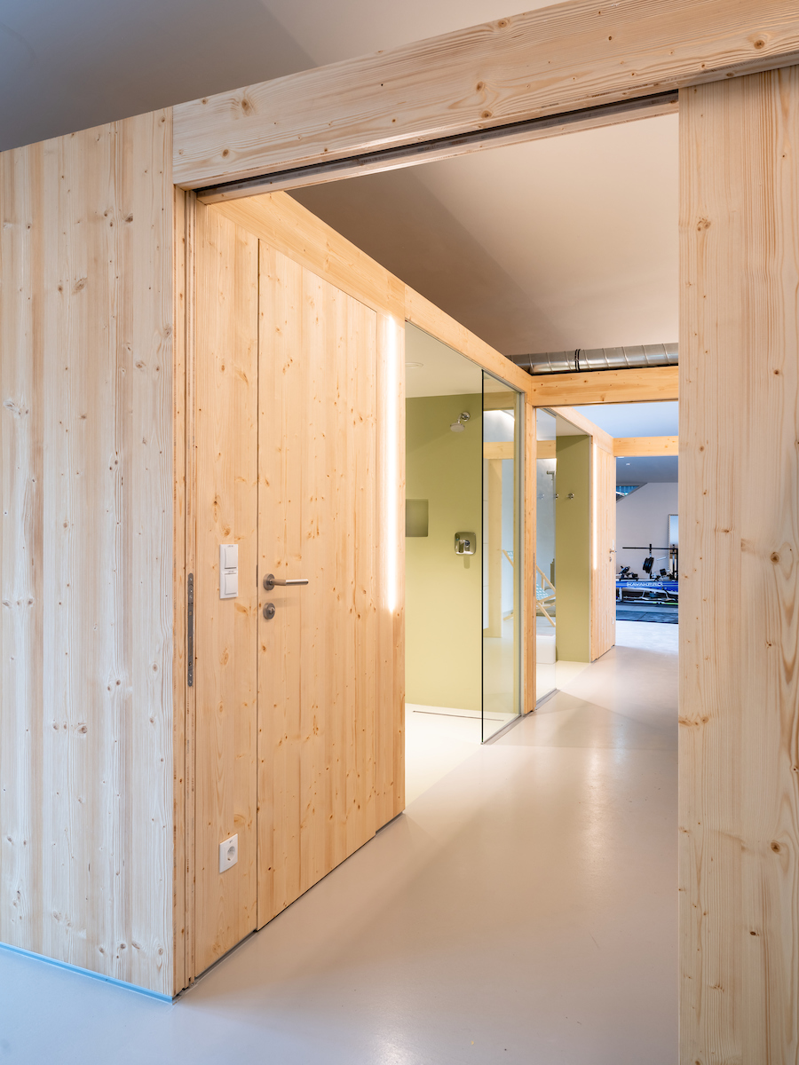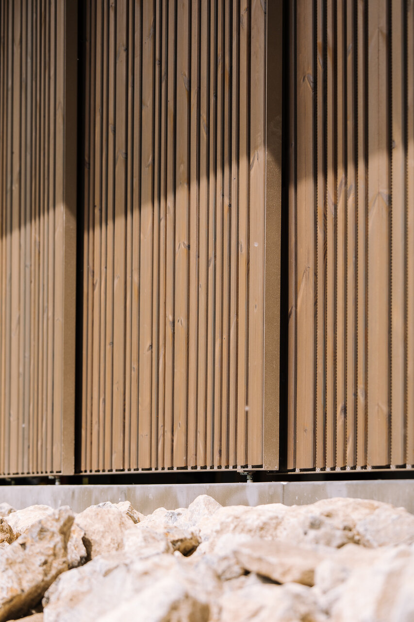 Der 90m² beheizte und sehr offen gestaltete Vereinsbereich mit innenliegender Funktionsbox, sowie der 120m² große Bootslager-Bereich sind durch verschiebbare Holzfassadenelemente entweder komplett geschlossen oder flexibel öffenbar. Dadurch gelingt es, die Innenbereiche nahezu übergangslos mit dem Außenraum zu verschränken.