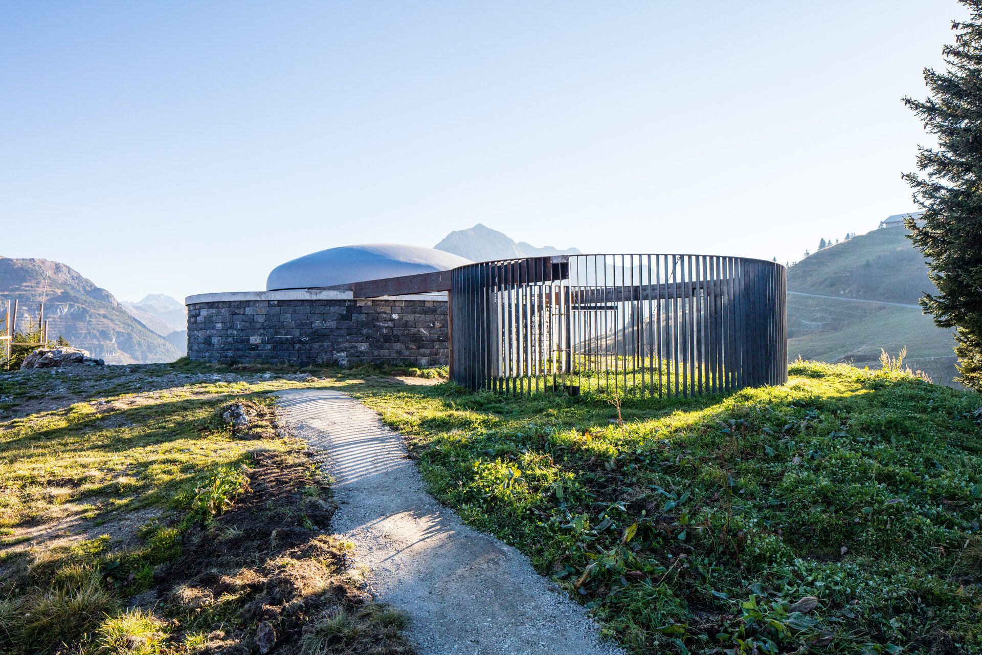 James Turrell entwarf einen Rundraum auf einem elliptischem Grundriss mit 9 Meter Längs- und 6 Meter Querachse, der in einen Hügel eingegraben ist. Der Bauplatz auf 1.800 Meter im Gelände des hochalpinen Arlberg-Gebietes stellte enorme Anforderungen an den Rundbau. Er bedurfte einer Kuppel, die auch extremen Witterungsverhältnissen standhält. Diese muss bei schlechtem Wetter geschlossen sein, um den Skyspace zu schützen. Genauso zwingend muss sie geöffnet sein, um die Begegnung des farbigen Lichts von James Turrell mit dem Himmel und dem Schauenden zu ermöglichen.