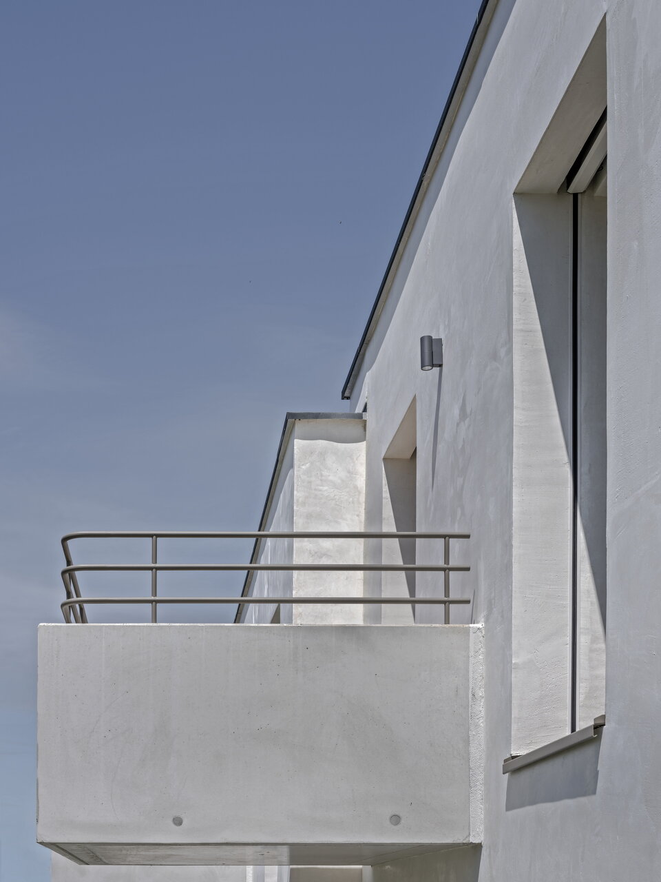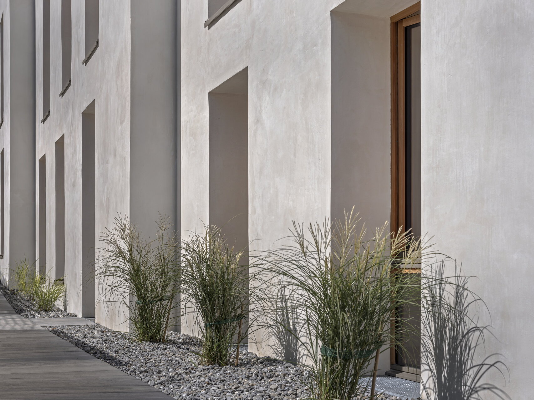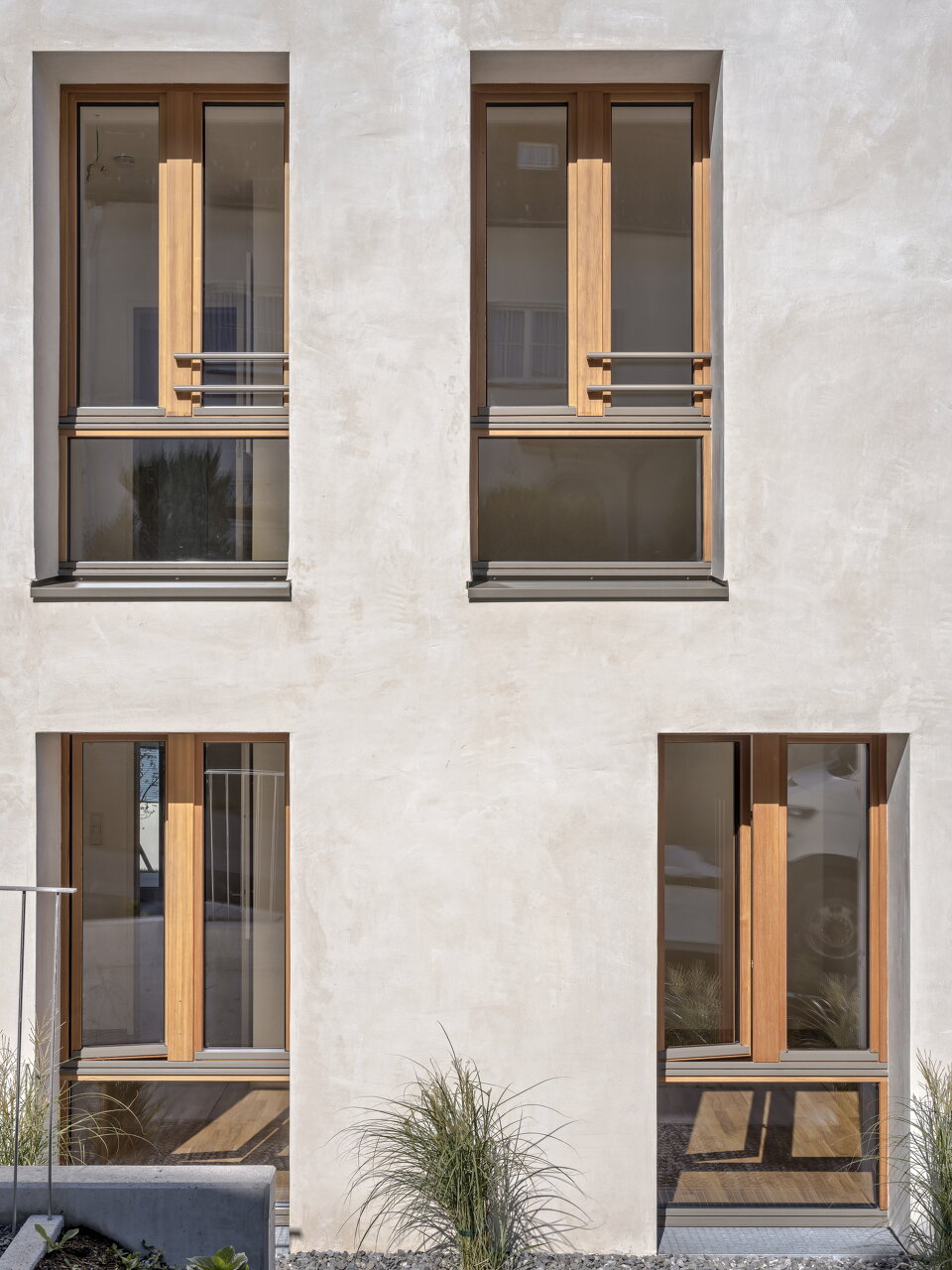Durch die Abwärme der Menschen im Haus, von Beleuchtung und Geräten hält sich die Grundtemperatur um rund 22°C, ohne zusätzliche Maßnahmen. Lediglich eine Temperatur- und CO2-Steuerung der Fensterflügel sorgt dafür, dass möglichst effektiv und mit geringen Verlusten gelüftet wird. Die hohe Eigenmasse, der kompakte Baukörper und die austarierten Fensterflächen schaffen eine optimierte Hülle mit größtmöglicher Trägheit. Für die Abdeckung des Warmwasserbedarfs in den Wohneinheiten sorgt ein Backup, dessen Herz die Photovoltaik-Anlage auf dem Dach bildet. Sie speist auch die Infrarotpaneele in den Wohnräumen für zusätzliche Wärme je nach individuellem Bedarf; überschüssige Energie wird in einer Batterie gespeichert. (Text: Architekten, bearbeitet)