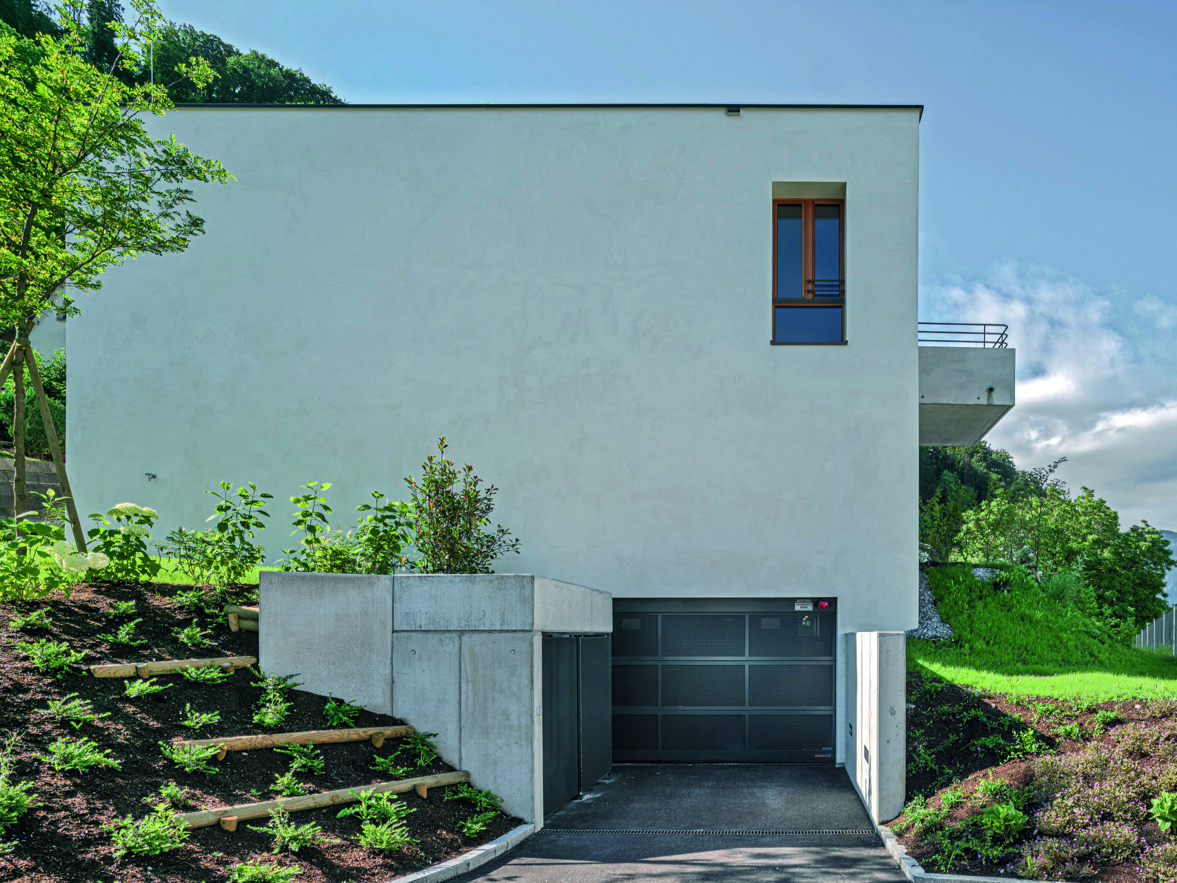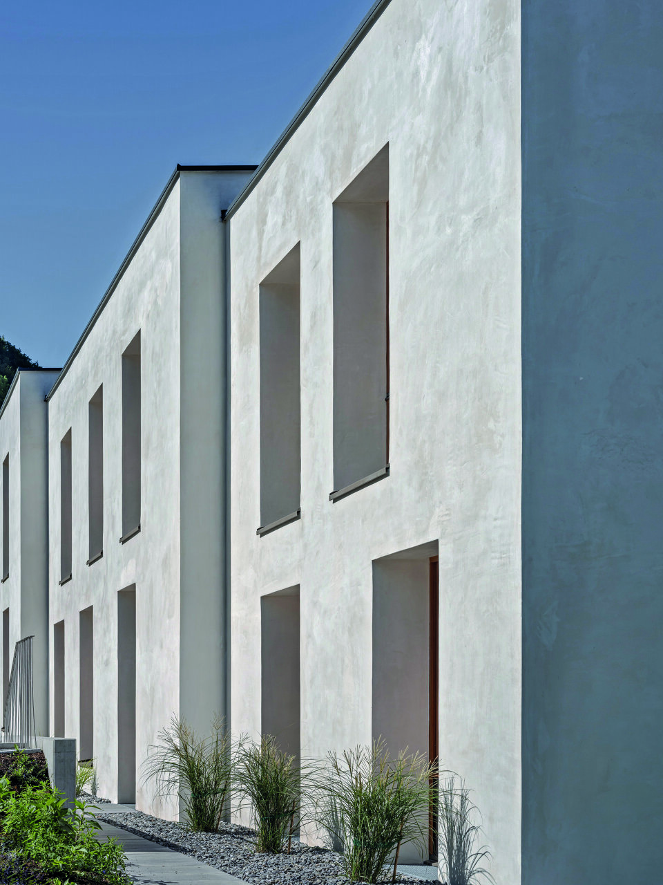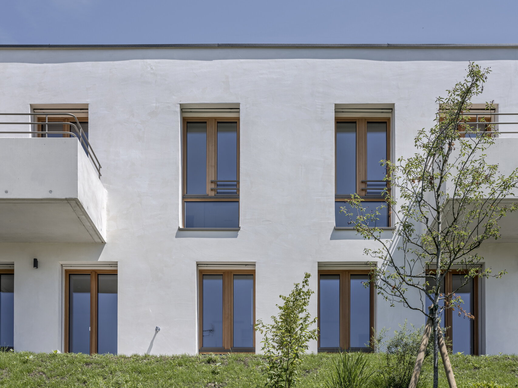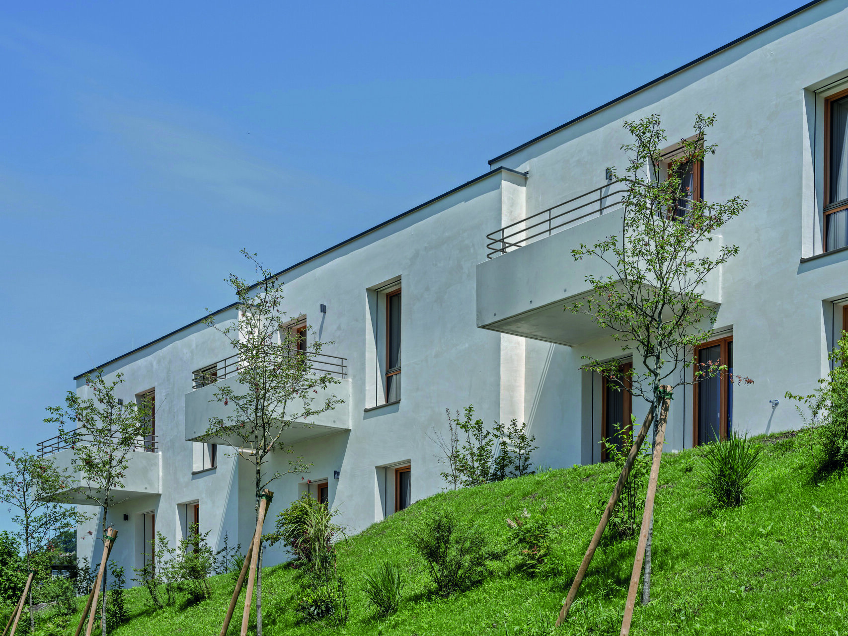 Vertikale und horizontale Staffelungen übernehmen eine städtebauliche Vermittlungsfunktion. Im Baukörper befinden sich acht identische 3-Zimmer-Wohneinheiten, über zwei Stiegenhäuser erschlossen. Jede Wohnung verfügt über eine Terrasse bzw. einen Balkon; das Untergeschoß bietet Tiefgaragen-Einstellplätze und Kellerabteile. Letzteres wurde in Beton, der oberirdische Baukörper als Ziegel-Konstruktion mit Kalkputzfassade ausgeführt – gemäß dem Wunsch nach einem Gebäudetyp mit hochwertigem, solidem Charakter. Der Baukörper verschneidet sich mit dem Hang im Mittel; Böschungen, Mauern, Terrassierungen, Fußwege sowie Hochstammbäume, Stauden und Pflanzen bestimmen die Außenanlage.