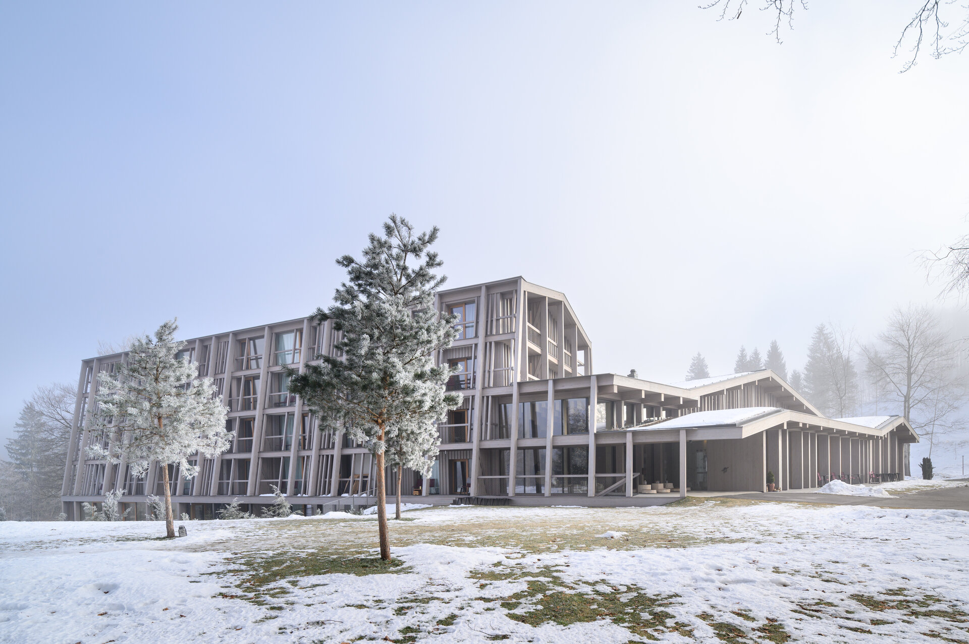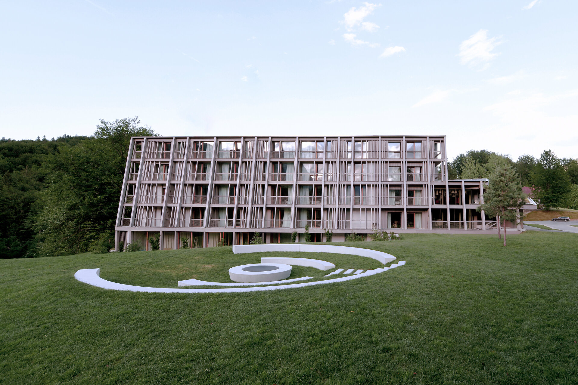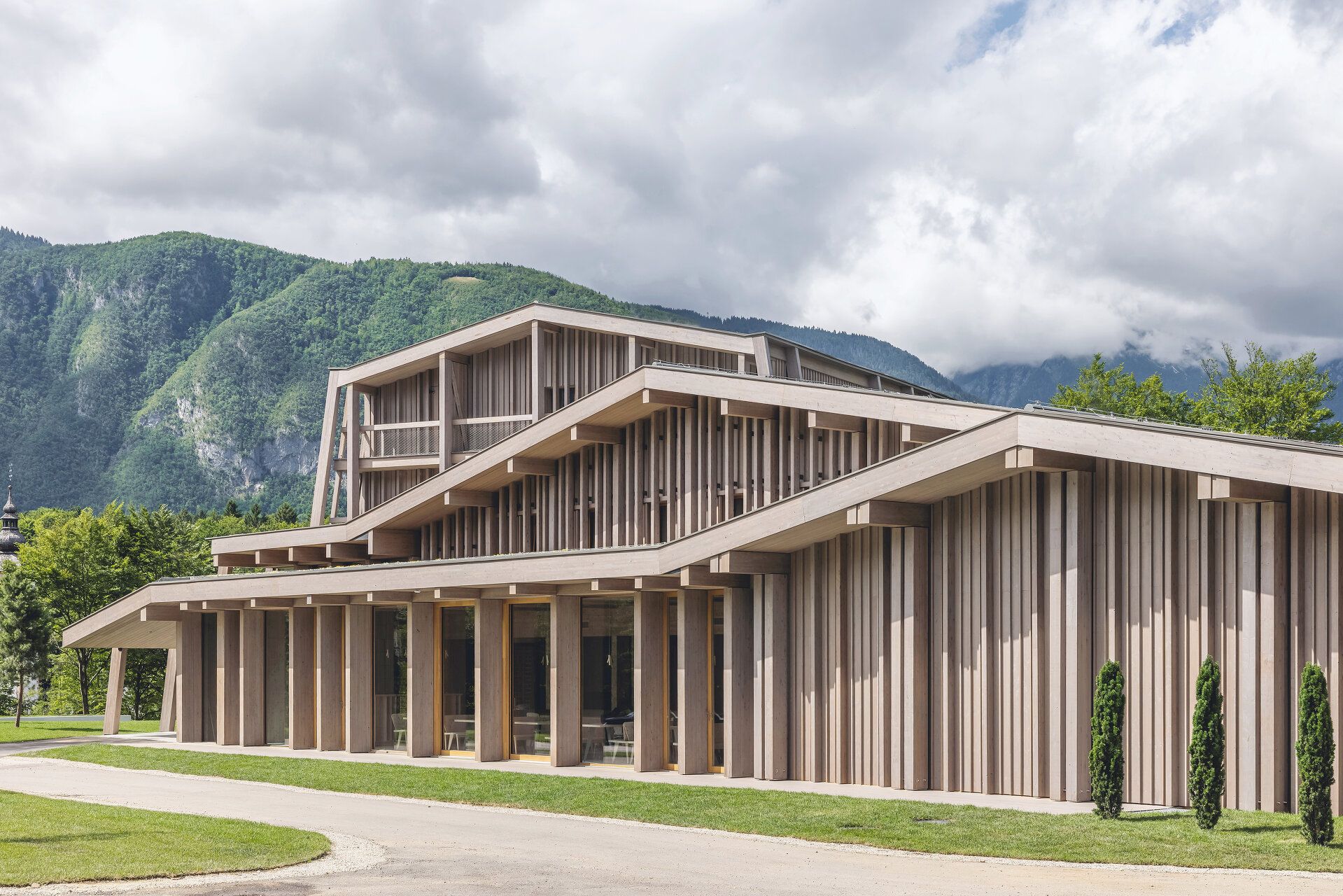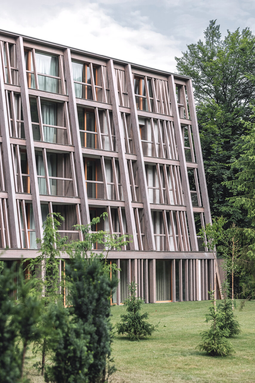 Der Eingangsbereich wurde um eine zweigeschossige Lobby und Gastronomieflächen erweitert, die Außenseiten wurden mit Lärchenholz bekleidet. Schon in der mehrgiebeligen Dachlandschaft des Bestandsbaus waren die Formen des umgebenden Hochgebirges angeklungen, die nun bei der Erweiterung weitergeführt wurden, ebenso wie Anklänge an traditionelle Architekturdetails und Handwerkskunst der Umgebung. Dies geschah hauptsächlich innen, vorwiegend in den 69 Zimmern, deren Größe vom Doppel-, über Tripel- bis hin zu Familienangeboten reicht. In den Mustern, Texturen und Möbeldetails scheint eine gewisse Bescheidenheit auf, wie sie für die Julischen Alpen typisch ist.