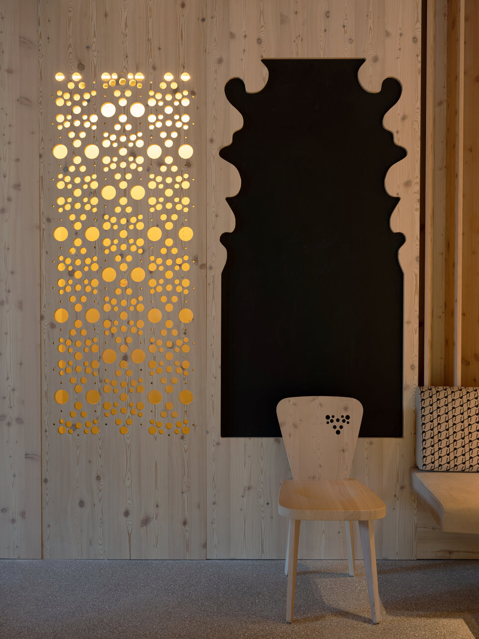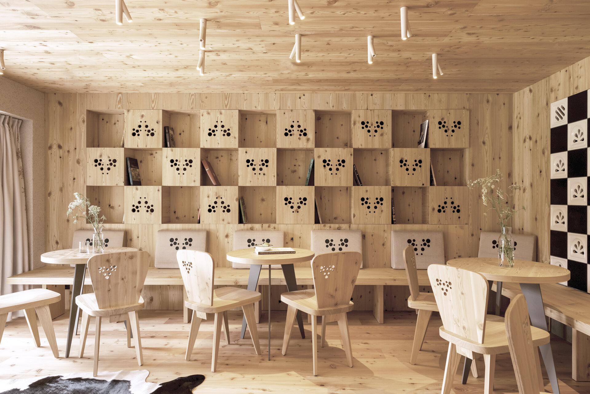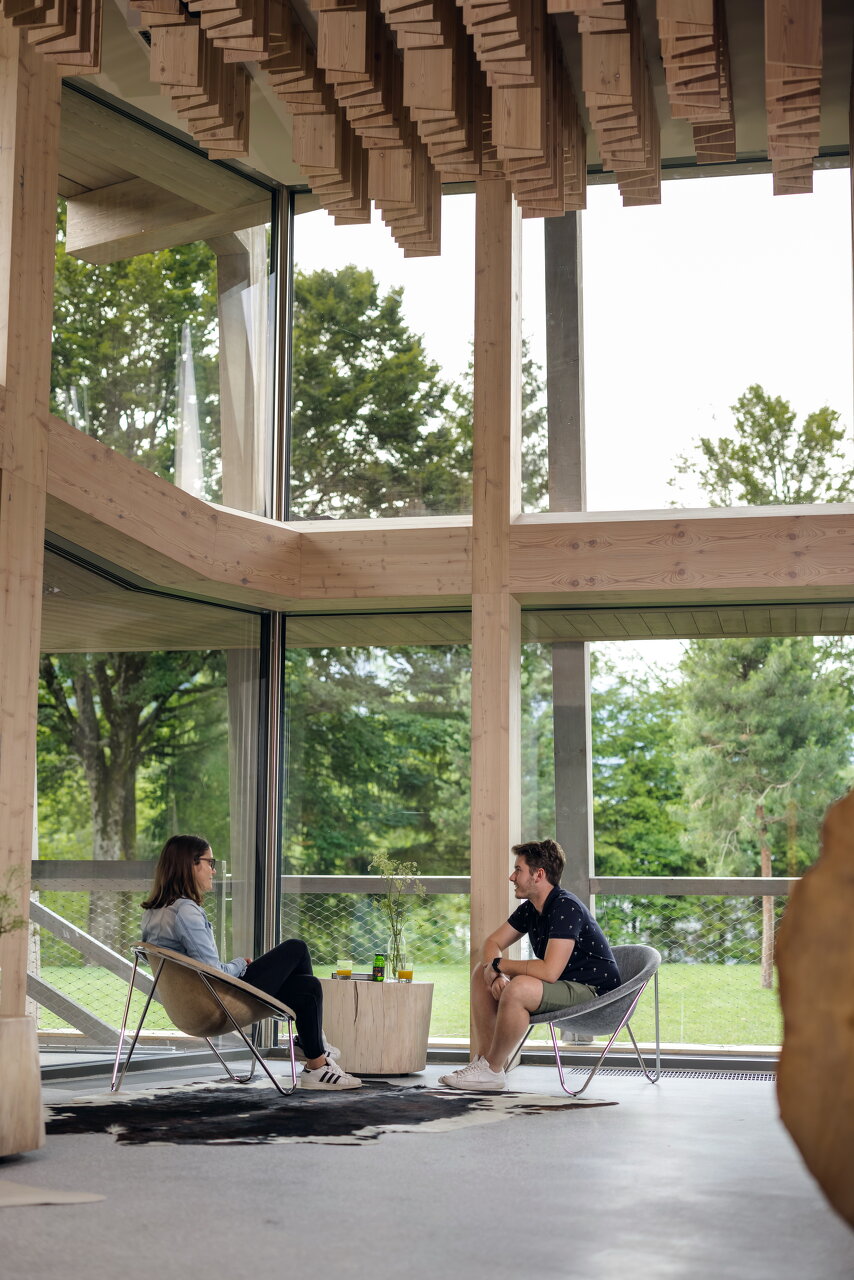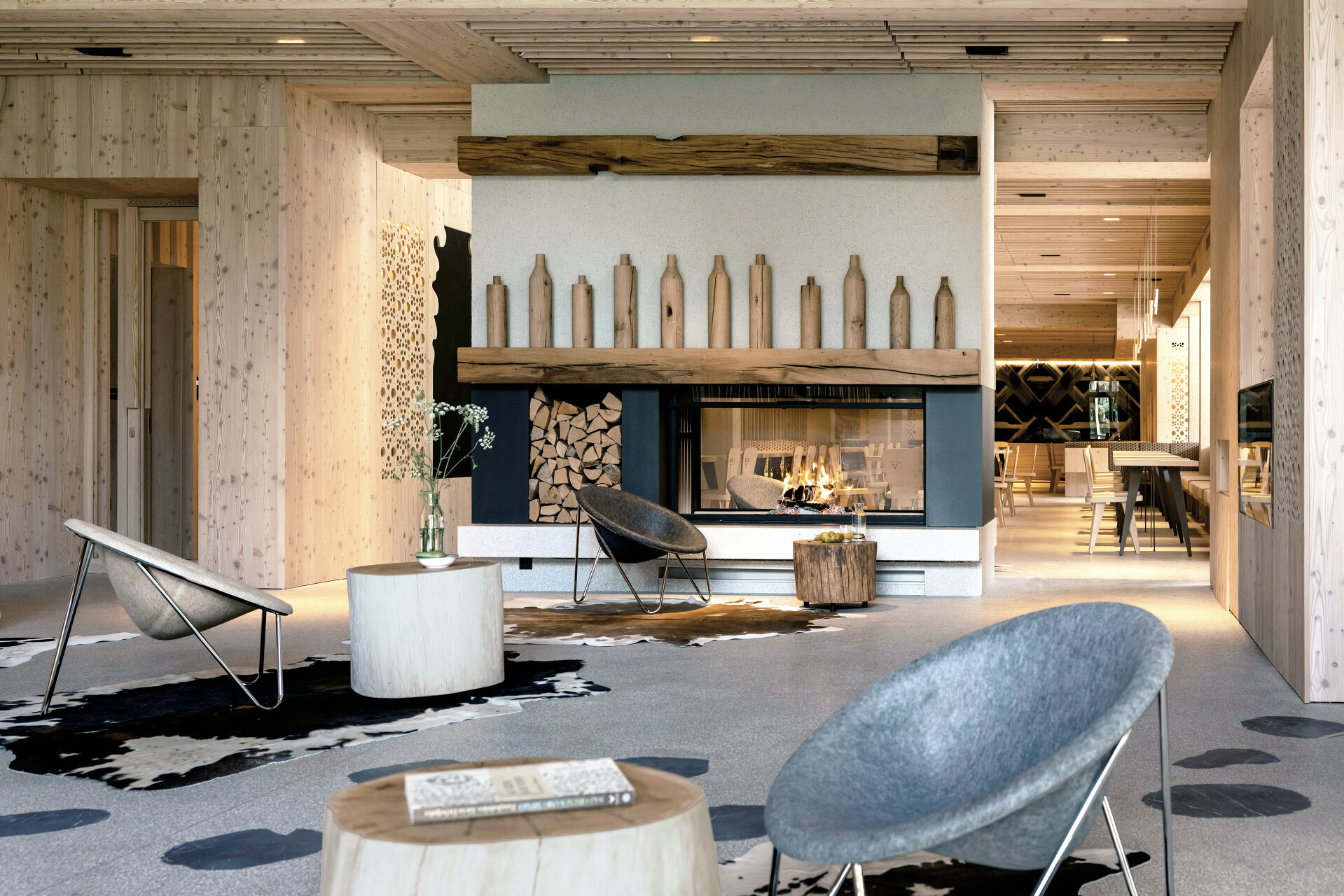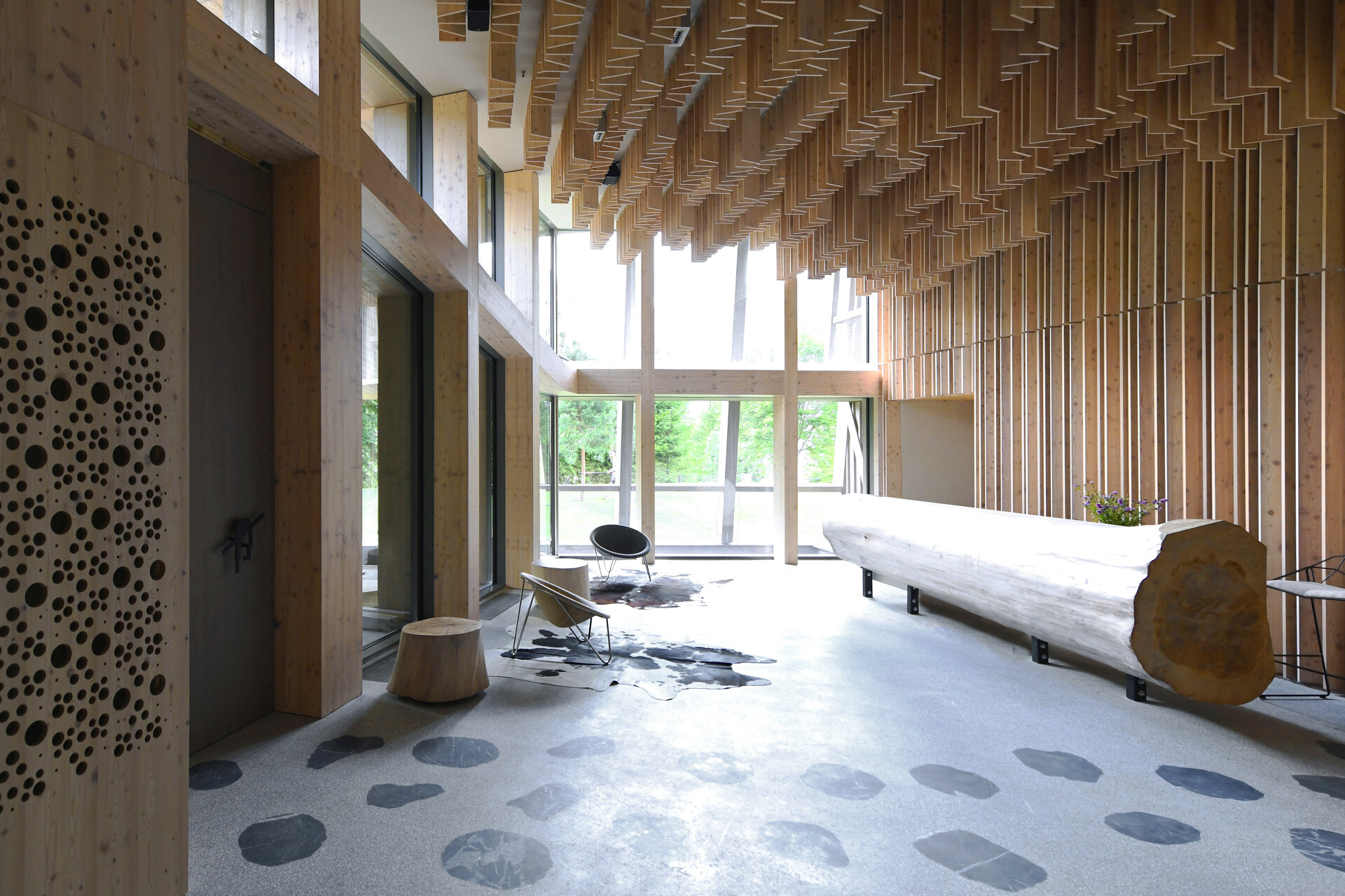 Stühle, Bänke, Polster, Vorhänge und an Äste erinnernde Leuchten wurden eigens für das Hotel entworfen. Der Filz für die Sessel wurde aus recycelten Kunststoffflaschen gewonnen. Das Hauptmaterial für Wände, Möbel und Decken ist aber auch hier Lärchenholz. Die Terrazzoböden zeigen den hellen Grauton der felsigen Umgebung, Inkrustationen aus schwarzem slowenischem Stein weisen den Weg durch die Lobby und erinnern an den Hotelkater Mr. Max, der zu Beginn der Renovierungsarbeiten das Weite suchte und dort verblieb.