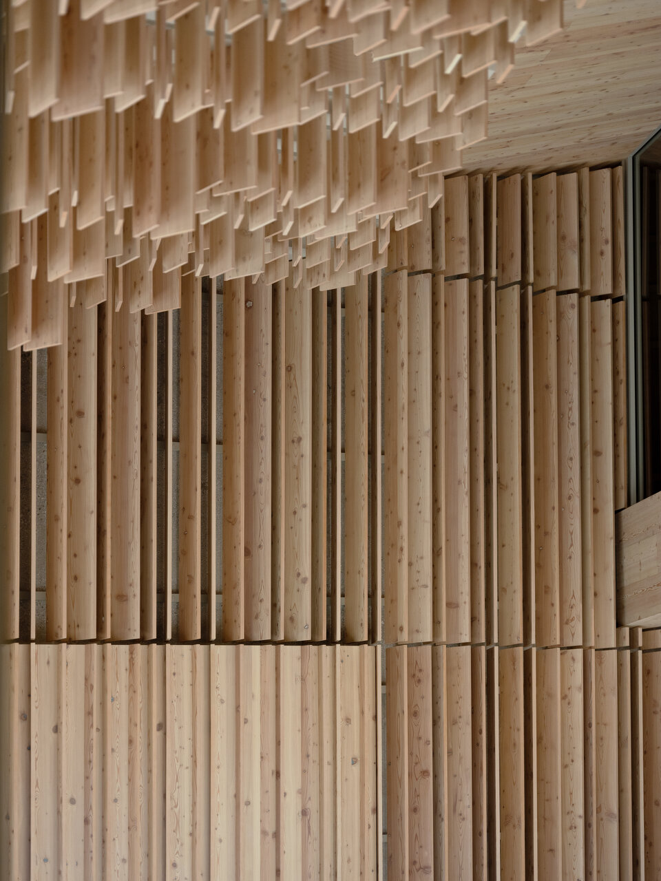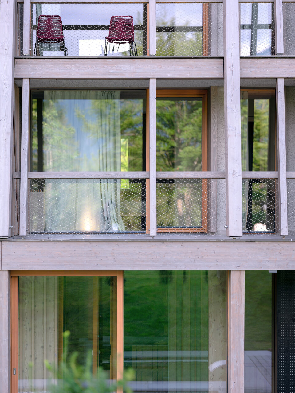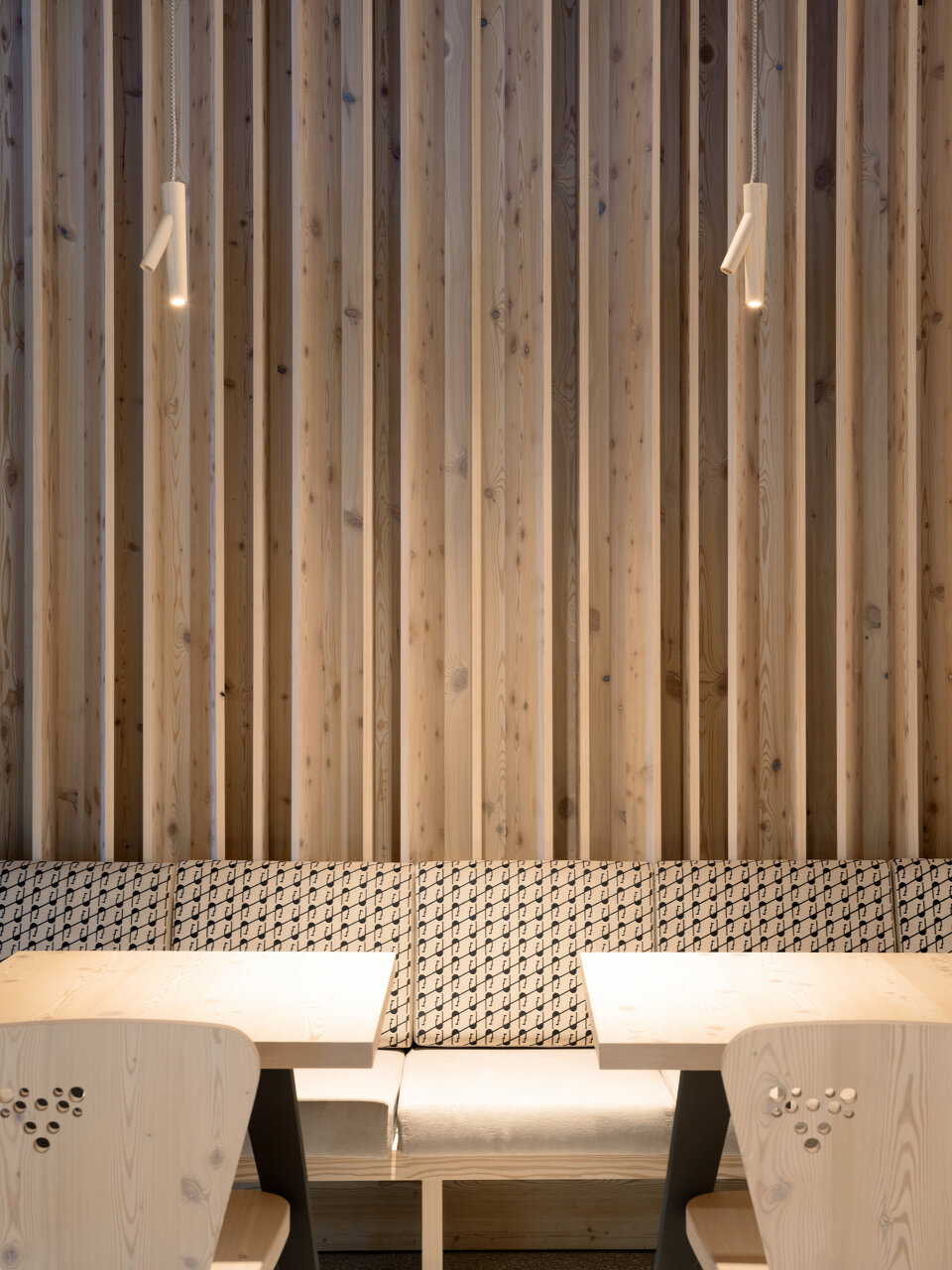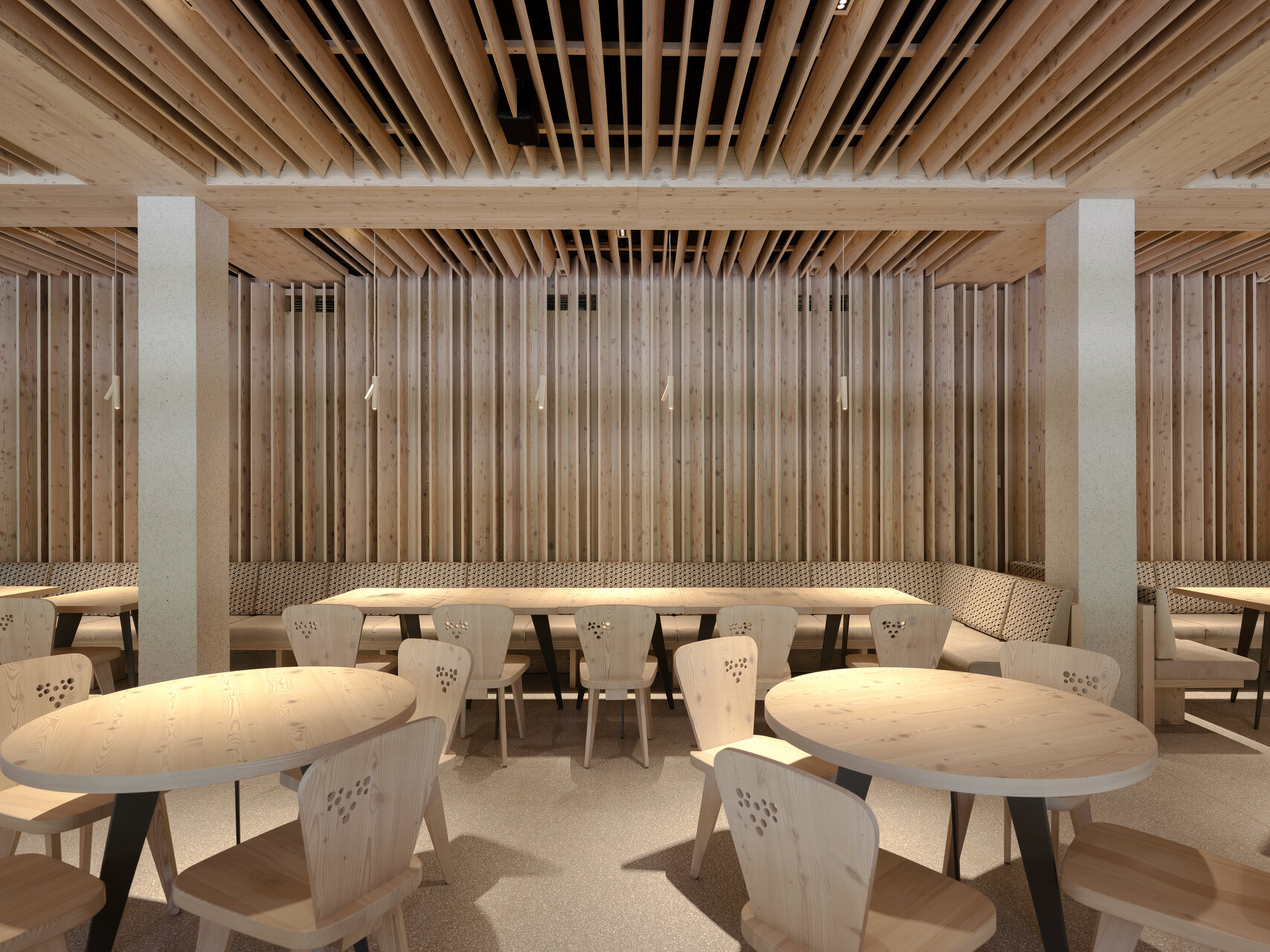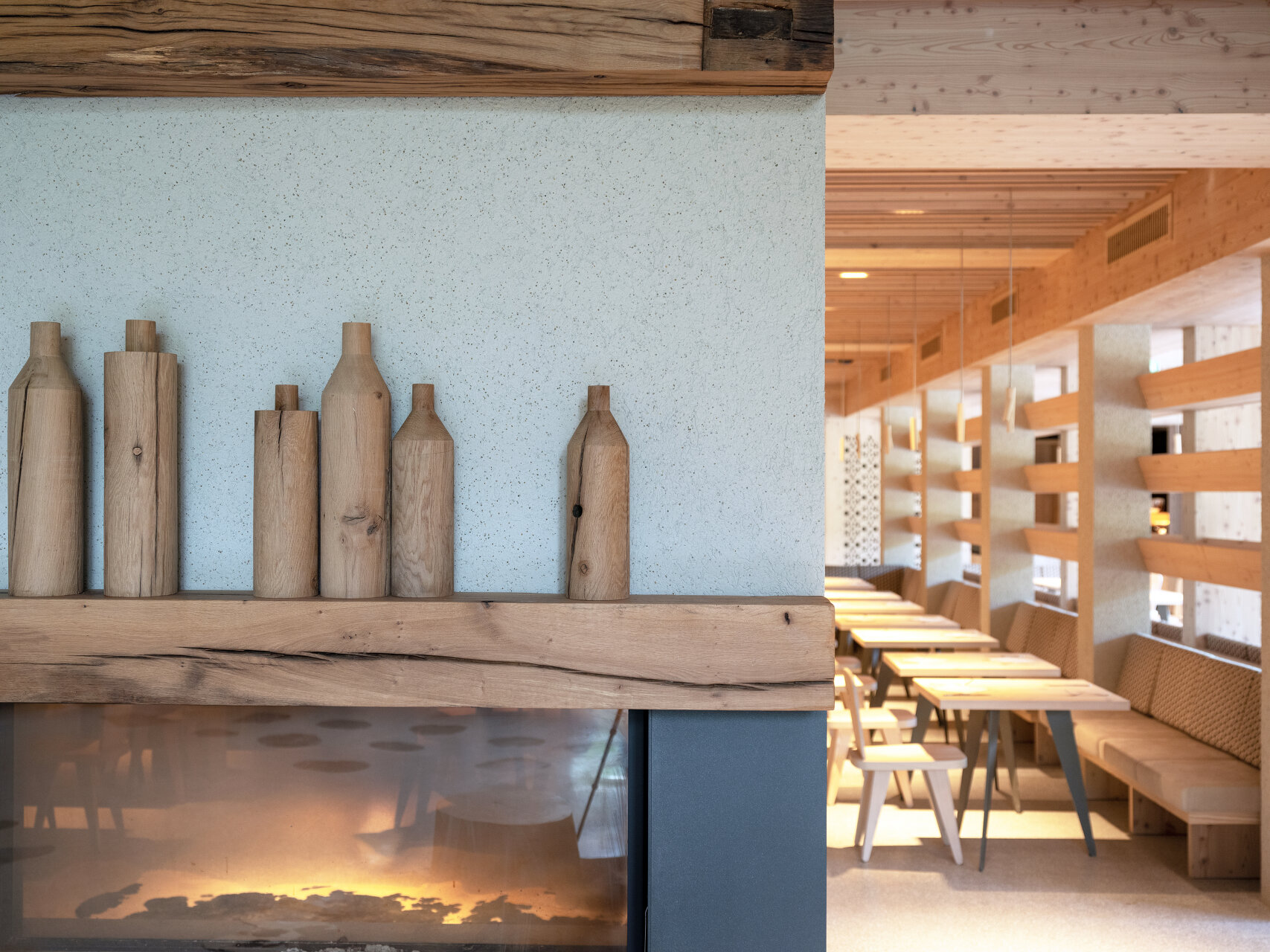 Stühle, Bänke, Polster, Vorhänge und an Äste erinnernde Leuchten wurden eigens für das Hotel entworfen. Der Filz für die Sessel wurde aus recycelten Kunststoffflaschen gewonnen. Das Hauptmaterial für Wände, Möbel und Decken ist aber auch hier Lärchenholz. Die Terrazzoböden zeigen den hellen Grauton der felsigen Umgebung, Inkrustationen aus schwarzem slowenischem Stein weisen den Weg durch die Lobby und erinnern an den Hotelkater Mr. Max, der zu Beginn der Renovierungsarbeiten das Weite suchte und dort verblieb.