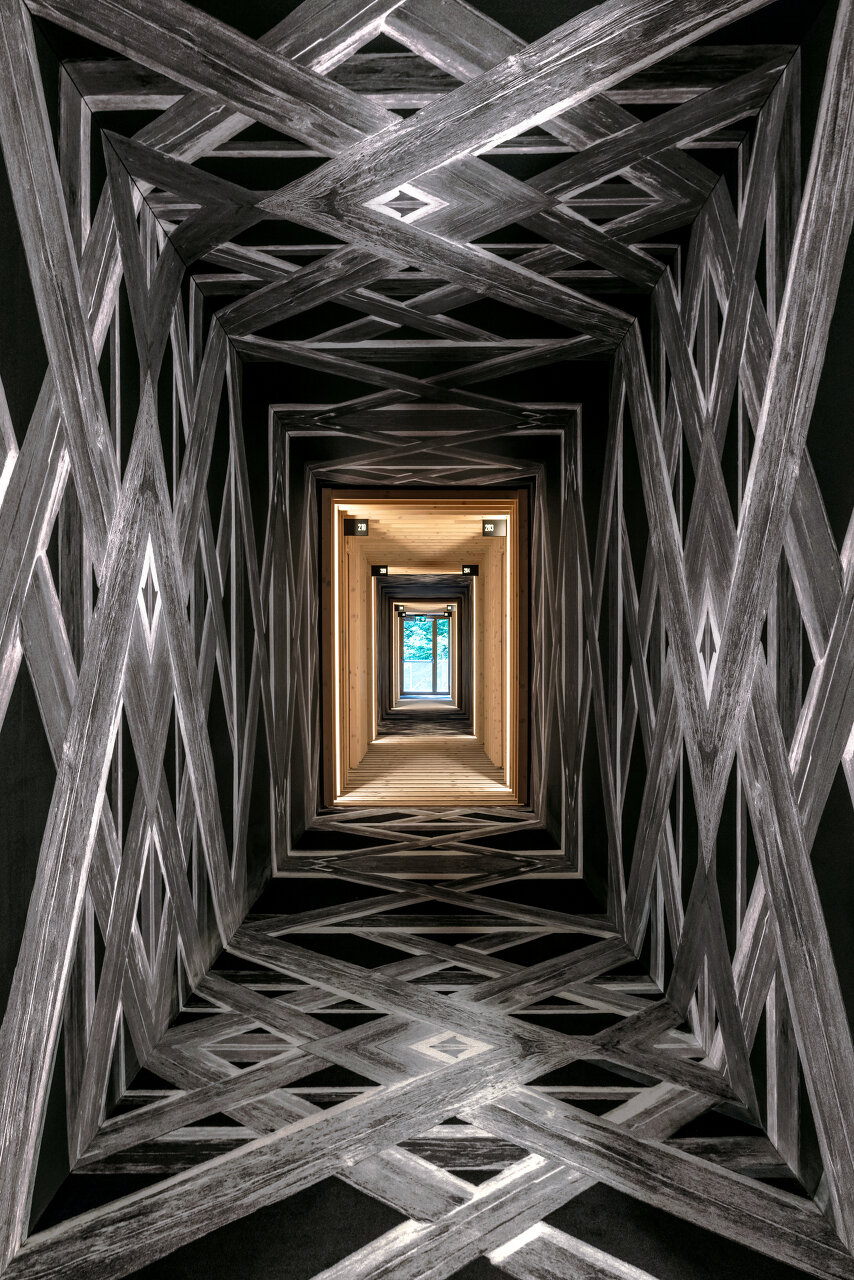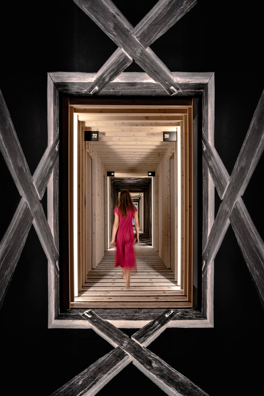 Auf dem Weg durchs Haus fordert die Gestaltung der Flure die Gäste heraus: Der stark geometrischen Gestaltung von Teppich, Wänden und Decke kann man sich kaum entziehen – es ist ein Gang durch die Konstruktion der „toplar“, jener typischen Heuharfen zu erleben, wie es sie nur in Slowenien gibt. Die Architekten verstehen dieses Design als Aufruf, sich dieses Kulturerbes bewusst zu werden, von dem jährlich einige vernachlässigte Exemplare unter ihrer eigenen Last zusammenbrechen.