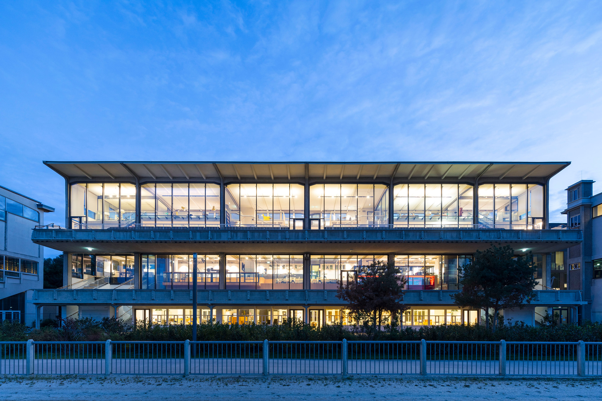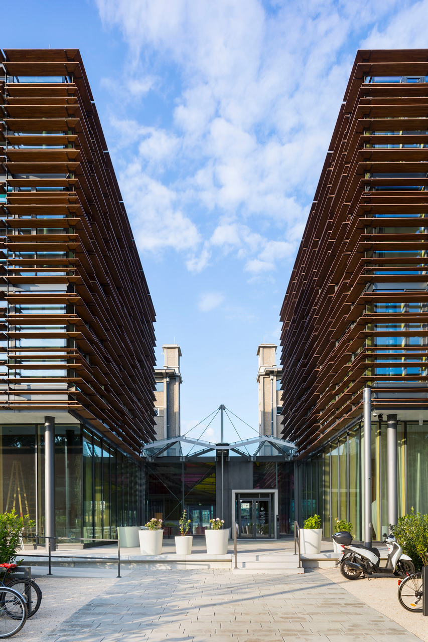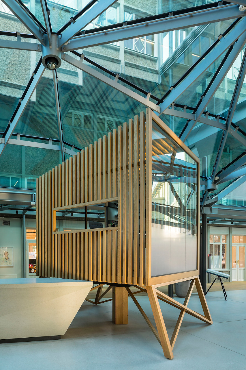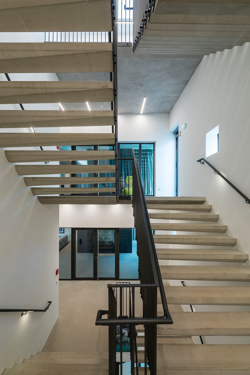Die hohe Detailqualität der unter ebenso hohen Auflagen des Denkmalschutzes sanierten Bestandsstrukturen gab das Maß für die Detaillösungen im Neubau vor, etwa für den fassadenbegleitenden Holzfries mit eingelassenen Bodenlichtlinien, die von unten die Sonnenschutzlamellen illuminieren, oder die Pfostenriegelfassade mit ihrer lediglich gehobelten Holz-Oberfläche, dazu die in die Treppenhauswände eingelassenen Beton-Fertigteilstufen und die individuell angepassten Tages- und Kunstlichtlösungen. (Autor: Achim Geissinger, nach einem Text der Architekten)